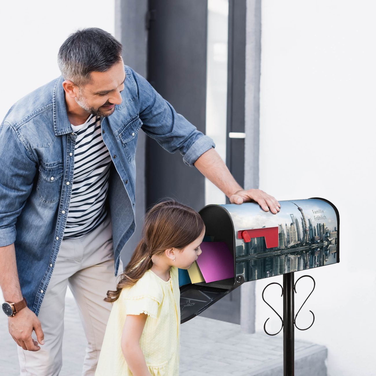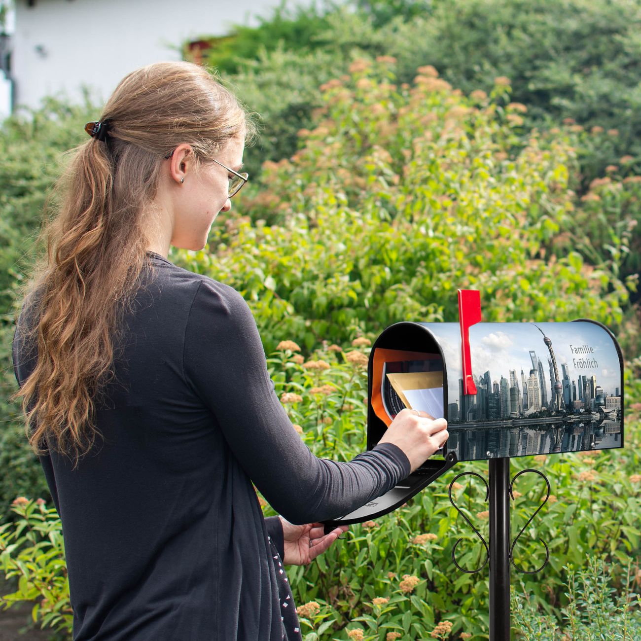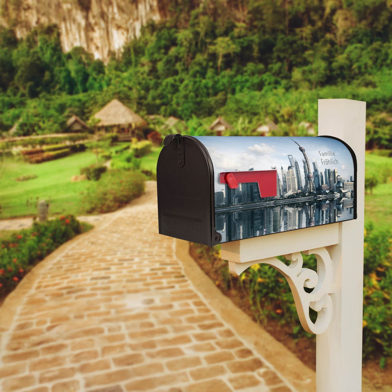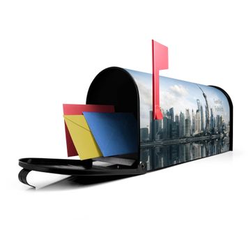 Der amerikanische Briefkasten von banjado mit Shanghai Motiv bietet Ihnen ausreichend Fassungsvermögen, um große A4 Sendungen und Zeitschriften zu empfangen. Die typisch amerikanische rote Fahne zeigt Ihnen an, wenn Sie Post erhalten haben. Die US-Mailbox besteht aus verzinktem Stahlblech welches lackiert wurde und ist 48 x 22 x 16 CM (BxHxT) groß. Die Folie mit Motiv Shanghai besteht aus einer wetter- und UV-resistenten Folie, die mit einem Schutzlaminat überzogen ist, sodass die US Mailbox zusätzlich vor Kratzern geschützt ist. An der Unterkante sind 4 Löcher je Seite um die Mailbox, typisch amerikanisch, an einem Holzpfahl oder einem Zaun zu befestigen. Auf Wunsch können Sie bei uns den passenden Standfuß oder die passende Wandhalterung kaufen um die US-Mailbox sicher zu befestigen. Wir bieten Ihnen ebenfalls Namensschilder, bereits beschriftet oder frei zu beschriften, und verschiedene selbst gestaltete Bitte-Keine-Werbung-Aufkleber.