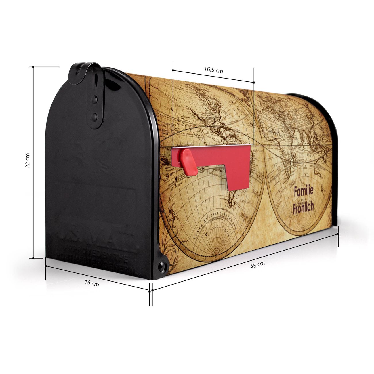 Der amerikanische Briefkasten von banjado mit Sieben Weltmeere Motiv bietet Ihnen ausreichend Fassungsvermögen, um große A4 Sendungen und Zeitschriften zu empfangen. Die typisch amerikanische rote Fahne zeigt Ihnen an, wenn Sie Post erhalten haben. Die US-Mailbox besteht aus verzinktem Stahlblech welches lackiert wurde und ist 48 x 22 x 16 CM (BxHxT) groß. Die Folie mit Motiv Sieben Weltmeere besteht aus einer wetter- und UV-resistenten Folie, die mit einem Schutzlaminat überzogen ist, sodass die US Mailbox zusätzlich vor Kratzern geschützt ist. An der Unterkante sind 4 Löcher je Seite um die Mailbox, typisch amerikanisch, an einem Holzpfahl oder einem Zaun zu befestigen. Auf Wunsch können Sie bei uns den passenden Standfuß oder die passende Wandhalterung kaufen um die US-Mailbox sicher zu befestigen. Wir bieten Ihnen ebenfalls Namensschilder, bereits beschriftet oder frei zu beschriften, und verschiedene selbst gestaltete Bitte-Keine-Werbung-Aufkleber.