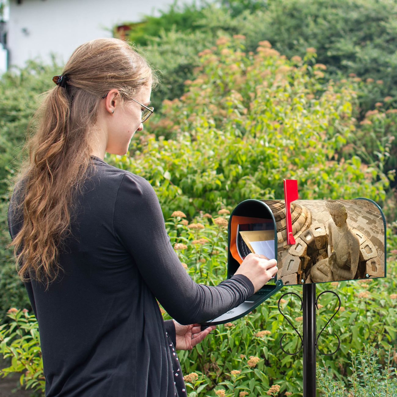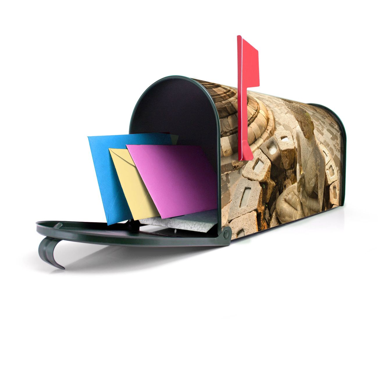 Unser amerikanischer Briefkasten mit dem Motiv Sitzender Buddha hat ein sehr ansprechendes und ausgefallenes Design, ist in der Grundfarbe weiß, grün oder schwarz erhältlich. Damit entlocken Sie Ihren Nachbarn und dem Postboten immer wieder ein Lächeln. Die Mailbox ist ein Original Import aus Mississippi USA und wird von unserer kleinen Manufaktur in Sachsen von Hand veredelt. Die US-Mailbox bietet ausreichend Platz auch für große Sendungen, eine Fahne die Ihnen Post anzeigt, wetterfestes und äußerst stabiles Material - so macht Post empfangen Freude.