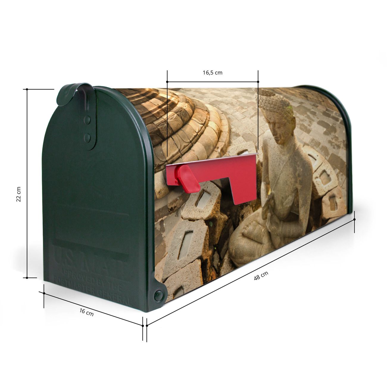 Der amerikanische Briefkasten von banjado mit Sitzender Buddha Motiv bietet Ihnen ausreichend Fassungsvermögen, um große A4 Sendungen und Zeitschriften zu empfangen. Die typisch amerikanische rote Fahne zeigt Ihnen an, wenn Sie Post erhalten haben. Die US-Mailbox besteht aus verzinktem Stahlblech welches lackiert wurde und ist 48 x 22 x 16 CM (BxHxT) groß. Die Folie mit Motiv Sitzender Buddha besteht aus einer wetter- und UV-resistenten Folie, die mit einem Schutzlaminat überzogen ist, sodass die US Mailbox zusätzlich vor Kratzern geschützt ist. An der Unterkante sind 4 Löcher je Seite um die Mailbox, typisch amerikanisch, an einem Holzpfahl oder einem Zaun zu befestigen. Auf Wunsch können Sie bei uns den passenden Standfuß oder die passende Wandhalterung kaufen um die US-Mailbox sicher zu befestigen. Wir bieten Ihnen ebenfalls Namensschilder, bereits beschriftet oder frei zu beschriften, und verschiedene selbst gestaltete Bitte-Keine-Werbung-Aufkleber.