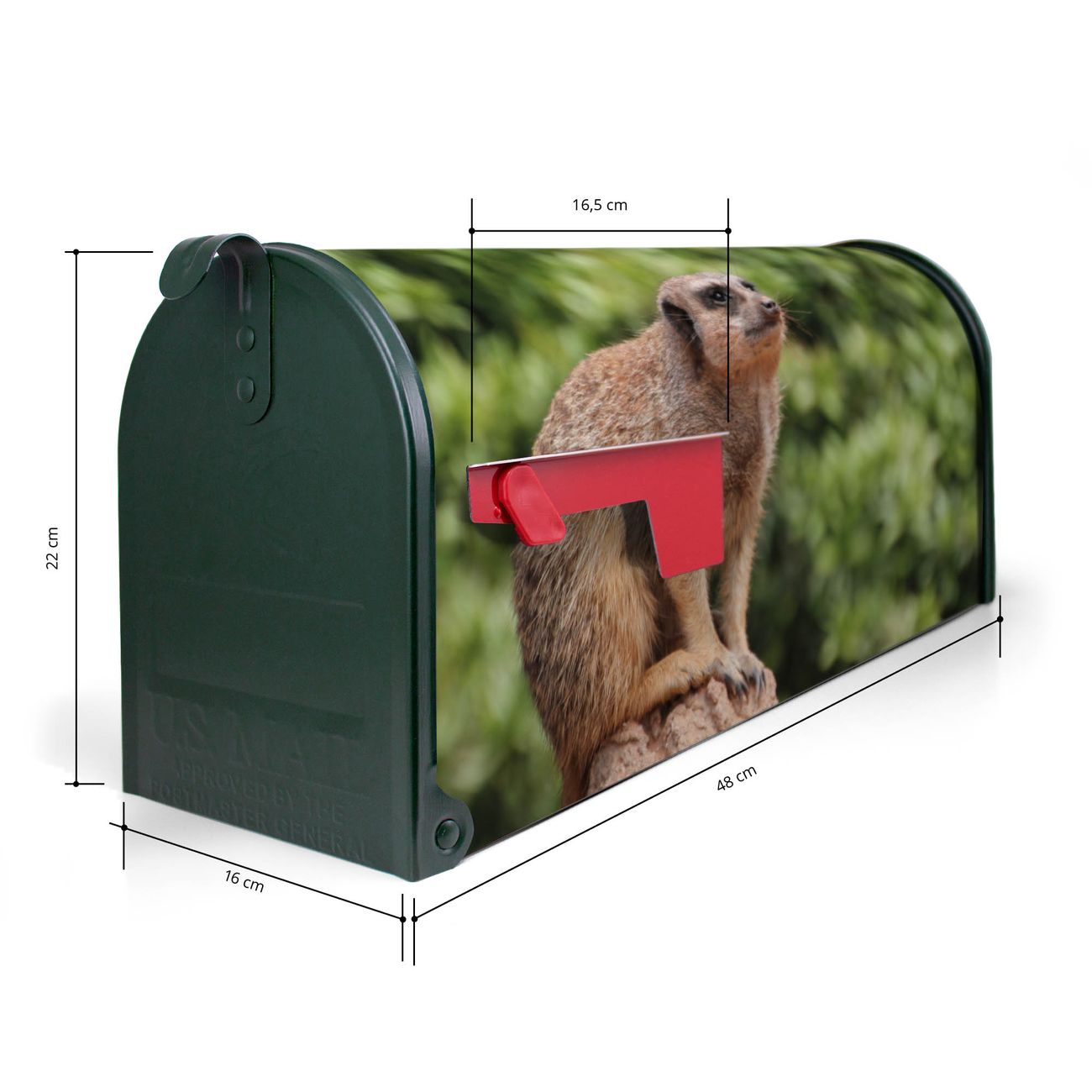 Der amerikanische Briefkasten von banjado mit Sitzendes Erdmännchen Motiv bietet Ihnen ausreichend Fassungsvermögen, um große A4 Sendungen und Zeitschriften zu empfangen. Die typisch amerikanische rote Fahne zeigt Ihnen an, wenn Sie Post erhalten haben. Die US-Mailbox besteht aus verzinktem Stahlblech welches lackiert wurde und ist 48 x 22 x 16 CM (BxHxT) groß. Die Folie mit Motiv Sitzendes Erdmännchen besteht aus einer wetter- und UV-resistenten Folie, die mit einem Schutzlaminat überzogen ist, sodass die US Mailbox zusätzlich vor Kratzern geschützt ist. An der Unterkante sind 4 Löcher je Seite um die Mailbox, typisch amerikanisch, an einem Holzpfahl oder einem Zaun zu befestigen. Auf Wunsch können Sie bei uns den passenden Standfuß oder die passende Wandhalterung kaufen um die US-Mailbox sicher zu befestigen. Wir bieten Ihnen ebenfalls Namensschilder, bereits beschriftet oder frei zu beschriften, und verschiedene selbst gestaltete Bitte-Keine-Werbung-Aufkleber.