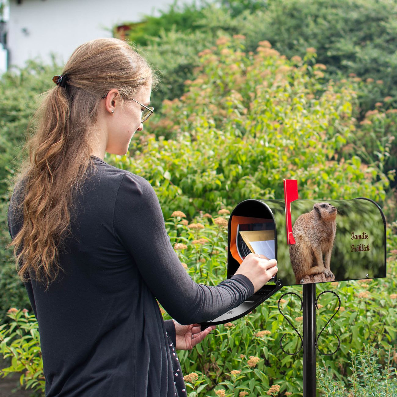 Unser amerikanischer Briefkasten mit dem Motiv Sitzendes Erdmännchen hat ein sehr ansprechendes und ausgefallenes Design, ist in der Grundfarbe weiß, grün oder schwarz erhältlich. Damit entlocken Sie Ihren Nachbarn und dem Postboten immer wieder ein Lächeln. Die Mailbox ist ein Original Import aus Mississippi USA und wird von unserer kleinen Manufaktur in Sachsen von Hand veredelt. Die US-Mailbox bietet ausreichend Platz auch für große Sendungen, eine Fahne die Ihnen Post anzeigt, wetterfestes und äußerst stabiles Material - so macht Post empfangen Freude.