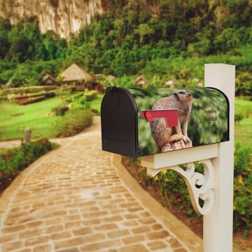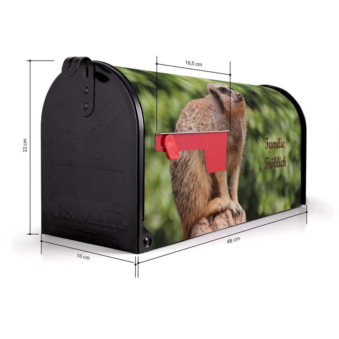 Der amerikanische Briefkasten von banjado mit Sitzendes Erdmännchen Motiv bietet Ihnen ausreichend Fassungsvermögen, um große A4 Sendungen und Zeitschriften zu empfangen. Die typisch amerikanische rote Fahne zeigt Ihnen an, wenn Sie Post erhalten haben. Die US-Mailbox besteht aus verzinktem Stahlblech welches lackiert wurde und ist 48 x 22 x 16 CM (BxHxT) groß. Die Folie mit Motiv Sitzendes Erdmännchen besteht aus einer wetter- und UV-resistenten Folie, die mit einem Schutzlaminat überzogen ist, sodass die US Mailbox zusätzlich vor Kratzern geschützt ist. An der Unterkante sind 4 Löcher je Seite um die Mailbox, typisch amerikanisch, an einem Holzpfahl oder einem Zaun zu befestigen. Auf Wunsch können Sie bei uns den passenden Standfuß oder die passende Wandhalterung kaufen um die US-Mailbox sicher zu befestigen. Wir bieten Ihnen ebenfalls Namensschilder, bereits beschriftet oder frei zu beschriften, und verschiedene selbst gestaltete Bitte-Keine-Werbung-Aufkleber.