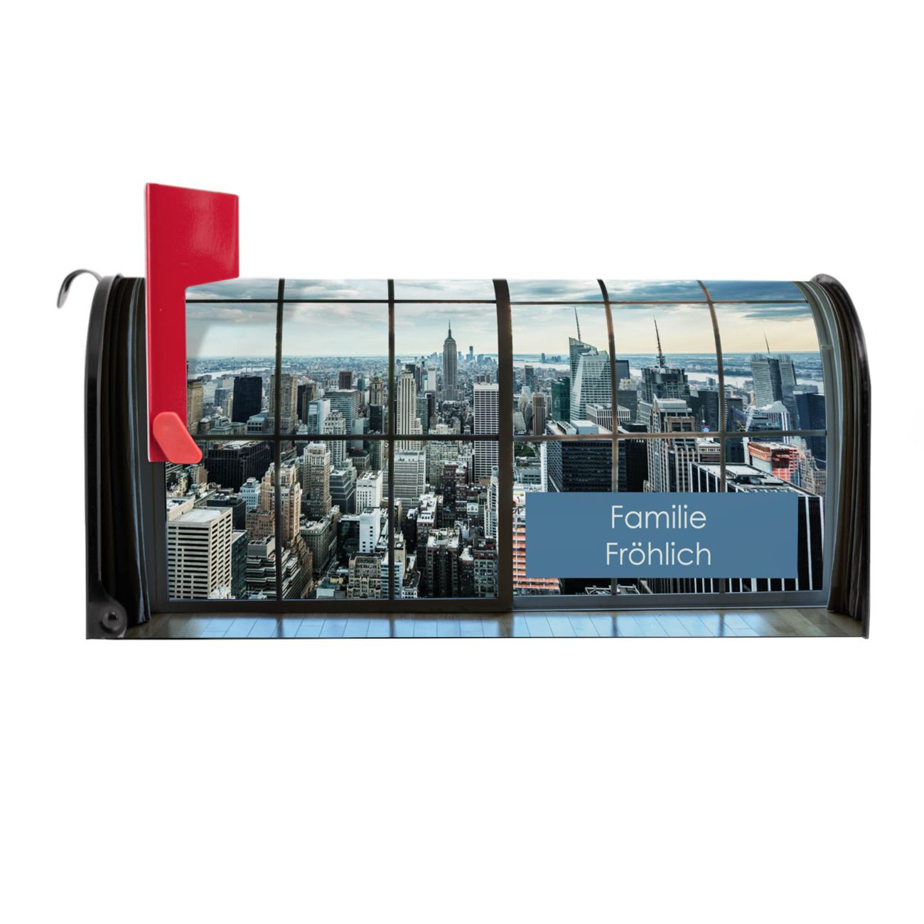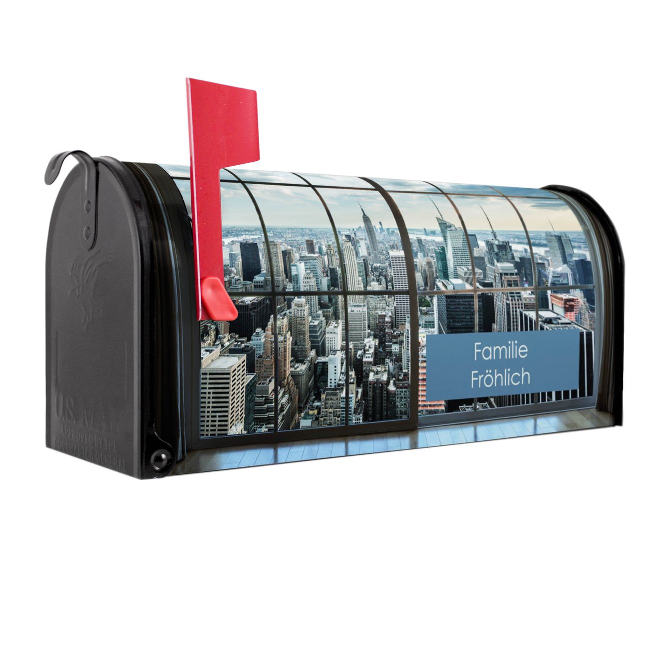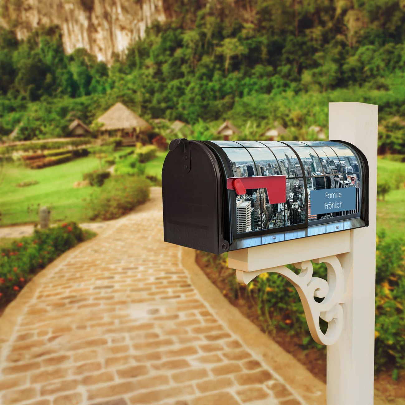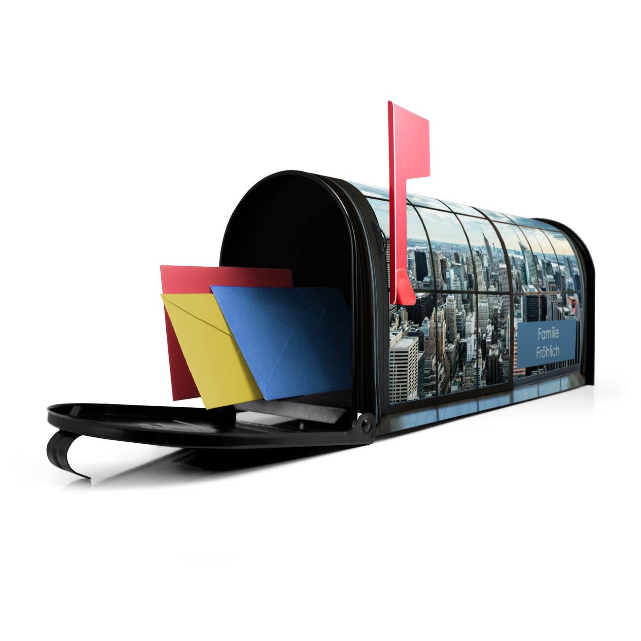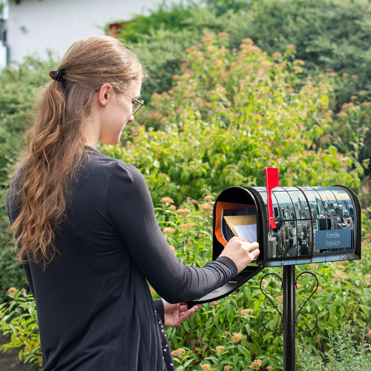Der amerikanische Briefkasten von banjado mit Skyline Manhattan Motiv bietet Ihnen ausreichend Fassungsvermögen, um große A4 Sendungen und Zeitschriften zu empfangen. Die typisch amerikanische rote Fahne zeigt Ihnen an, wenn Sie Post erhalten haben. Die US-Mailbox besteht aus verzinktem Stahlblech welches lackiert wurde und ist 48 x 22 x 16 CM (BxHxT) groß. Die Folie mit Motiv Skyline Manhattan besteht aus einer wetter- und UV-resistenten Folie, die mit einem Schutzlaminat überzogen ist, sodass die US Mailbox zusätzlich vor Kratzern geschützt ist. An der Unterkante sind 4 Löcher je Seite um die Mailbox, typisch amerikanisch, an einem Holzpfahl oder einem Zaun zu befestigen. Auf Wunsch können Sie bei uns den passenden Standfuß oder die passende Wandhalterung kaufen um die US-Mailbox sicher zu befestigen. Wir bieten Ihnen ebenfalls Namensschilder, bereits beschriftet oder frei zu beschriften, und verschiedene selbst gestaltete Bitte-Keine-Werbung-Aufkleber.