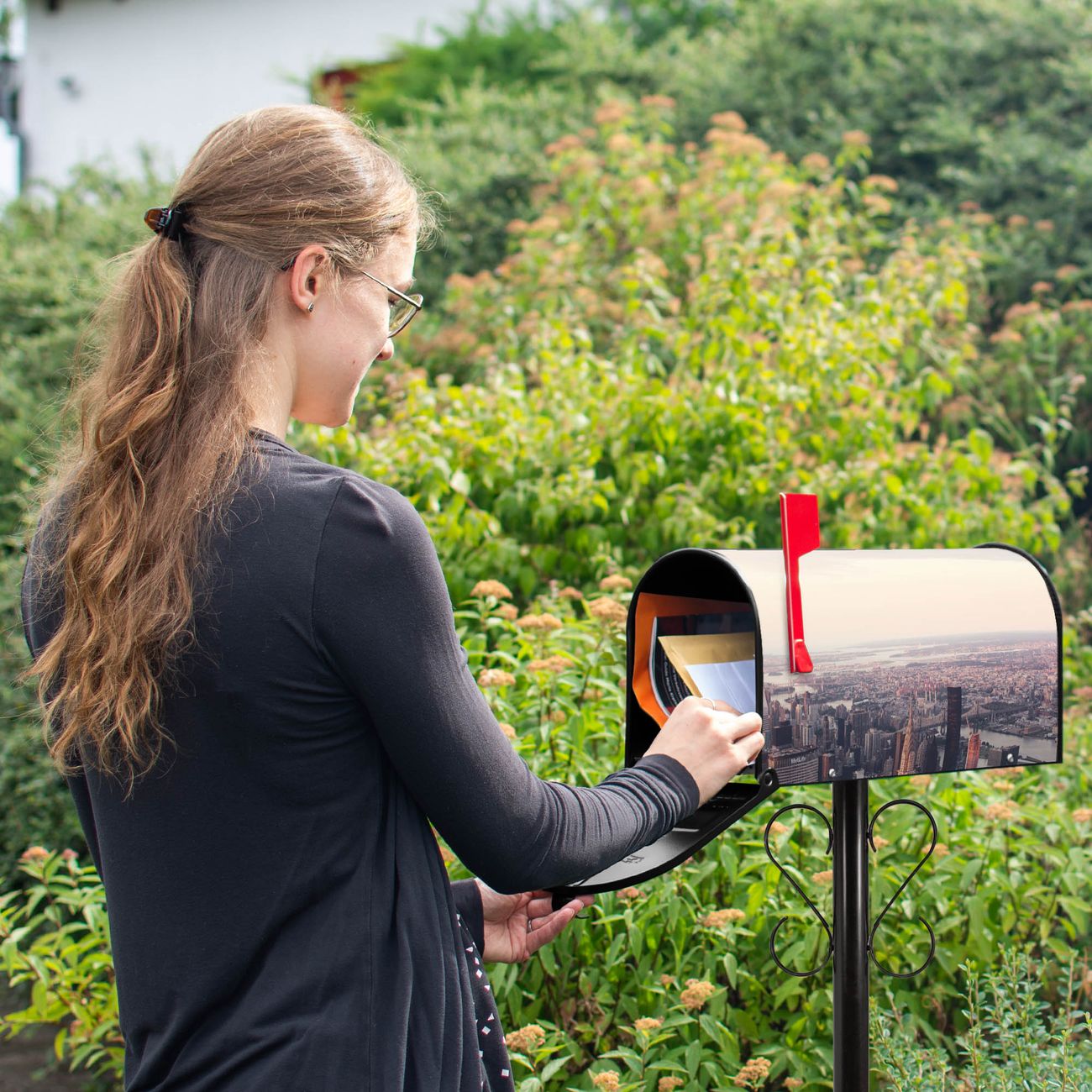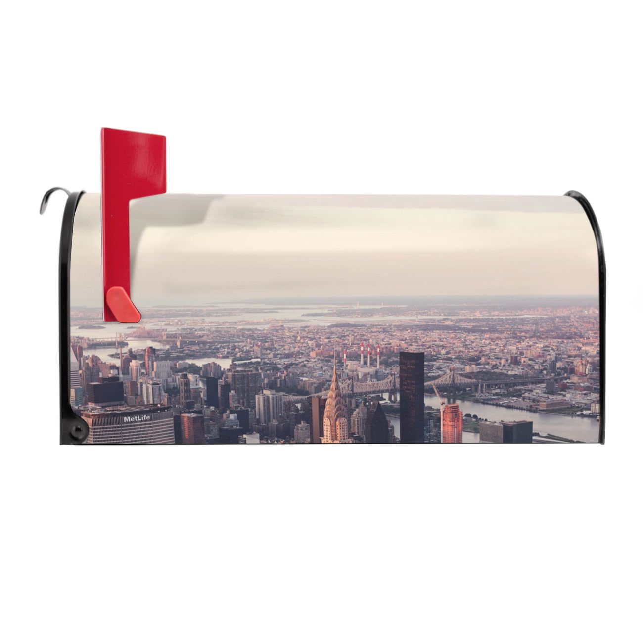 Der amerikanische Briefkasten von banjado mit Skyline Motiv bietet Ihnen ausreichend Fassungsvermögen, um große A4 Sendungen und Zeitschriften zu empfangen. Die typisch amerikanische rote Fahne zeigt Ihnen an, wenn Sie Post erhalten haben. Die US-Mailbox besteht aus verzinktem Stahlblech welches lackiert wurde und ist 48 x 22 x 16 CM (BxHxT) groß. Die Folie mit Motiv Skyline besteht aus einer wetter- und UV-resistenten Folie, die mit einem Schutzlaminat überzogen ist, sodass die US Mailbox zusätzlich vor Kratzern geschützt ist. An der Unterkante sind 4 Löcher je Seite um die Mailbox, typisch amerikanisch, an einem Holzpfahl oder einem Zaun zu befestigen. Auf Wunsch können Sie bei uns den passenden Standfuß oder die passende Wandhalterung kaufen um die US-Mailbox sicher zu befestigen. Wir bieten Ihnen ebenfalls Namensschilder, bereits beschriftet oder frei zu beschriften, und verschiedene selbst gestaltete Bitte-Keine-Werbung-Aufkleber.