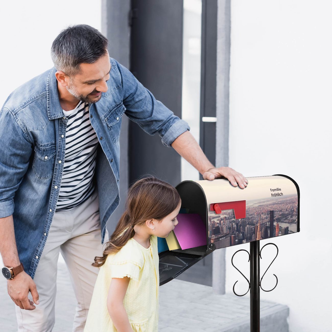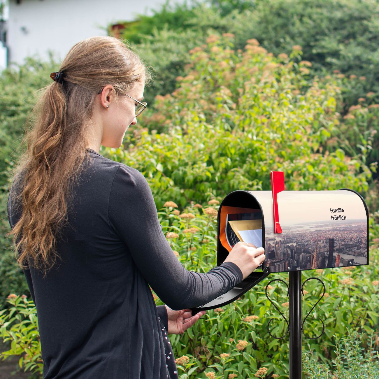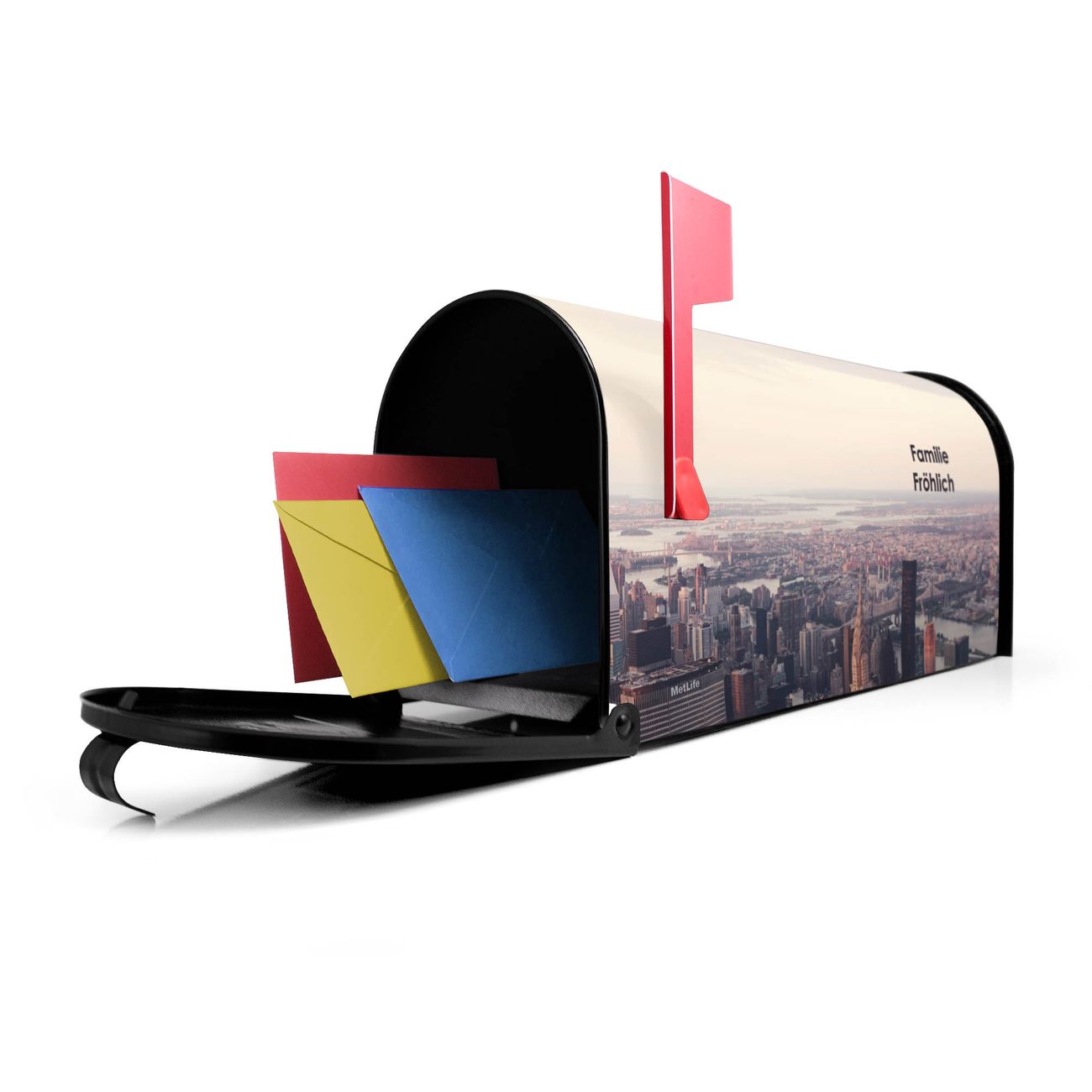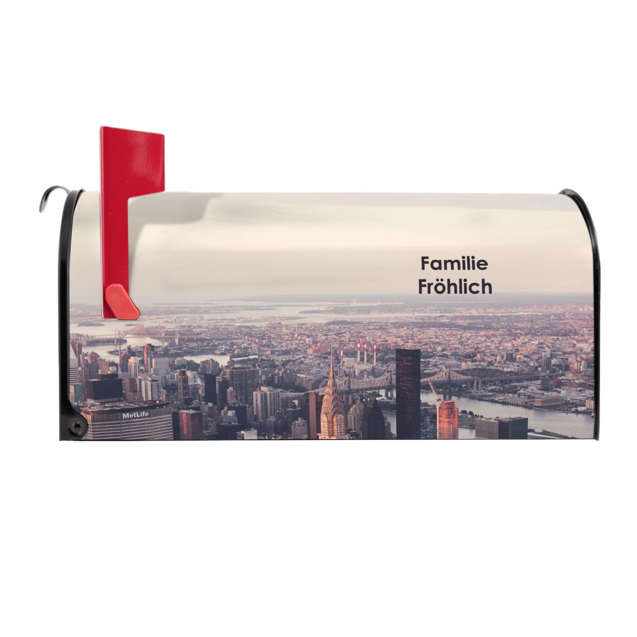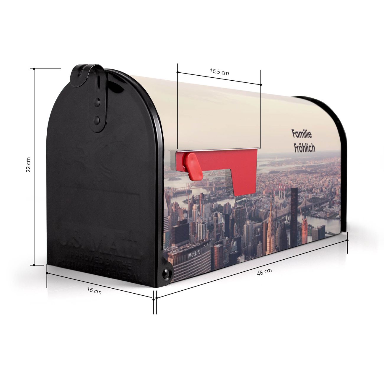 Der amerikanische Briefkasten von banjado mit Skyline Motiv bietet Ihnen ausreichend Fassungsvermögen, um große A4 Sendungen und Zeitschriften zu empfangen. Die typisch amerikanische rote Fahne zeigt Ihnen an, wenn Sie Post erhalten haben. Die US-Mailbox besteht aus verzinktem Stahlblech welches lackiert wurde und ist 48 x 22 x 16 CM (BxHxT) groß. Die Folie mit Motiv Skyline besteht aus einer wetter- und UV-resistenten Folie, die mit einem Schutzlaminat überzogen ist, sodass die US Mailbox zusätzlich vor Kratzern geschützt ist. An der Unterkante sind 4 Löcher je Seite um die Mailbox, typisch amerikanisch, an einem Holzpfahl oder einem Zaun zu befestigen. Auf Wunsch können Sie bei uns den passenden Standfuß oder die passende Wandhalterung kaufen um die US-Mailbox sicher zu befestigen. Wir bieten Ihnen ebenfalls Namensschilder, bereits beschriftet oder frei zu beschriften, und verschiedene selbst gestaltete Bitte-Keine-Werbung-Aufkleber.