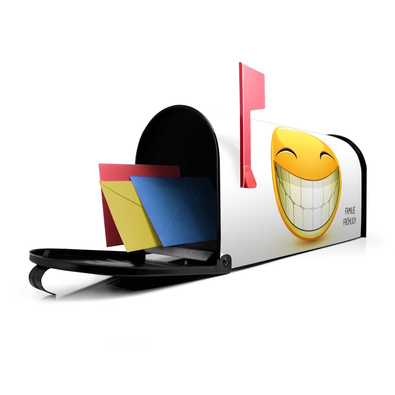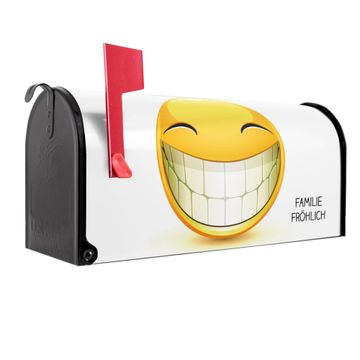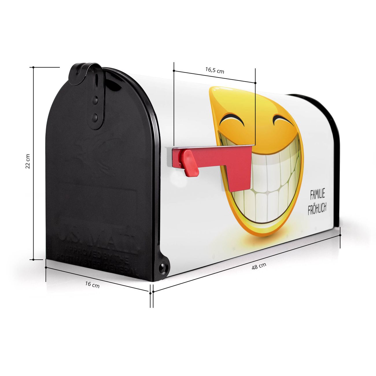 Der amerikanische Briefkasten von banjado mit Smile Motiv bietet Ihnen ausreichend Fassungsvermögen, um große A4 Sendungen und Zeitschriften zu empfangen. Die typisch amerikanische rote Fahne zeigt Ihnen an, wenn Sie Post erhalten haben. Die US-Mailbox besteht aus verzinktem Stahlblech welches lackiert wurde und ist 48 x 22 x 16 CM (BxHxT) groß. Die Folie mit Motiv Smile besteht aus einer wetter- und UV-resistenten Folie, die mit einem Schutzlaminat überzogen ist, sodass die US Mailbox zusätzlich vor Kratzern geschützt ist. An der Unterkante sind 4 Löcher je Seite um die Mailbox, typisch amerikanisch, an einem Holzpfahl oder einem Zaun zu befestigen. Auf Wunsch können Sie bei uns den passenden Standfuß oder die passende Wandhalterung kaufen um die US-Mailbox sicher zu befestigen. Wir bieten Ihnen ebenfalls Namensschilder, bereits beschriftet oder frei zu beschriften, und verschiedene selbst gestaltete Bitte-Keine-Werbung-Aufkleber.