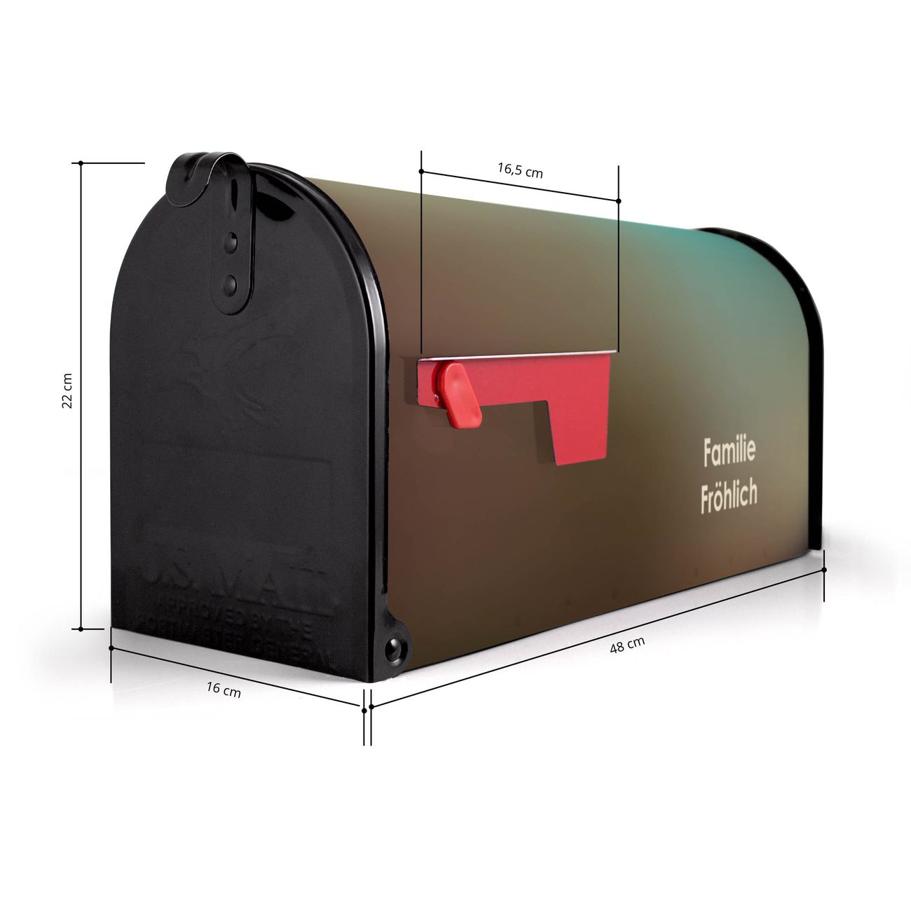 Der amerikanische Briefkasten von banjado mit Sommer Heart Motiv bietet Ihnen ausreichend Fassungsvermögen, um große A4 Sendungen und Zeitschriften zu empfangen. Die typisch amerikanische rote Fahne zeigt Ihnen an, wenn Sie Post erhalten haben. Die US-Mailbox besteht aus verzinktem Stahlblech welches lackiert wurde und ist 48 x 22 x 16 CM (BxHxT) groß. Die Folie mit Motiv Sommer Heart besteht aus einer wetter- und UV-resistenten Folie, die mit einem Schutzlaminat überzogen ist, sodass die US Mailbox zusätzlich vor Kratzern geschützt ist. An der Unterkante sind 4 Löcher je Seite um die Mailbox, typisch amerikanisch, an einem Holzpfahl oder einem Zaun zu befestigen. Auf Wunsch können Sie bei uns den passenden Standfuß oder die passende Wandhalterung kaufen um die US-Mailbox sicher zu befestigen. Wir bieten Ihnen ebenfalls Namensschilder, bereits beschriftet oder frei zu beschriften, und verschiedene selbst gestaltete Bitte-Keine-Werbung-Aufkleber.