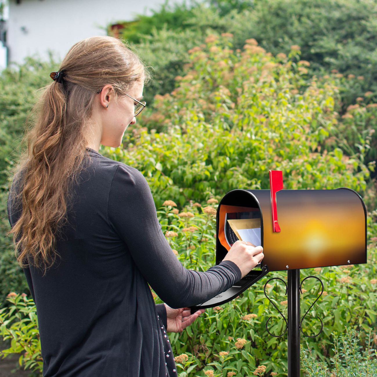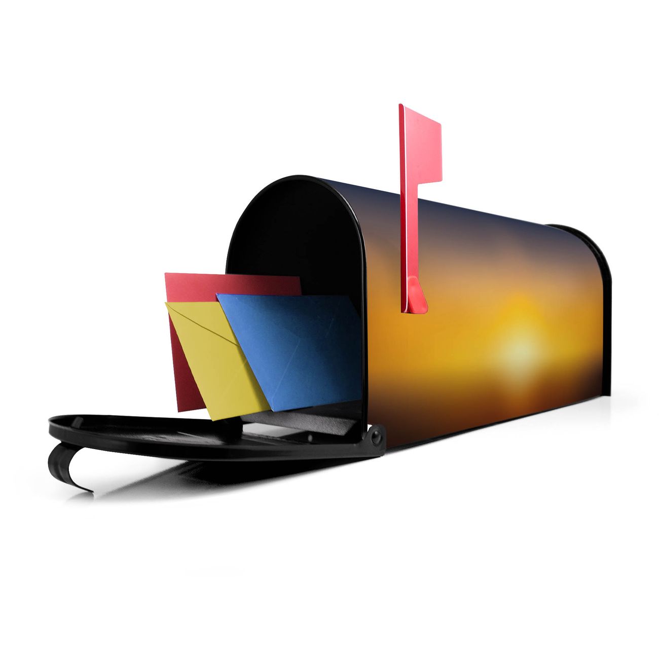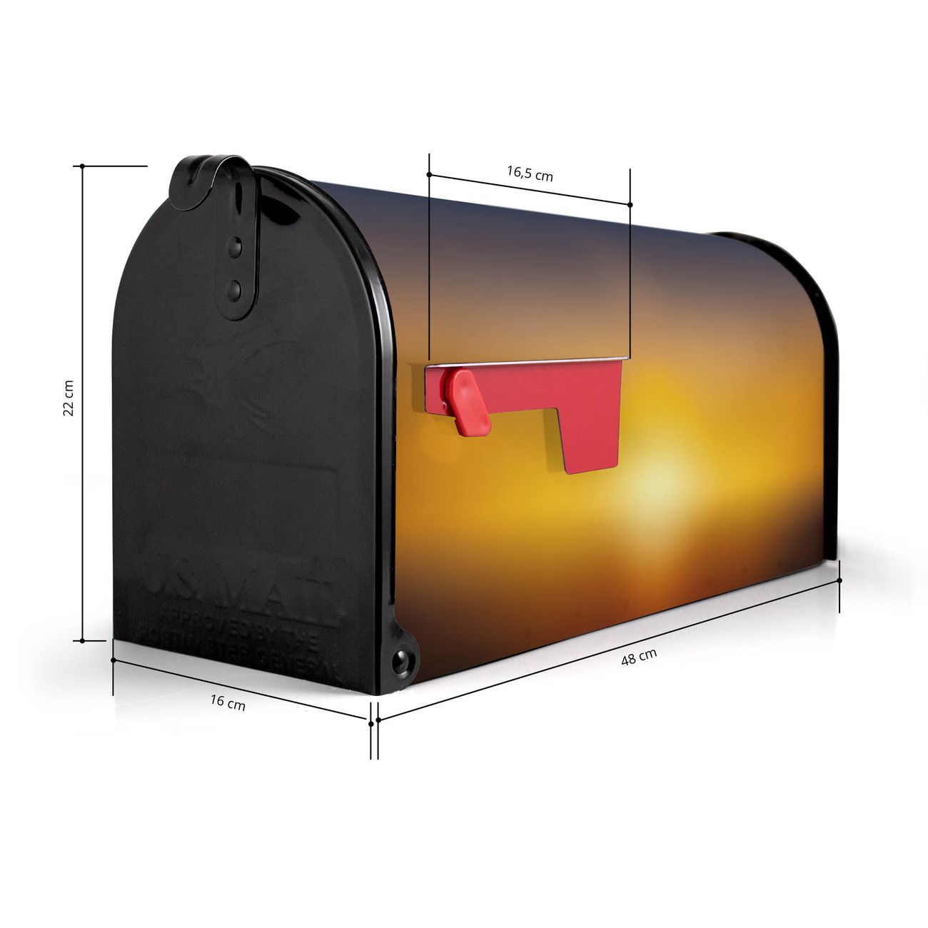 Der amerikanische Briefkasten von banjado mit Sommer Night Motiv bietet Ihnen ausreichend Fassungsvermögen, um große A4 Sendungen und Zeitschriften zu empfangen. Die typisch amerikanische rote Fahne zeigt Ihnen an, wenn Sie Post erhalten haben. Die US-Mailbox besteht aus verzinktem Stahlblech welches lackiert wurde und ist 48 x 22 x 16 CM (BxHxT) groß. Die Folie mit Motiv Sommer Night besteht aus einer wetter- und UV-resistenten Folie, die mit einem Schutzlaminat überzogen ist, sodass die US Mailbox zusätzlich vor Kratzern geschützt ist. An der Unterkante sind 4 Löcher je Seite um die Mailbox, typisch amerikanisch, an einem Holzpfahl oder einem Zaun zu befestigen. Auf Wunsch können Sie bei uns den passenden Standfuß oder die passende Wandhalterung kaufen um die US-Mailbox sicher zu befestigen. Wir bieten Ihnen ebenfalls Namensschilder, bereits beschriftet oder frei zu beschriften, und verschiedene selbst gestaltete Bitte-Keine-Werbung-Aufkleber.