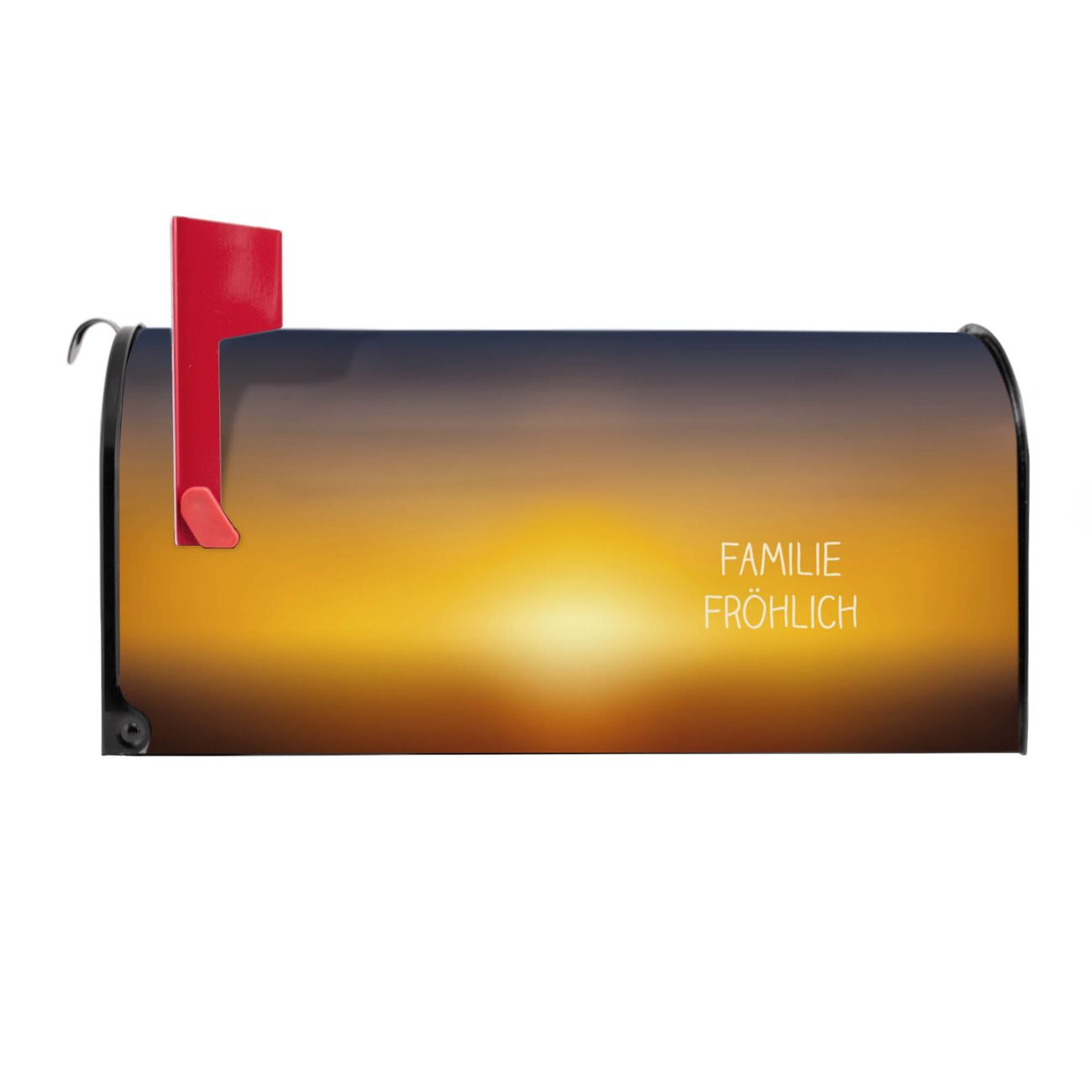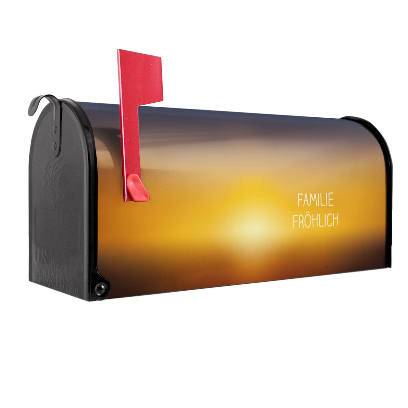 Der amerikanische Briefkasten von banjado mit Sommer Night Motiv bietet Ihnen ausreichend Fassungsvermögen, um große A4 Sendungen und Zeitschriften zu empfangen. Die typisch amerikanische rote Fahne zeigt Ihnen an, wenn Sie Post erhalten haben. Die US-Mailbox besteht aus verzinktem Stahlblech welches lackiert wurde und ist 48 x 22 x 16 CM (BxHxT) groß. Die Folie mit Motiv Sommer Night besteht aus einer wetter- und UV-resistenten Folie, die mit einem Schutzlaminat überzogen ist, sodass die US Mailbox zusätzlich vor Kratzern geschützt ist. An der Unterkante sind 4 Löcher je Seite um die Mailbox, typisch amerikanisch, an einem Holzpfahl oder einem Zaun zu befestigen. Auf Wunsch können Sie bei uns den passenden Standfuß oder die passende Wandhalterung kaufen um die US-Mailbox sicher zu befestigen. Wir bieten Ihnen ebenfalls Namensschilder, bereits beschriftet oder frei zu beschriften, und verschiedene selbst gestaltete Bitte-Keine-Werbung-Aufkleber.