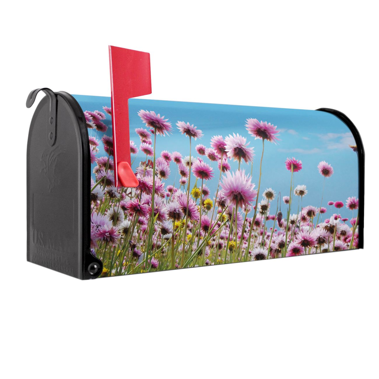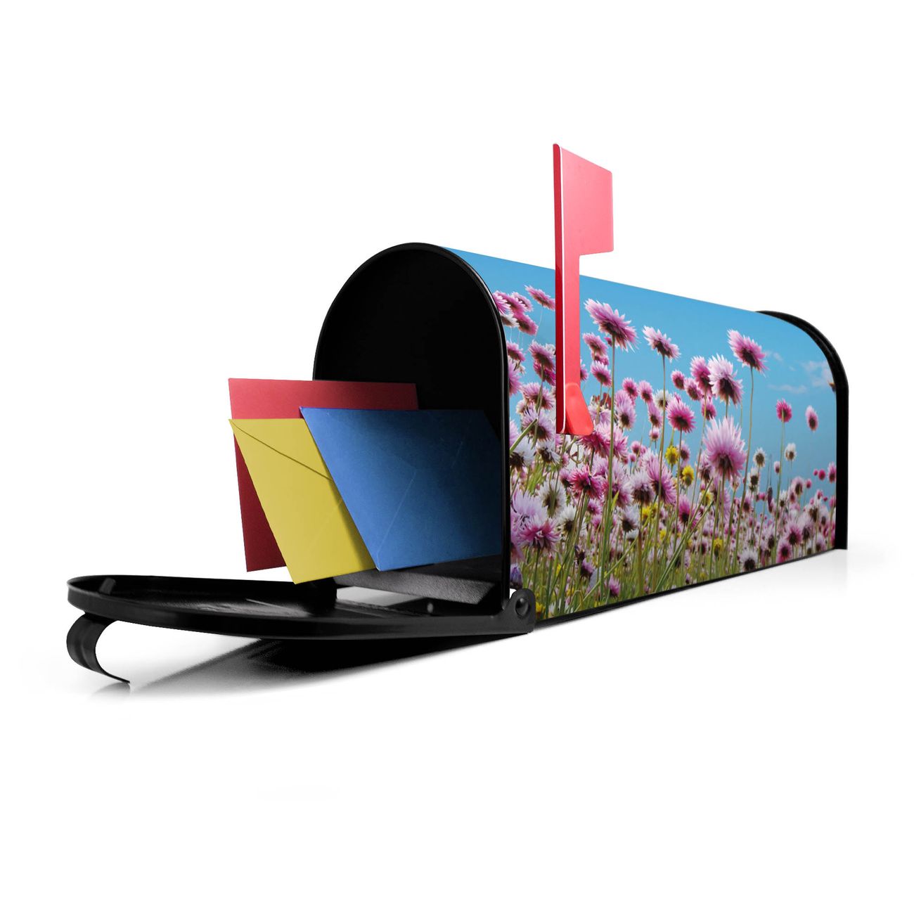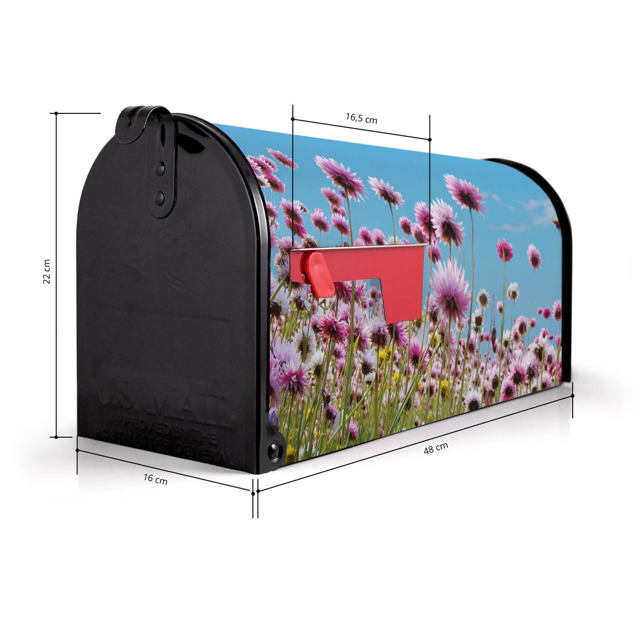 Der amerikanische Briefkasten von banjado mit Sommerblumen Motiv bietet Ihnen ausreichend Fassungsvermögen, um große A4 Sendungen und Zeitschriften zu empfangen. Die typisch amerikanische rote Fahne zeigt Ihnen an, wenn Sie Post erhalten haben. Die US-Mailbox besteht aus verzinktem Stahlblech welches lackiert wurde und ist 48 x 22 x 16 CM (BxHxT) groß. Die Folie mit Motiv Sommerblumen besteht aus einer wetter- und UV-resistenten Folie, die mit einem Schutzlaminat überzogen ist, sodass die US Mailbox zusätzlich vor Kratzern geschützt ist. An der Unterkante sind 4 Löcher je Seite um die Mailbox, typisch amerikanisch, an einem Holzpfahl oder einem Zaun zu befestigen. Auf Wunsch können Sie bei uns den passenden Standfuß oder die passende Wandhalterung kaufen um die US-Mailbox sicher zu befestigen. Wir bieten Ihnen ebenfalls Namensschilder, bereits beschriftet oder frei zu beschriften, und verschiedene selbst gestaltete Bitte-Keine-Werbung-Aufkleber.