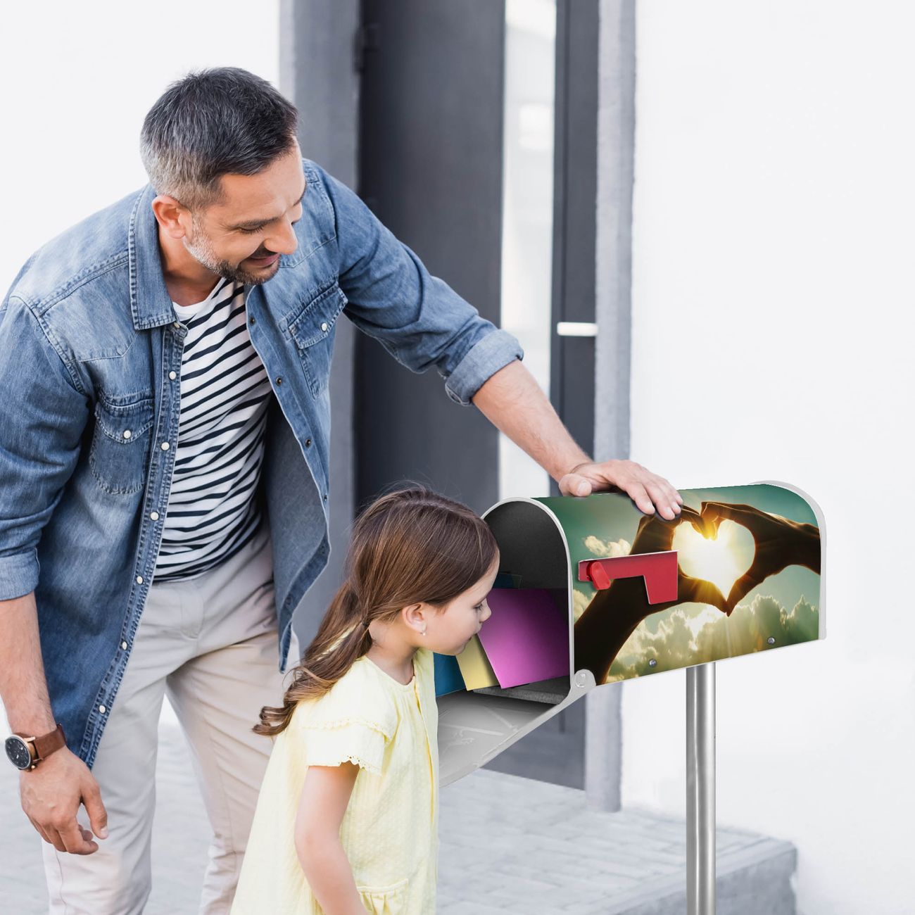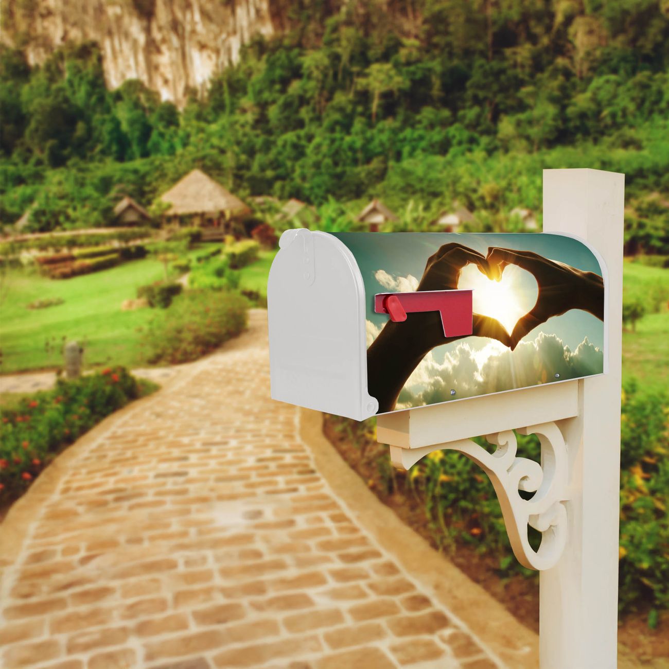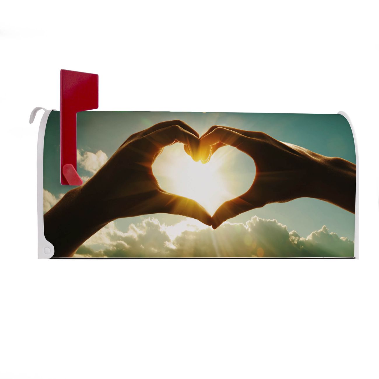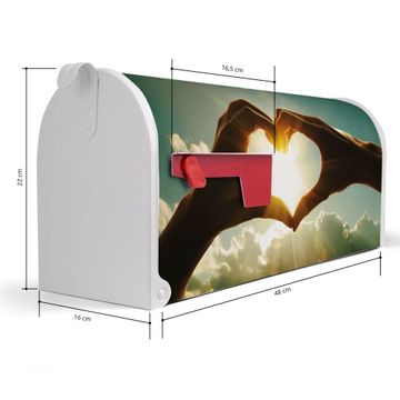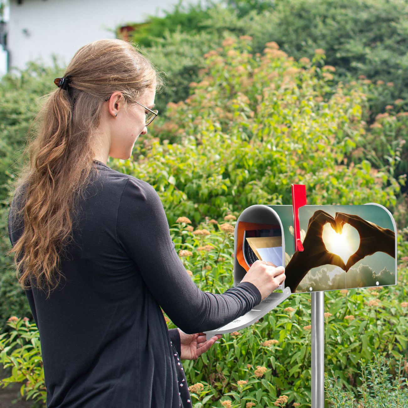 Der amerikanische Briefkasten von banjado mit Sonne im Herzen Motiv bietet Ihnen ausreichend Fassungsvermögen, um große A4 Sendungen und Zeitschriften zu empfangen. Die typisch amerikanische rote Fahne zeigt Ihnen an, wenn Sie Post erhalten haben. Die US-Mailbox besteht aus verzinktem Stahlblech welches lackiert wurde und ist 48 x 22 x 16 CM (BxHxT) groß. Die Folie mit Motiv Sonne im Herzen besteht aus einer wetter- und UV-resistenten Folie, die mit einem Schutzlaminat überzogen ist, sodass die US Mailbox zusätzlich vor Kratzern geschützt ist. An der Unterkante sind 4 Löcher je Seite um die Mailbox, typisch amerikanisch, an einem Holzpfahl oder einem Zaun zu befestigen. Auf Wunsch können Sie bei uns den passenden Standfuß oder die passende Wandhalterung kaufen um die US-Mailbox sicher zu befestigen. Wir bieten Ihnen ebenfalls Namensschilder, bereits beschriftet oder frei zu beschriften, und verschiedene selbst gestaltete Bitte-Keine-Werbung-Aufkleber.