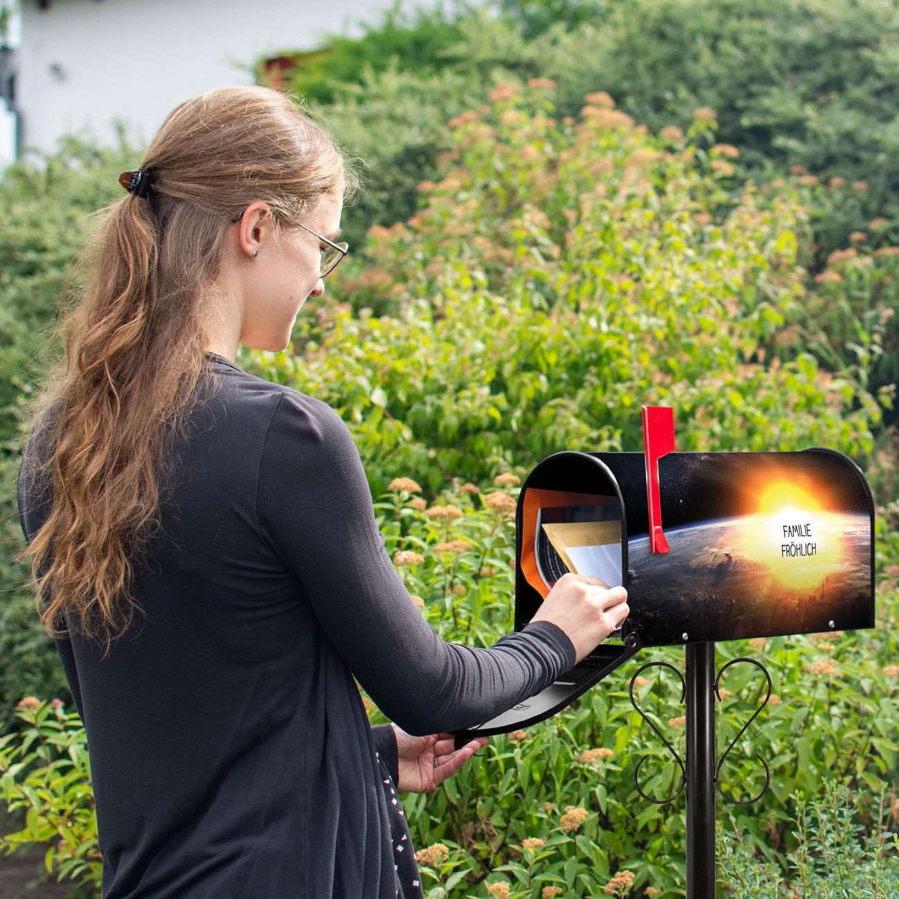 Unser amerikanischer Briefkasten mit dem Motiv Sonne im Weltall hat ein sehr ansprechendes und ausgefallenes Design, ist in der Grundfarbe weiß, grün oder schwarz erhältlich. Damit entlocken Sie Ihren Nachbarn und dem Postboten immer wieder ein Lächeln. Die Mailbox ist ein Original Import aus Mississippi USA und wird von unserer kleinen Manufaktur in Sachsen von Hand veredelt. Die US-Mailbox bietet ausreichend Platz auch für große Sendungen, eine Fahne die Ihnen Post anzeigt, wetterfestes und äußerst stabiles Material - so macht Post empfangen Freude.