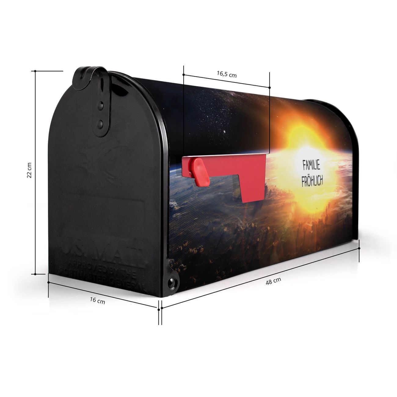 Der amerikanische Briefkasten von banjado mit Sonne im Weltall Motiv bietet Ihnen ausreichend Fassungsvermögen, um große A4 Sendungen und Zeitschriften zu empfangen. Die typisch amerikanische rote Fahne zeigt Ihnen an, wenn Sie Post erhalten haben. Die US-Mailbox besteht aus verzinktem Stahlblech welches lackiert wurde und ist 48 x 22 x 16 CM (BxHxT) groß. Die Folie mit Motiv Sonne im Weltall besteht aus einer wetter- und UV-resistenten Folie, die mit einem Schutzlaminat überzogen ist, sodass die US Mailbox zusätzlich vor Kratzern geschützt ist. An der Unterkante sind 4 Löcher je Seite um die Mailbox, typisch amerikanisch, an einem Holzpfahl oder einem Zaun zu befestigen. Auf Wunsch können Sie bei uns den passenden Standfuß oder die passende Wandhalterung kaufen um die US-Mailbox sicher zu befestigen. Wir bieten Ihnen ebenfalls Namensschilder, bereits beschriftet oder frei zu beschriften, und verschiedene selbst gestaltete Bitte-Keine-Werbung-Aufkleber.