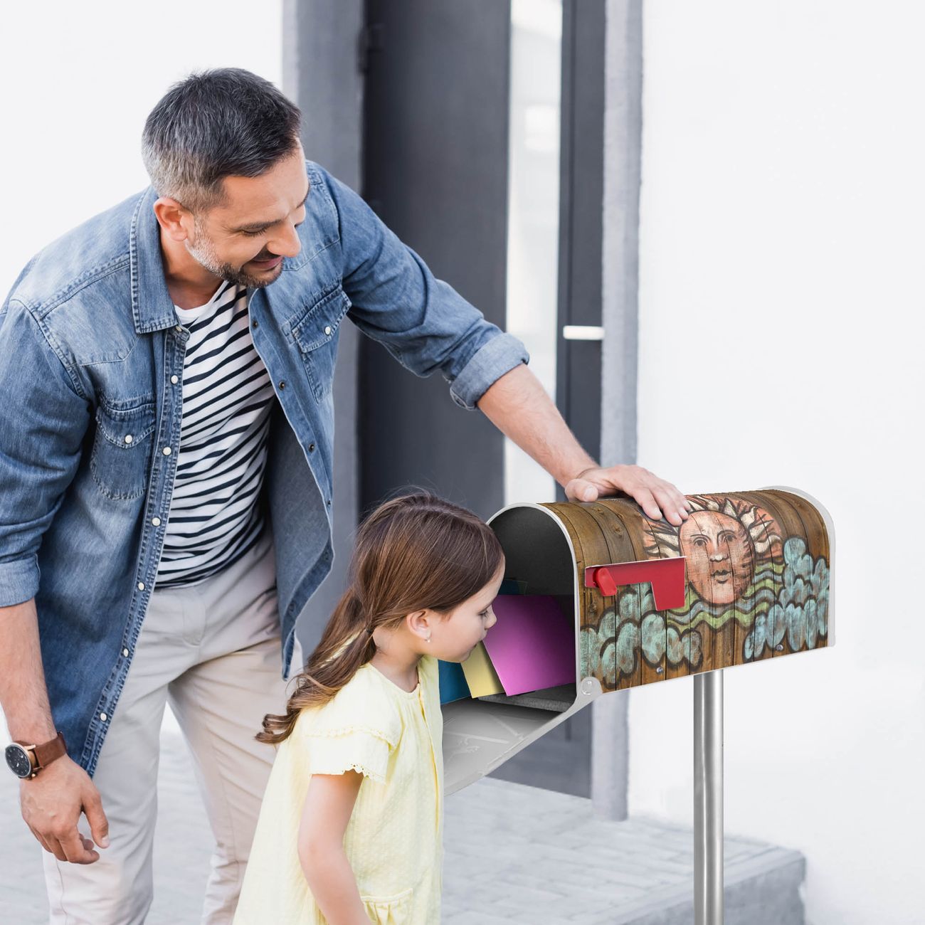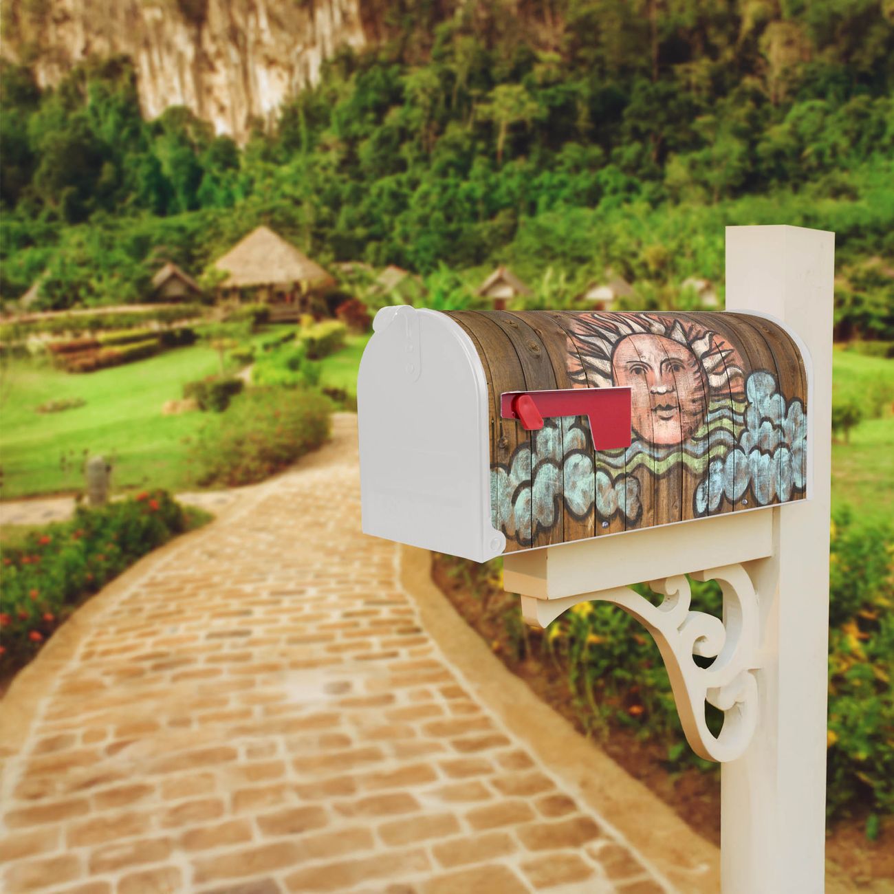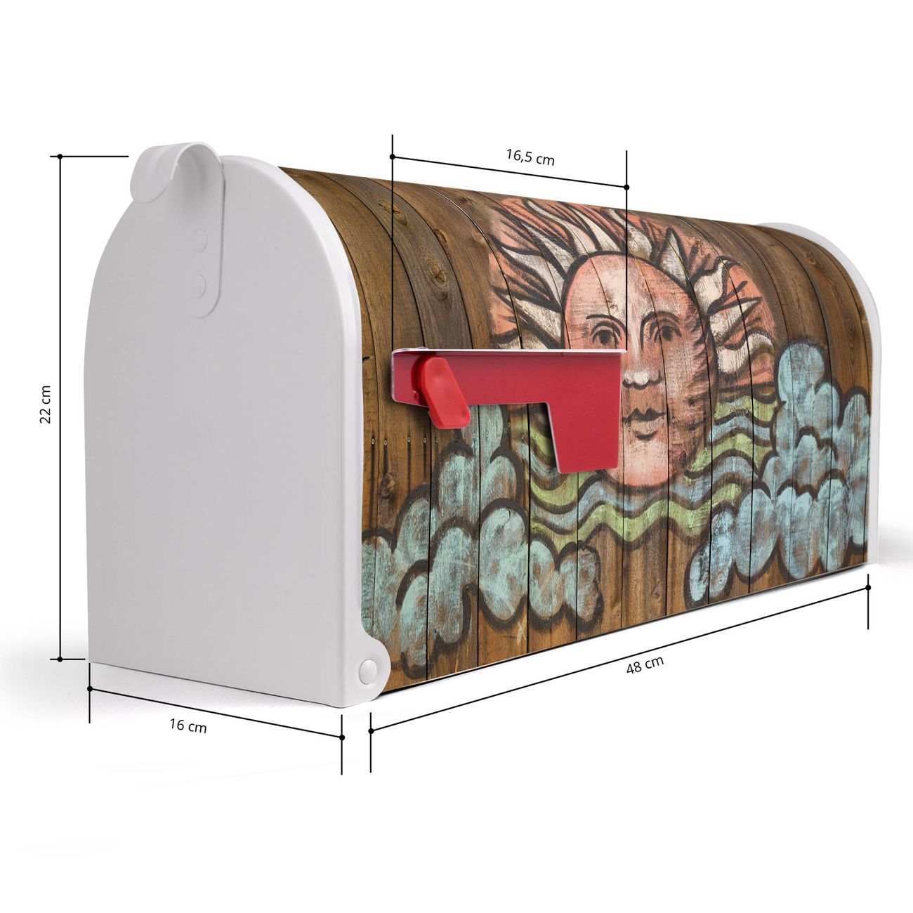Der amerikanische Briefkasten von banjado mit Sonne Motiv bietet Ihnen ausreichend Fassungsvermögen, um große A4 Sendungen und Zeitschriften zu empfangen. Die typisch amerikanische rote Fahne zeigt Ihnen an, wenn Sie Post erhalten haben. Die US-Mailbox besteht aus verzinktem Stahlblech welches lackiert wurde und ist 48 x 22 x 16 CM (BxHxT) groß. Die Folie mit Motiv Sonne besteht aus einer wetter- und UV-resistenten Folie, die mit einem Schutzlaminat überzogen ist, sodass die US Mailbox zusätzlich vor Kratzern geschützt ist. An der Unterkante sind 4 Löcher je Seite um die Mailbox, typisch amerikanisch, an einem Holzpfahl oder einem Zaun zu befestigen. Auf Wunsch können Sie bei uns den passenden Standfuß oder die passende Wandhalterung kaufen um die US-Mailbox sicher zu befestigen. Wir bieten Ihnen ebenfalls Namensschilder, bereits beschriftet oder frei zu beschriften, und verschiedene selbst gestaltete Bitte-Keine-Werbung-Aufkleber.