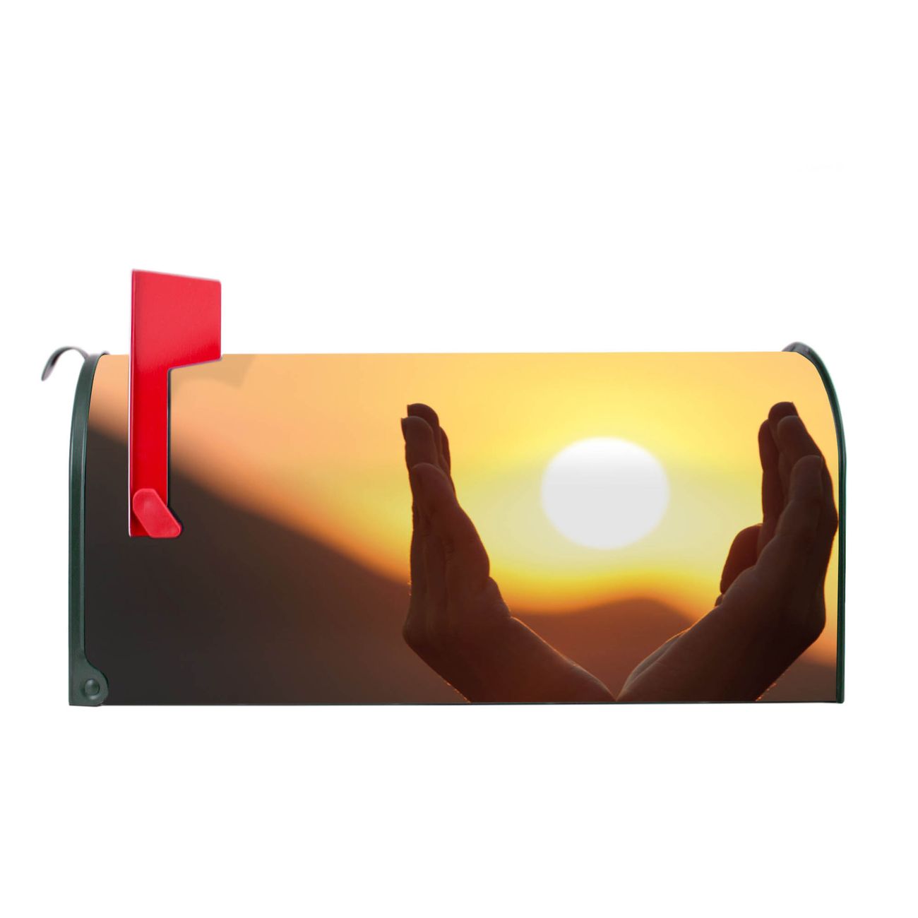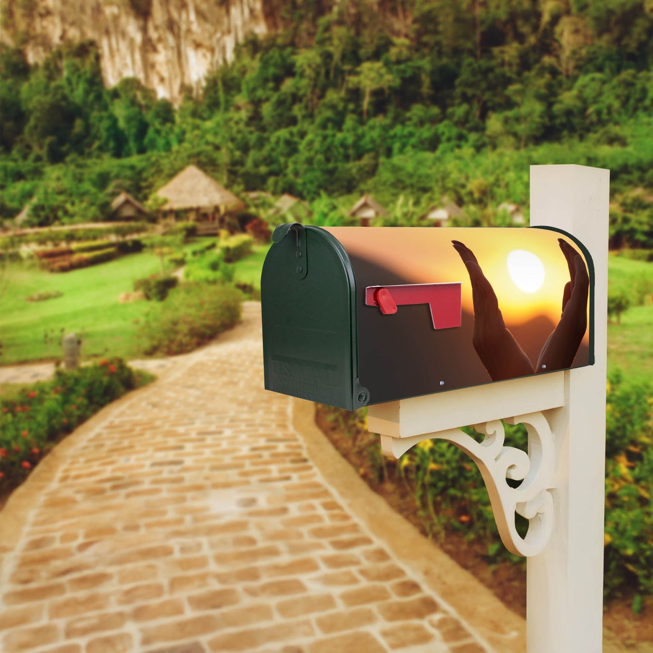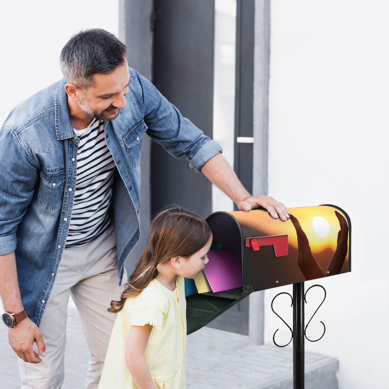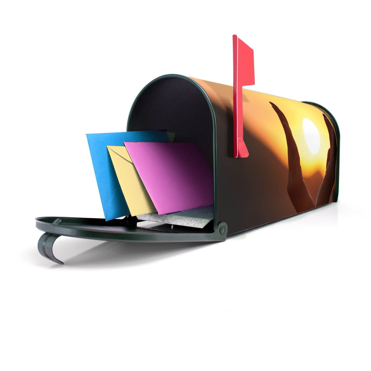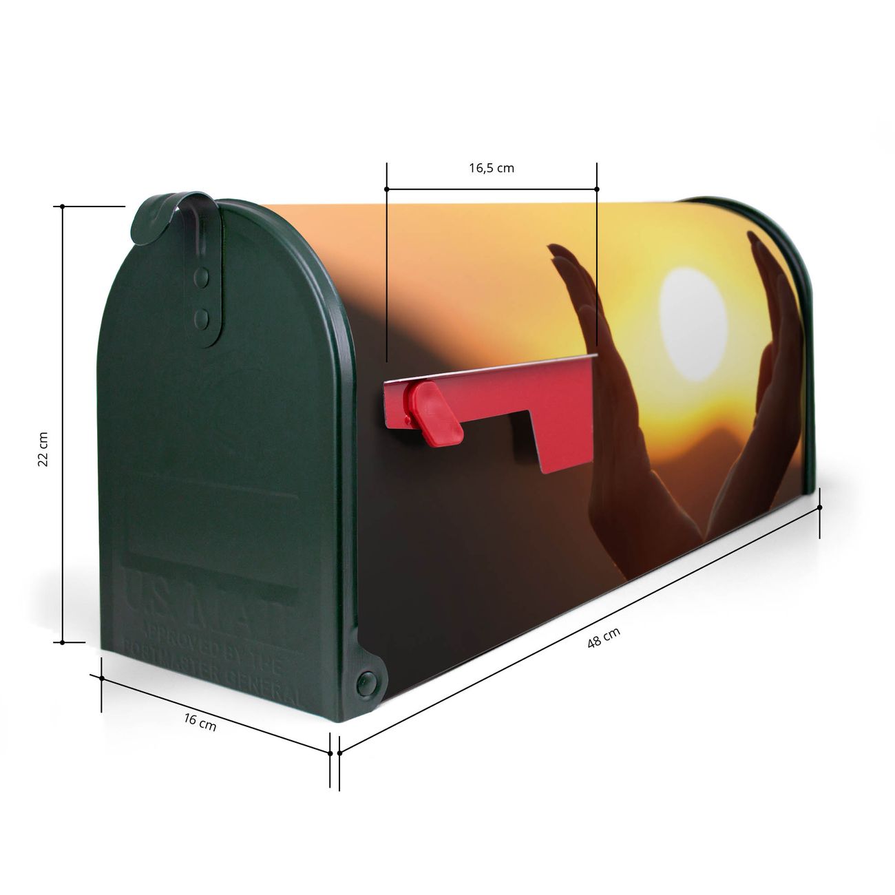Der amerikanische Briefkasten von banjado mit Sonnenanbeter Motiv bietet Ihnen ausreichend Fassungsvermögen, um große A4 Sendungen und Zeitschriften zu empfangen. Die typisch amerikanische rote Fahne zeigt Ihnen an, wenn Sie Post erhalten haben. Die US-Mailbox besteht aus verzinktem Stahlblech welches lackiert wurde und ist 48 x 22 x 16 CM (BxHxT) groß. Die Folie mit Motiv Sonnenanbeter besteht aus einer wetter- und UV-resistenten Folie, die mit einem Schutzlaminat überzogen ist, sodass die US Mailbox zusätzlich vor Kratzern geschützt ist. An der Unterkante sind 4 Löcher je Seite um die Mailbox, typisch amerikanisch, an einem Holzpfahl oder einem Zaun zu befestigen. Auf Wunsch können Sie bei uns den passenden Standfuß oder die passende Wandhalterung kaufen um die US-Mailbox sicher zu befestigen. Wir bieten Ihnen ebenfalls Namensschilder, bereits beschriftet oder frei zu beschriften, und verschiedene selbst gestaltete Bitte-Keine-Werbung-Aufkleber.