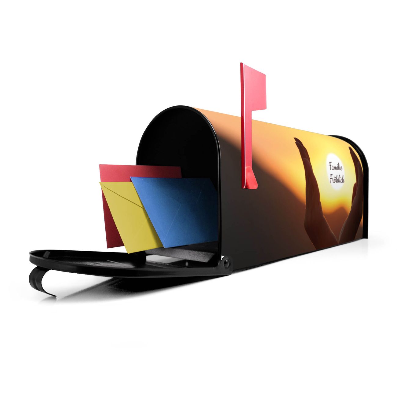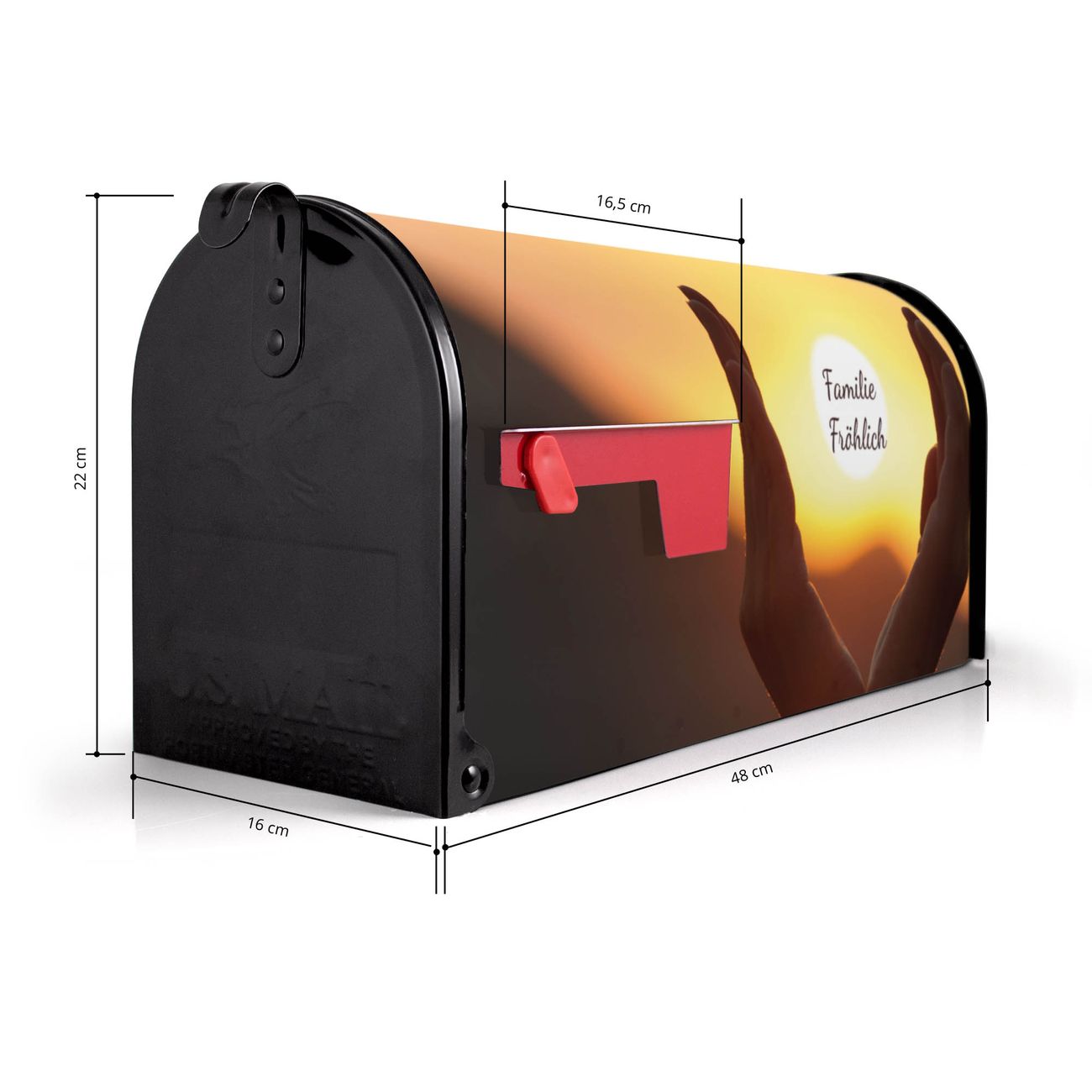 Der amerikanische Briefkasten von banjado mit Sonnenanbeter Motiv bietet Ihnen ausreichend Fassungsvermögen, um große A4 Sendungen und Zeitschriften zu empfangen. Die typisch amerikanische rote Fahne zeigt Ihnen an, wenn Sie Post erhalten haben. Die US-Mailbox besteht aus verzinktem Stahlblech welches lackiert wurde und ist 48 x 22 x 16 CM (BxHxT) groß. Die Folie mit Motiv Sonnenanbeter besteht aus einer wetter- und UV-resistenten Folie, die mit einem Schutzlaminat überzogen ist, sodass die US Mailbox zusätzlich vor Kratzern geschützt ist. An der Unterkante sind 4 Löcher je Seite um die Mailbox, typisch amerikanisch, an einem Holzpfahl oder einem Zaun zu befestigen. Auf Wunsch können Sie bei uns den passenden Standfuß oder die passende Wandhalterung kaufen um die US-Mailbox sicher zu befestigen. Wir bieten Ihnen ebenfalls Namensschilder, bereits beschriftet oder frei zu beschriften, und verschiedene selbst gestaltete Bitte-Keine-Werbung-Aufkleber.