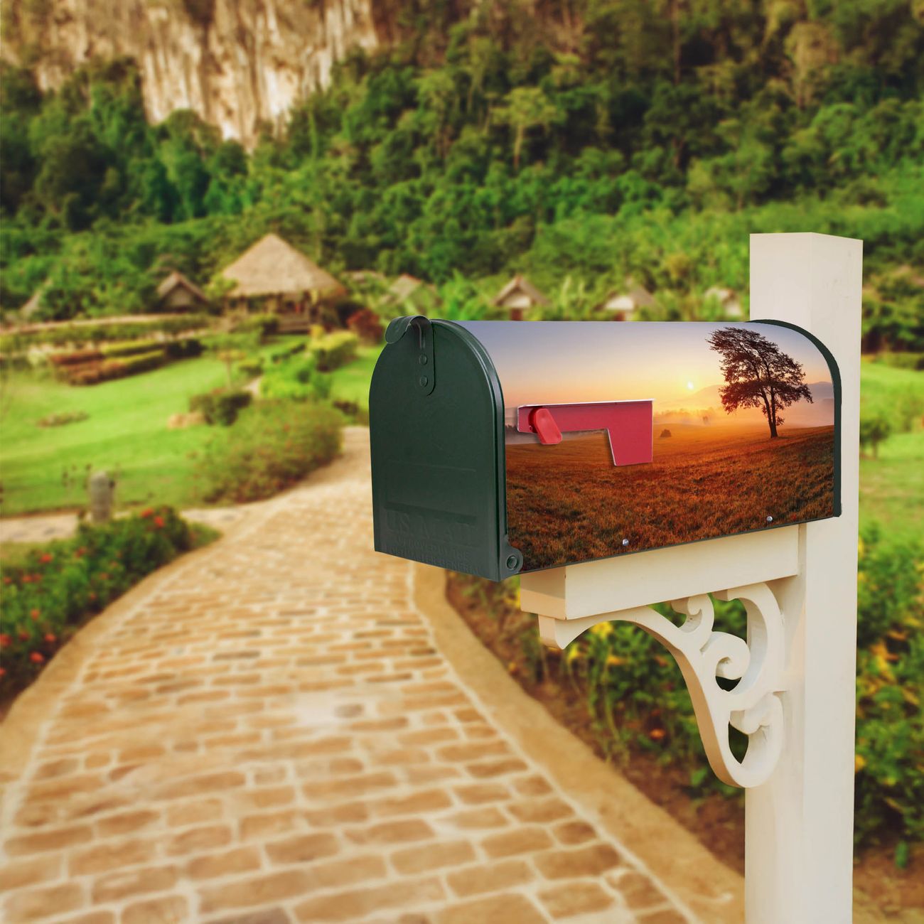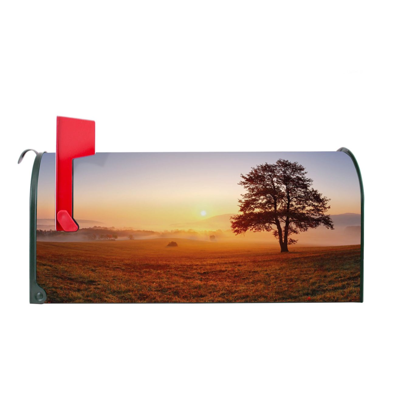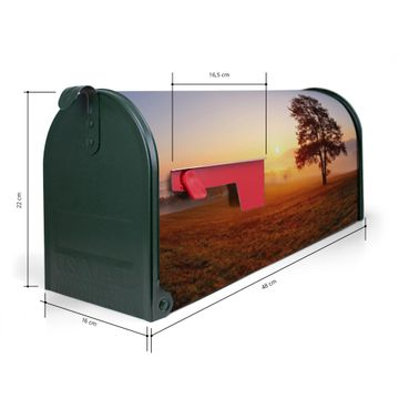 Der amerikanische Briefkasten von banjado mit Sonnenaufgang Motiv bietet Ihnen ausreichend Fassungsvermögen, um große A4 Sendungen und Zeitschriften zu empfangen. Die typisch amerikanische rote Fahne zeigt Ihnen an, wenn Sie Post erhalten haben. Die US-Mailbox besteht aus verzinktem Stahlblech welches lackiert wurde und ist 48 x 22 x 16 CM (BxHxT) groß. Die Folie mit Motiv Sonnenaufgang besteht aus einer wetter- und UV-resistenten Folie, die mit einem Schutzlaminat überzogen ist, sodass die US Mailbox zusätzlich vor Kratzern geschützt ist. An der Unterkante sind 4 Löcher je Seite um die Mailbox, typisch amerikanisch, an einem Holzpfahl oder einem Zaun zu befestigen. Auf Wunsch können Sie bei uns den passenden Standfuß oder die passende Wandhalterung kaufen um die US-Mailbox sicher zu befestigen. Wir bieten Ihnen ebenfalls Namensschilder, bereits beschriftet oder frei zu beschriften, und verschiedene selbst gestaltete Bitte-Keine-Werbung-Aufkleber.