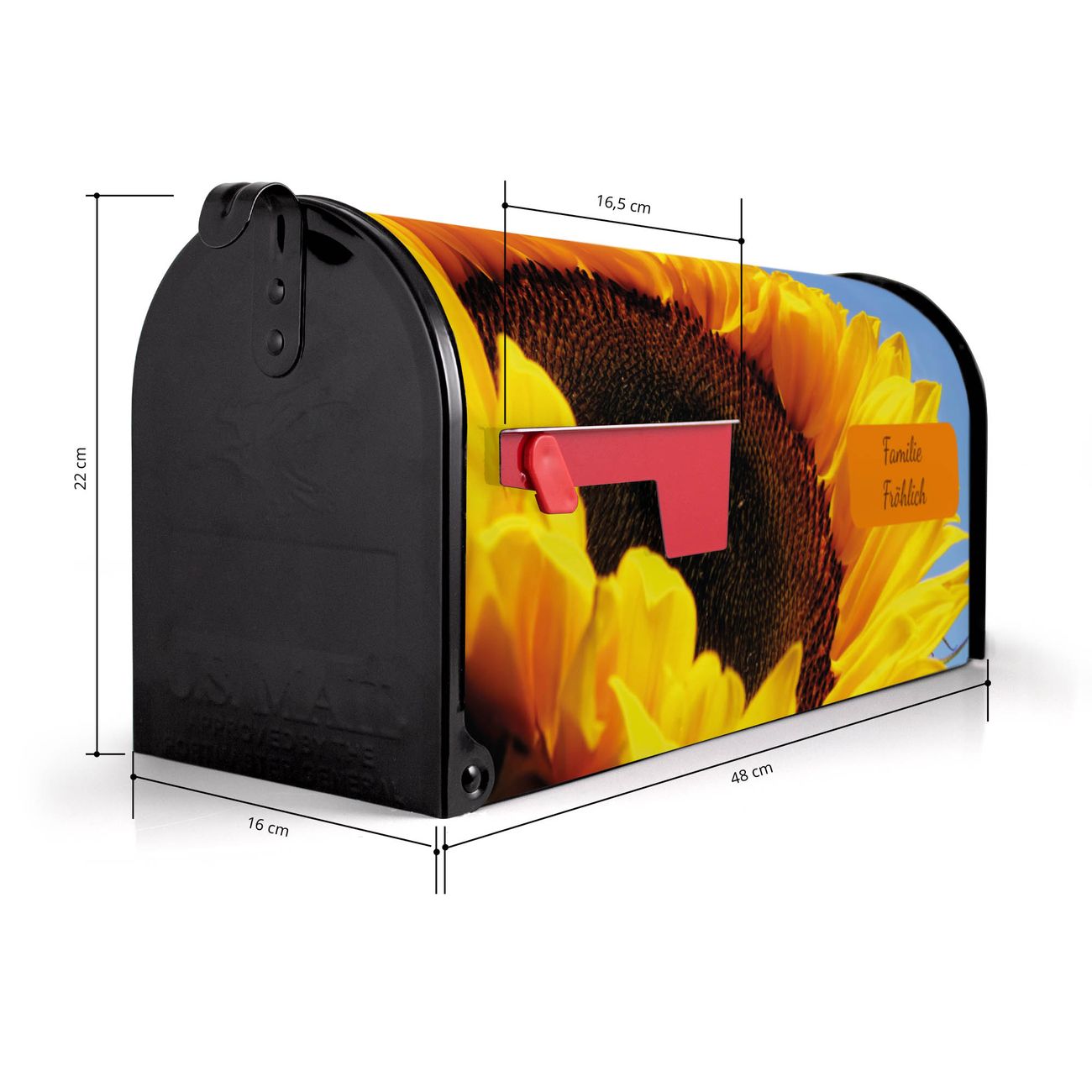 Der amerikanische Briefkasten von banjado mit Sonnenblume Motiv bietet Ihnen ausreichend Fassungsvermögen, um große A4 Sendungen und Zeitschriften zu empfangen. Die typisch amerikanische rote Fahne zeigt Ihnen an, wenn Sie Post erhalten haben. Die US-Mailbox besteht aus verzinktem Stahlblech welches lackiert wurde und ist 48 x 22 x 16 CM (BxHxT) groß. Die Folie mit Motiv Sonnenblume besteht aus einer wetter- und UV-resistenten Folie, die mit einem Schutzlaminat überzogen ist, sodass die US Mailbox zusätzlich vor Kratzern geschützt ist. An der Unterkante sind 4 Löcher je Seite um die Mailbox, typisch amerikanisch, an einem Holzpfahl oder einem Zaun zu befestigen. Auf Wunsch können Sie bei uns den passenden Standfuß oder die passende Wandhalterung kaufen um die US-Mailbox sicher zu befestigen. Wir bieten Ihnen ebenfalls Namensschilder, bereits beschriftet oder frei zu beschriften, und verschiedene selbst gestaltete Bitte-Keine-Werbung-Aufkleber.