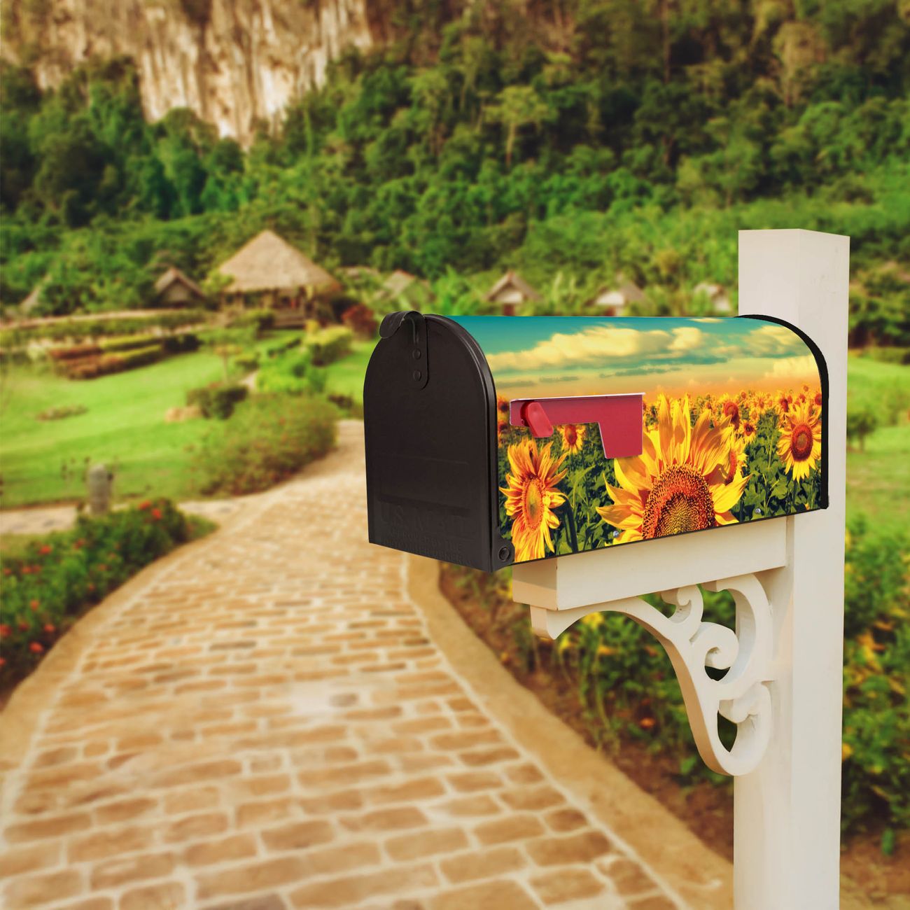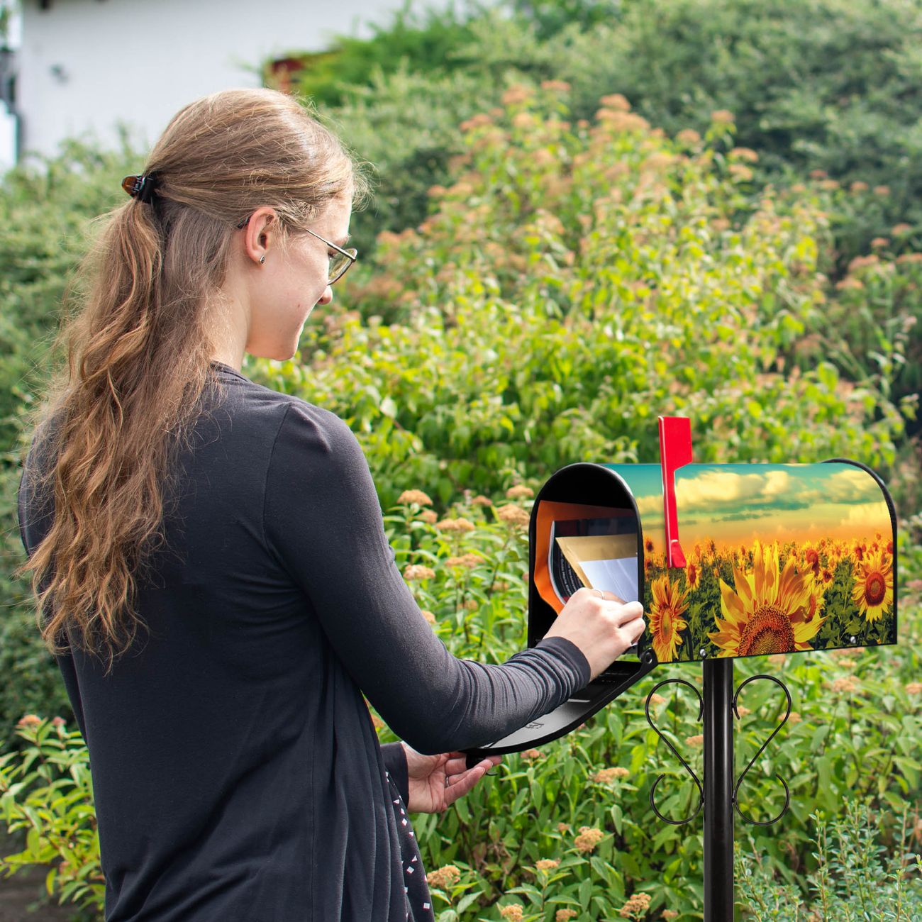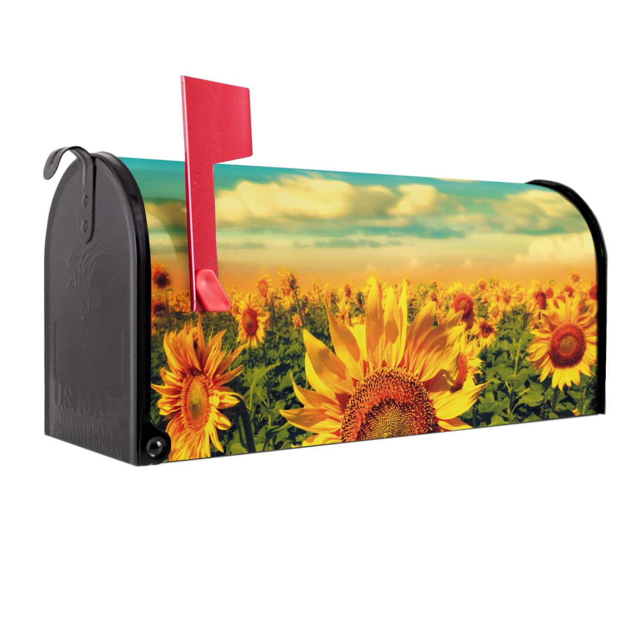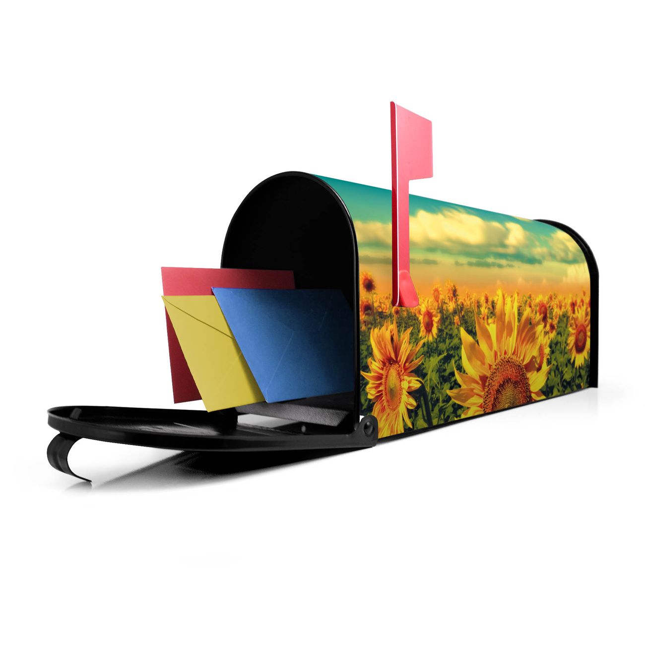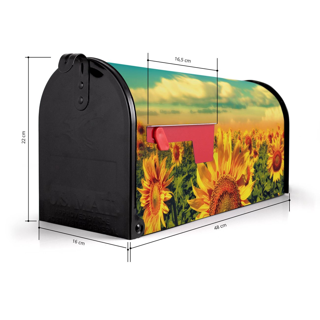 Der amerikanische Briefkasten von banjado mit Sonnenblumen Motiv bietet Ihnen ausreichend Fassungsvermögen, um große A4 Sendungen und Zeitschriften zu empfangen. Die typisch amerikanische rote Fahne zeigt Ihnen an, wenn Sie Post erhalten haben. Die US-Mailbox besteht aus verzinktem Stahlblech welches lackiert wurde und ist 48 x 22 x 16 CM (BxHxT) groß. Die Folie mit Motiv Sonnenblumen besteht aus einer wetter- und UV-resistenten Folie, die mit einem Schutzlaminat überzogen ist, sodass die US Mailbox zusätzlich vor Kratzern geschützt ist. An der Unterkante sind 4 Löcher je Seite um die Mailbox, typisch amerikanisch, an einem Holzpfahl oder einem Zaun zu befestigen. Auf Wunsch können Sie bei uns den passenden Standfuß oder die passende Wandhalterung kaufen um die US-Mailbox sicher zu befestigen. Wir bieten Ihnen ebenfalls Namensschilder, bereits beschriftet oder frei zu beschriften, und verschiedene selbst gestaltete Bitte-Keine-Werbung-Aufkleber.