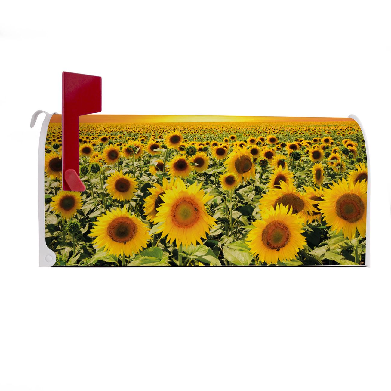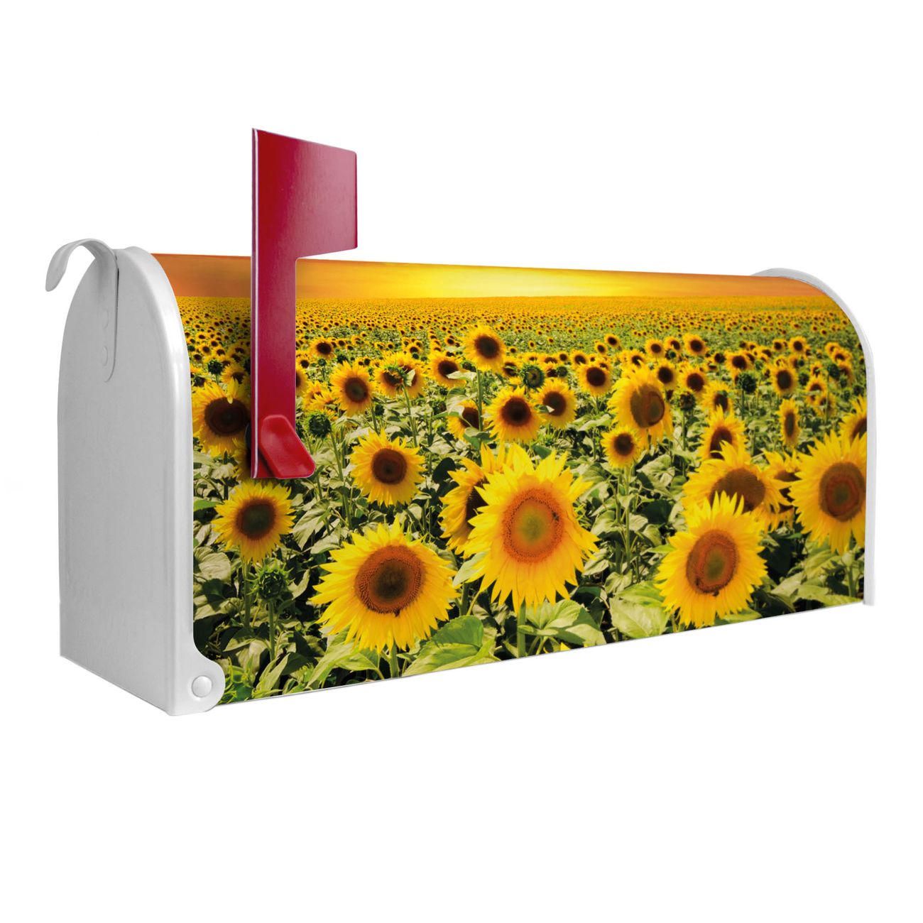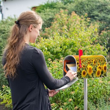 Unser amerikanischer Briefkasten mit dem Motiv Sonnenblumenmeer hat ein sehr ansprechendes und ausgefallenes Design, ist in der Grundfarbe weiß, grün oder schwarz erhältlich. Damit entlocken Sie Ihren Nachbarn und dem Postboten immer wieder ein Lächeln. Die Mailbox ist ein Original Import aus Mississippi USA und wird von unserer kleinen Manufaktur in Sachsen von Hand veredelt. Die US-Mailbox bietet ausreichend Platz auch für große Sendungen, eine Fahne die Ihnen Post anzeigt, wetterfestes und äußerst stabiles Material - so macht Post empfangen Freude.