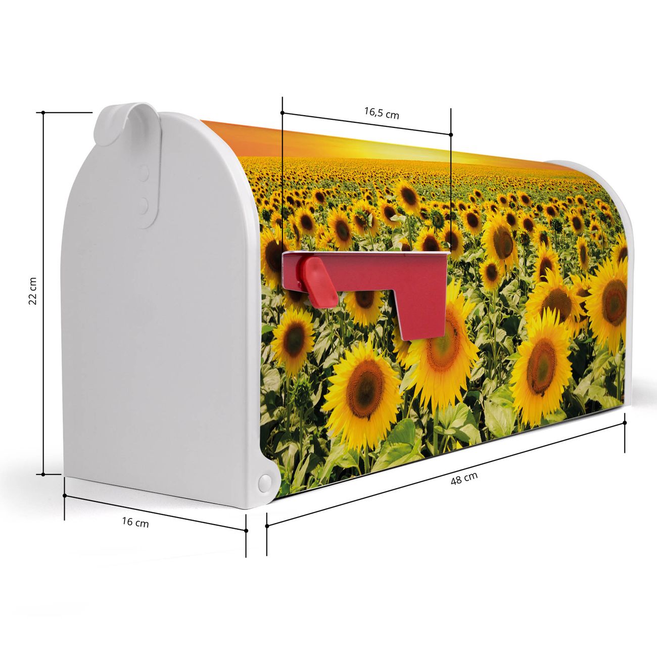 Der amerikanische Briefkasten von banjado mit Sonnenblumenmeer Motiv bietet Ihnen ausreichend Fassungsvermögen, um große A4 Sendungen und Zeitschriften zu empfangen. Die typisch amerikanische rote Fahne zeigt Ihnen an, wenn Sie Post erhalten haben. Die US-Mailbox besteht aus verzinktem Stahlblech welches lackiert wurde und ist 48 x 22 x 16 CM (BxHxT) groß. Die Folie mit Motiv Sonnenblumenmeer besteht aus einer wetter- und UV-resistenten Folie, die mit einem Schutzlaminat überzogen ist, sodass die US Mailbox zusätzlich vor Kratzern geschützt ist. An der Unterkante sind 4 Löcher je Seite um die Mailbox, typisch amerikanisch, an einem Holzpfahl oder einem Zaun zu befestigen. Auf Wunsch können Sie bei uns den passenden Standfuß oder die passende Wandhalterung kaufen um die US-Mailbox sicher zu befestigen. Wir bieten Ihnen ebenfalls Namensschilder, bereits beschriftet oder frei zu beschriften, und verschiedene selbst gestaltete Bitte-Keine-Werbung-Aufkleber.