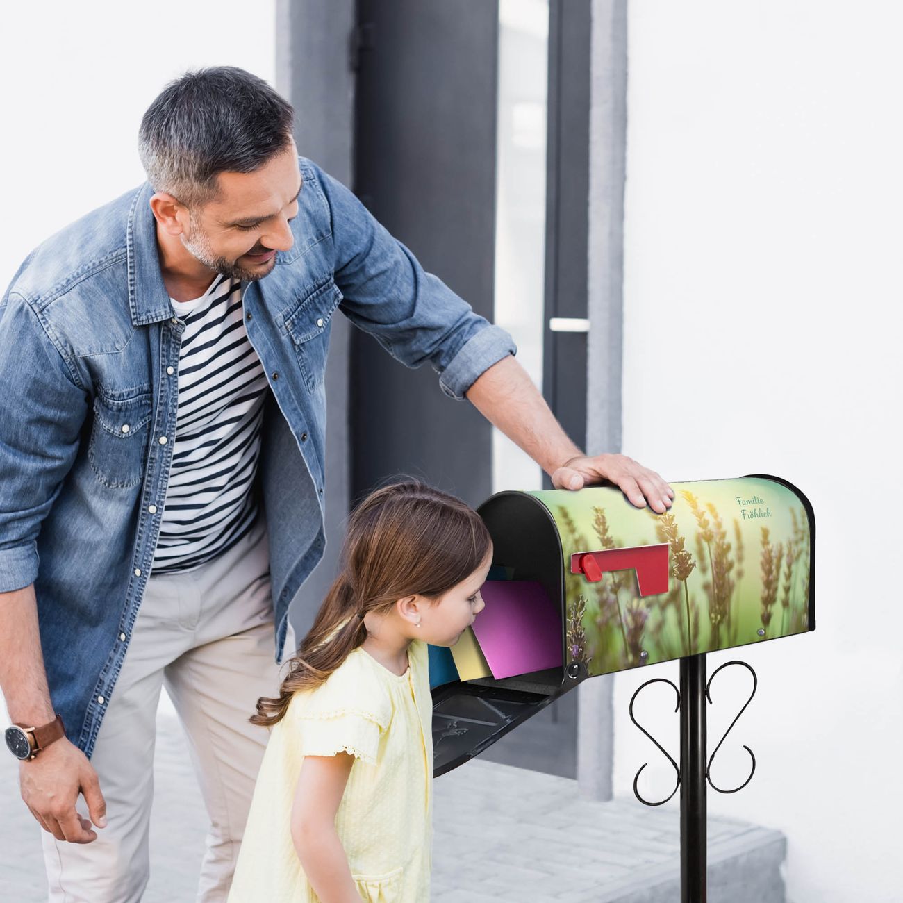 Unser amerikanischer Briefkasten mit dem Motiv Sonnenlavendel hat ein sehr ansprechendes und ausgefallenes Design, ist in der Grundfarbe weiß, grün oder schwarz erhältlich. Damit entlocken Sie Ihren Nachbarn und dem Postboten immer wieder ein Lächeln. Die Mailbox ist ein Original Import aus Mississippi USA und wird von unserer kleinen Manufaktur in Sachsen von Hand veredelt. Die US-Mailbox bietet ausreichend Platz auch für große Sendungen, eine Fahne die Ihnen Post anzeigt, wetterfestes und äußerst stabiles Material - so macht Post empfangen Freude.