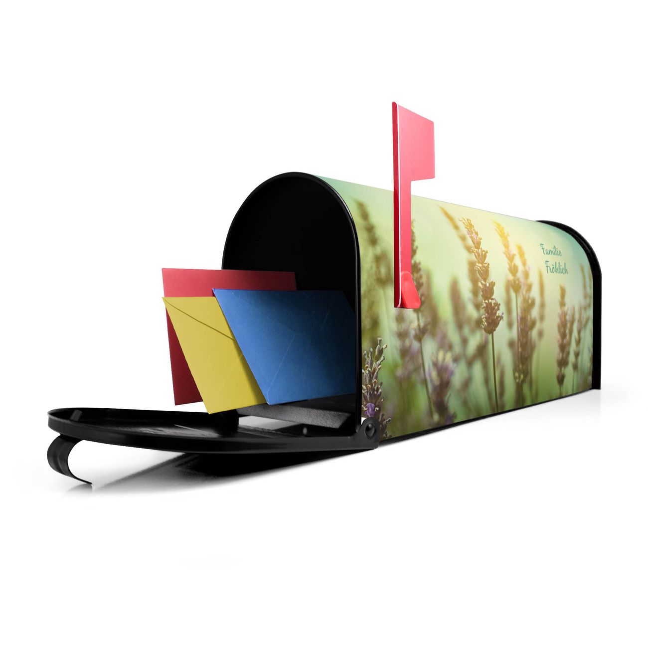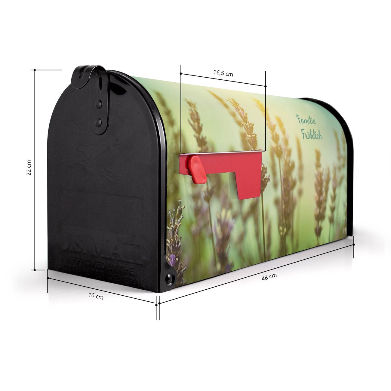 Der amerikanische Briefkasten von banjado mit Sonnenlavendel Motiv bietet Ihnen ausreichend Fassungsvermögen, um große A4 Sendungen und Zeitschriften zu empfangen. Die typisch amerikanische rote Fahne zeigt Ihnen an, wenn Sie Post erhalten haben. Die US-Mailbox besteht aus verzinktem Stahlblech welches lackiert wurde und ist 48 x 22 x 16 CM (BxHxT) groß. Die Folie mit Motiv Sonnenlavendel besteht aus einer wetter- und UV-resistenten Folie, die mit einem Schutzlaminat überzogen ist, sodass die US Mailbox zusätzlich vor Kratzern geschützt ist. An der Unterkante sind 4 Löcher je Seite um die Mailbox, typisch amerikanisch, an einem Holzpfahl oder einem Zaun zu befestigen. Auf Wunsch können Sie bei uns den passenden Standfuß oder die passende Wandhalterung kaufen um die US-Mailbox sicher zu befestigen. Wir bieten Ihnen ebenfalls Namensschilder, bereits beschriftet oder frei zu beschriften, und verschiedene selbst gestaltete Bitte-Keine-Werbung-Aufkleber.
