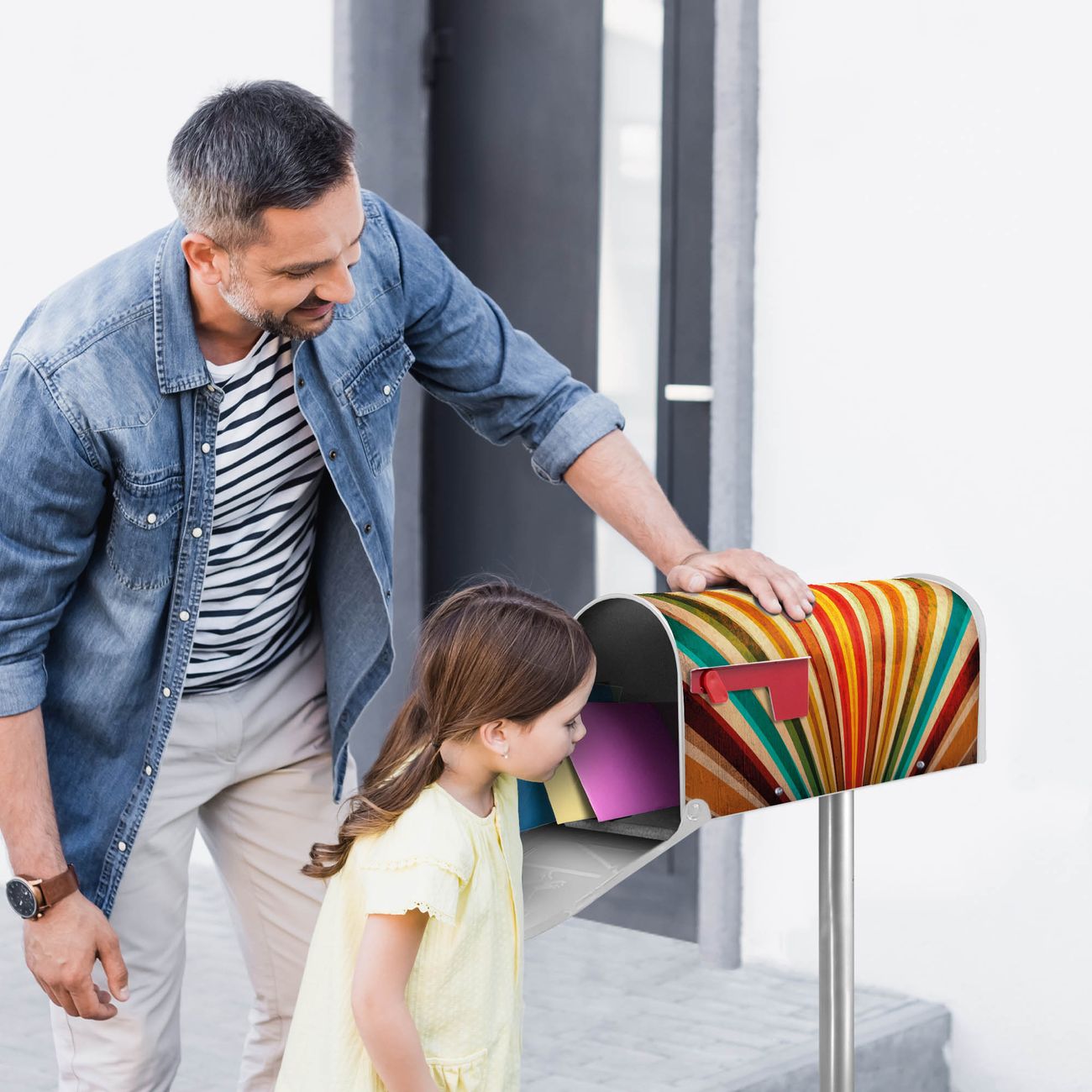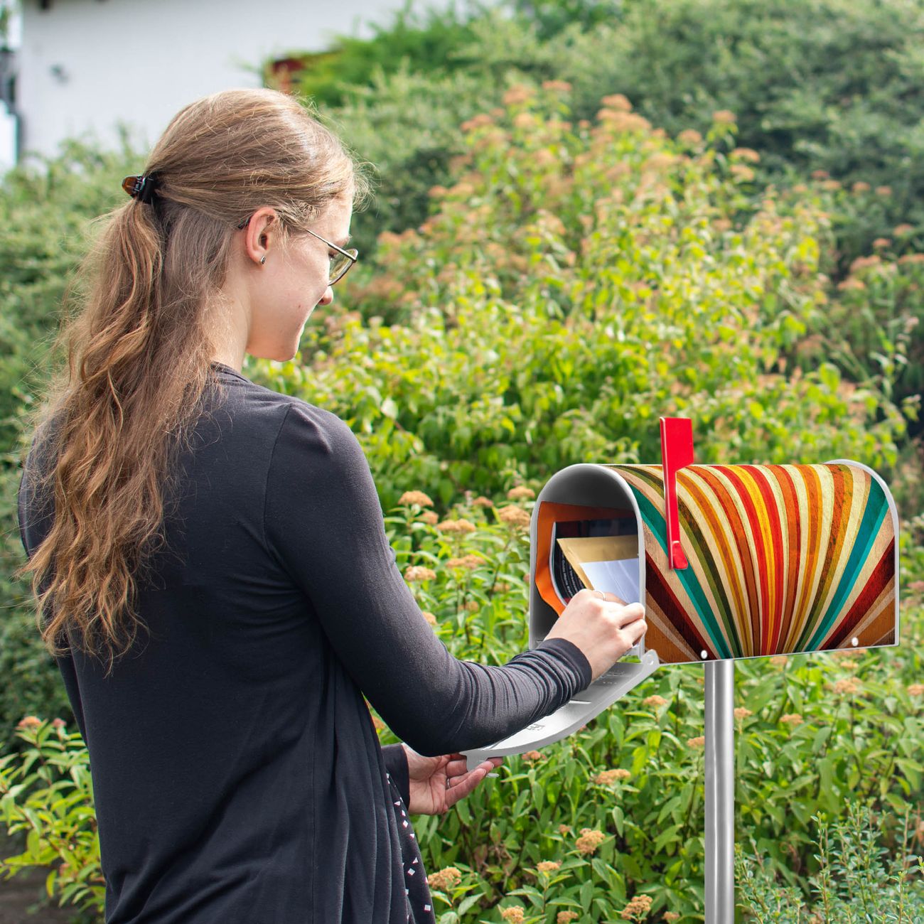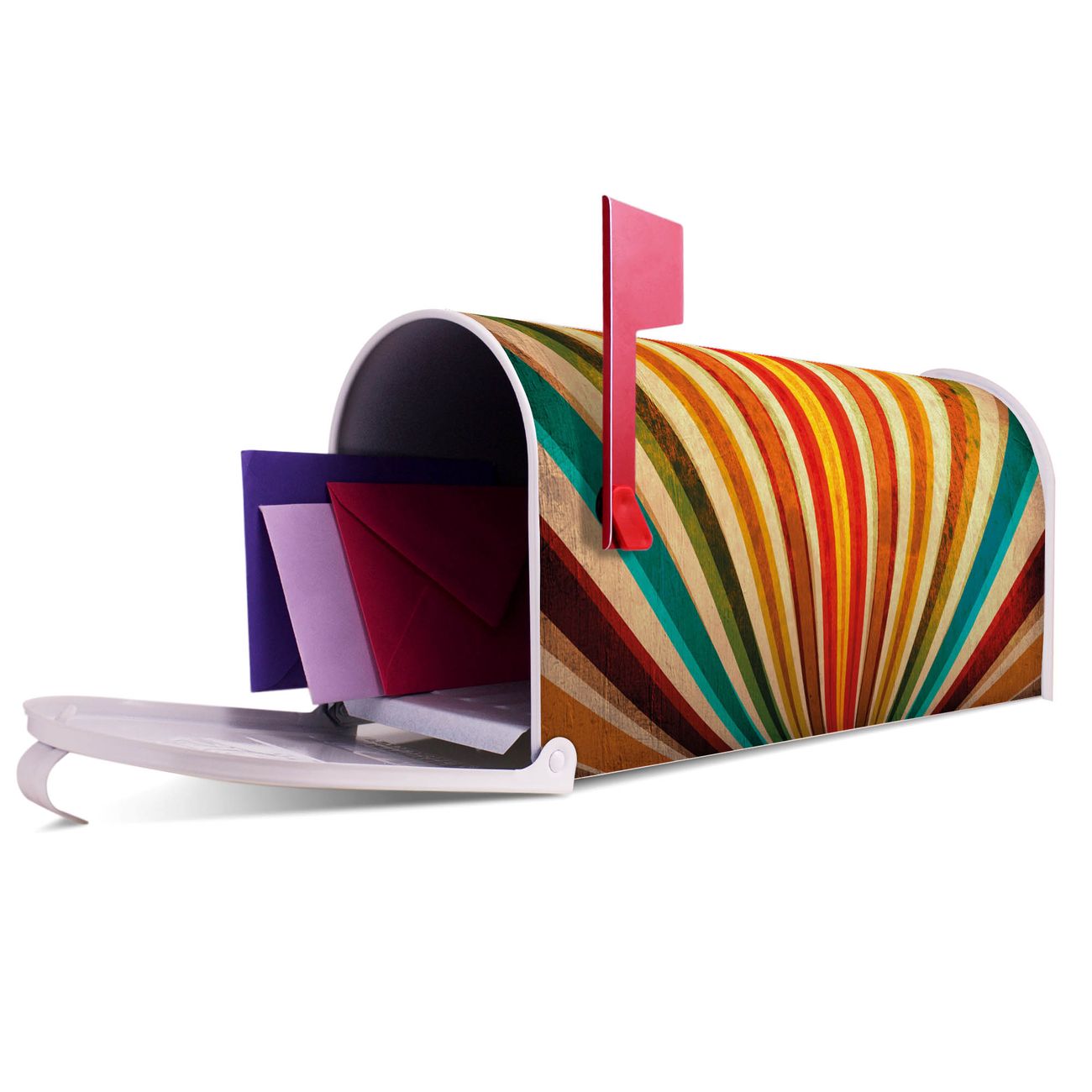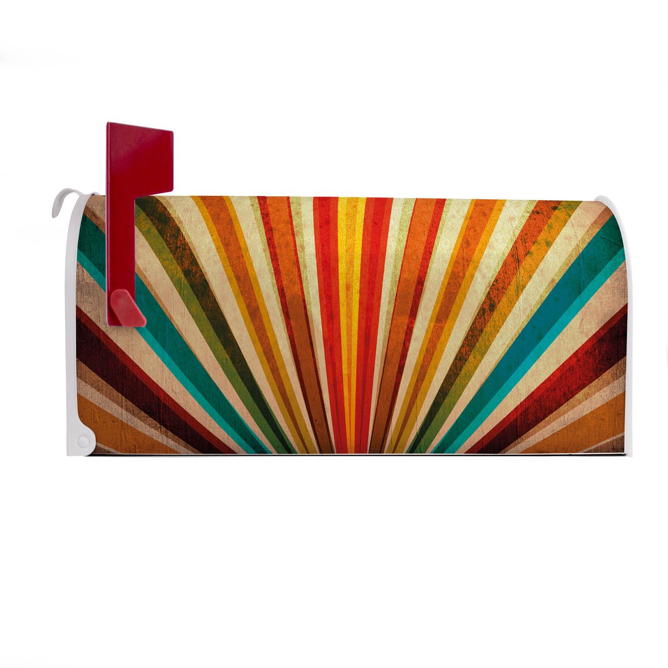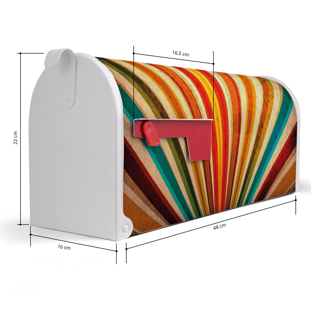 Der amerikanische Briefkasten von banjado mit Sonnenuntergang Abstrakt Motiv bietet Ihnen ausreichend Fassungsvermögen, um große A4 Sendungen und Zeitschriften zu empfangen. Die typisch amerikanische rote Fahne zeigt Ihnen an, wenn Sie Post erhalten haben. Die US-Mailbox besteht aus verzinktem Stahlblech welches lackiert wurde und ist 48 x 22 x 16 CM (BxHxT) groß. Die Folie mit Motiv Sonnenuntergang Abstrakt besteht aus einer wetter- und UV-resistenten Folie, die mit einem Schutzlaminat überzogen ist, sodass die US Mailbox zusätzlich vor Kratzern geschützt ist. An der Unterkante sind 4 Löcher je Seite um die Mailbox, typisch amerikanisch, an einem Holzpfahl oder einem Zaun zu befestigen. Auf Wunsch können Sie bei uns den passenden Standfuß oder die passende Wandhalterung kaufen um die US-Mailbox sicher zu befestigen. Wir bieten Ihnen ebenfalls Namensschilder, bereits beschriftet oder frei zu beschriften, und verschiedene selbst gestaltete Bitte-Keine-Werbung-Aufkleber.