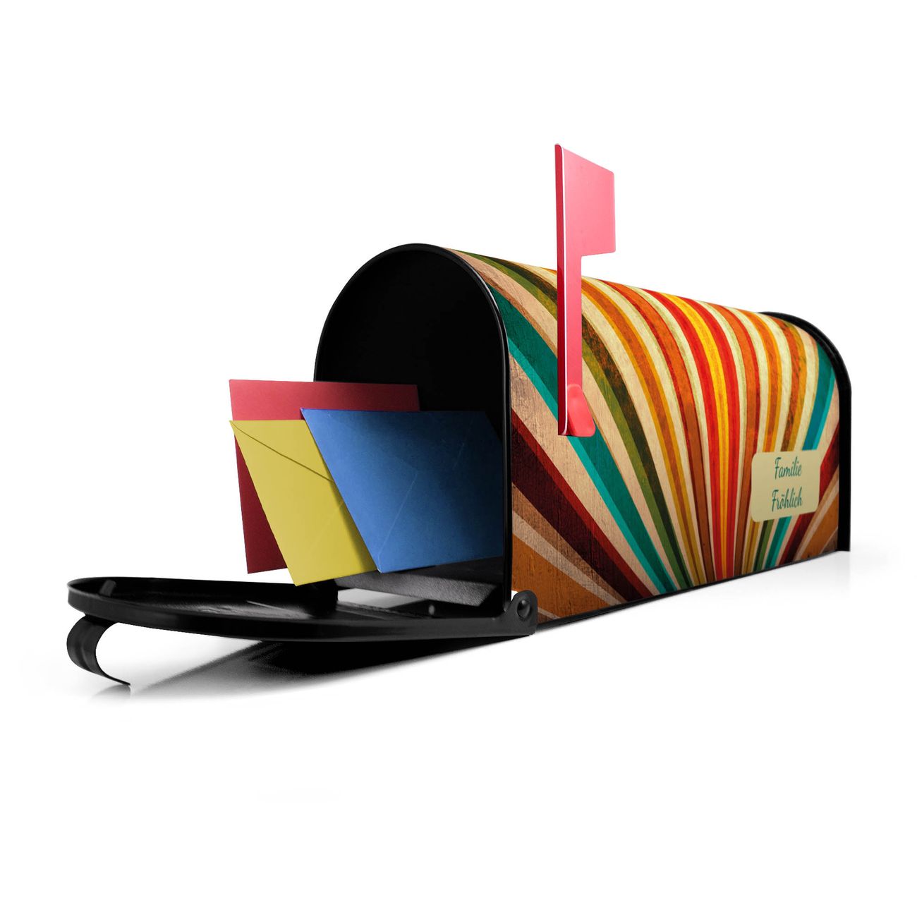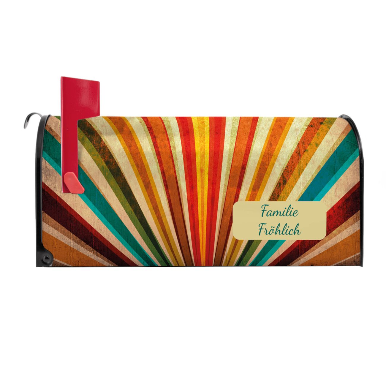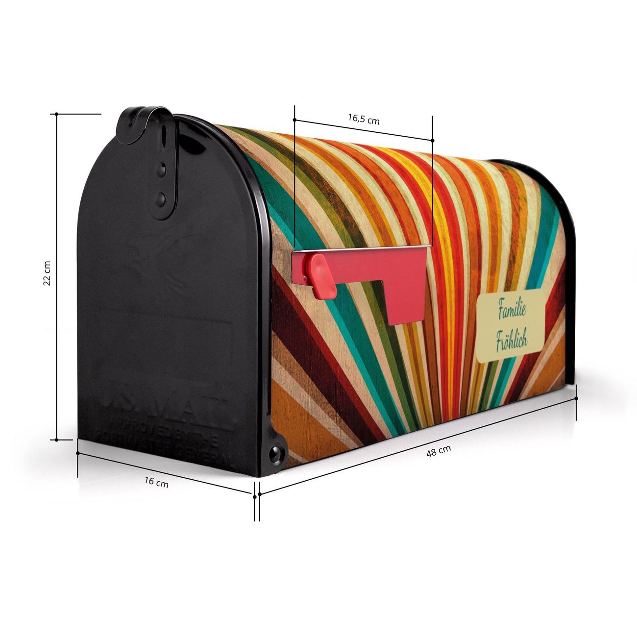 Der amerikanische Briefkasten von banjado mit Sonnenuntergang Abstrakt Motiv bietet Ihnen ausreichend Fassungsvermögen, um große A4 Sendungen und Zeitschriften zu empfangen. Die typisch amerikanische rote Fahne zeigt Ihnen an, wenn Sie Post erhalten haben. Die US-Mailbox besteht aus verzinktem Stahlblech welches lackiert wurde und ist 48 x 22 x 16 CM (BxHxT) groß. Die Folie mit Motiv Sonnenuntergang Abstrakt besteht aus einer wetter- und UV-resistenten Folie, die mit einem Schutzlaminat überzogen ist, sodass die US Mailbox zusätzlich vor Kratzern geschützt ist. An der Unterkante sind 4 Löcher je Seite um die Mailbox, typisch amerikanisch, an einem Holzpfahl oder einem Zaun zu befestigen. Auf Wunsch können Sie bei uns den passenden Standfuß oder die passende Wandhalterung kaufen um die US-Mailbox sicher zu befestigen. Wir bieten Ihnen ebenfalls Namensschilder, bereits beschriftet oder frei zu beschriften, und verschiedene selbst gestaltete Bitte-Keine-Werbung-Aufkleber.