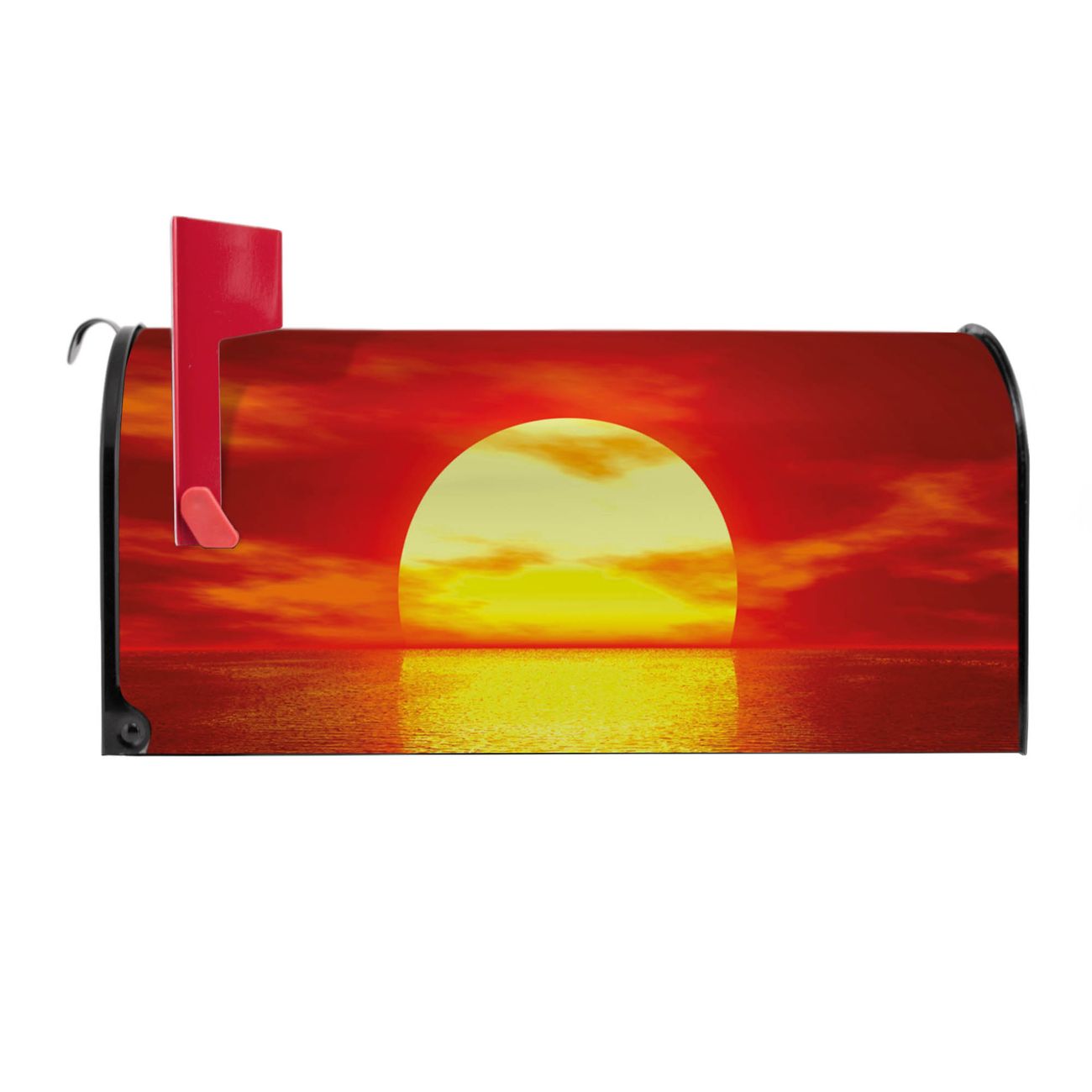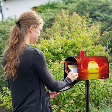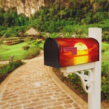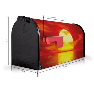 Der amerikanische Briefkasten von banjado mit Sonnenuntergang Motiv bietet Ihnen ausreichend Fassungsvermögen, um große A4 Sendungen und Zeitschriften zu empfangen. Die typisch amerikanische rote Fahne zeigt Ihnen an, wenn Sie Post erhalten haben. Die US-Mailbox besteht aus verzinktem Stahlblech welches lackiert wurde und ist 48 x 22 x 16 CM (BxHxT) groß. Die Folie mit Motiv Sonnenuntergang besteht aus einer wetter- und UV-resistenten Folie, die mit einem Schutzlaminat überzogen ist, sodass die US Mailbox zusätzlich vor Kratzern geschützt ist. An der Unterkante sind 4 Löcher je Seite um die Mailbox, typisch amerikanisch, an einem Holzpfahl oder einem Zaun zu befestigen. Auf Wunsch können Sie bei uns den passenden Standfuß oder die passende Wandhalterung kaufen um die US-Mailbox sicher zu befestigen. Wir bieten Ihnen ebenfalls Namensschilder, bereits beschriftet oder frei zu beschriften, und verschiedene selbst gestaltete Bitte-Keine-Werbung-Aufkleber.