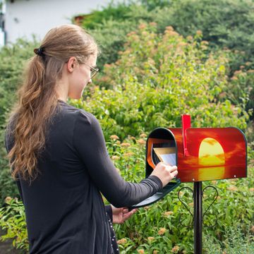 Der amerikanische Briefkasten von banjado mit Sonnenuntergang Motiv bietet Ihnen ausreichend Fassungsvermögen, um große A4 Sendungen und Zeitschriften zu empfangen. Die typisch amerikanische rote Fahne zeigt Ihnen an, wenn Sie Post erhalten haben. Die US-Mailbox besteht aus verzinktem Stahlblech welches lackiert wurde und ist 48 x 22 x 16 CM (BxHxT) groß. Die Folie mit Motiv Sonnenuntergang besteht aus einer wetter- und UV-resistenten Folie, die mit einem Schutzlaminat überzogen ist, sodass die US Mailbox zusätzlich vor Kratzern geschützt ist. An der Unterkante sind 4 Löcher je Seite um die Mailbox, typisch amerikanisch, an einem Holzpfahl oder einem Zaun zu befestigen. Auf Wunsch können Sie bei uns den passenden Standfuß oder die passende Wandhalterung kaufen um die US-Mailbox sicher zu befestigen. Wir bieten Ihnen ebenfalls Namensschilder, bereits beschriftet oder frei zu beschriften, und verschiedene selbst gestaltete Bitte-Keine-Werbung-Aufkleber.