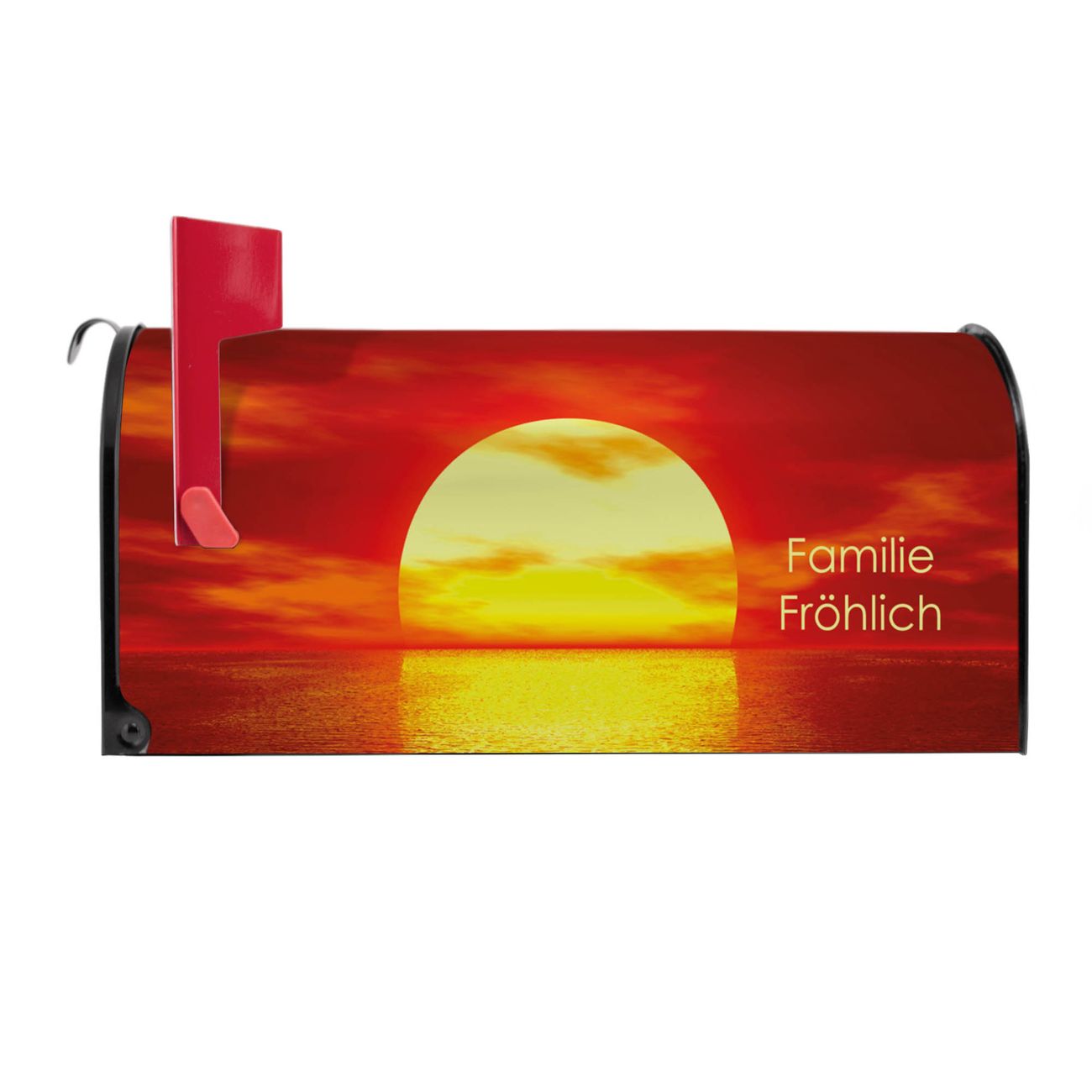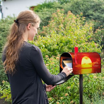 Der amerikanische Briefkasten von banjado mit Sonnenuntergang Motiv bietet Ihnen ausreichend Fassungsvermögen, um große A4 Sendungen und Zeitschriften zu empfangen. Die typisch amerikanische rote Fahne zeigt Ihnen an, wenn Sie Post erhalten haben. Die US-Mailbox besteht aus verzinktem Stahlblech welches lackiert wurde und ist 48 x 22 x 16 CM (BxHxT) groß. Die Folie mit Motiv Sonnenuntergang besteht aus einer wetter- und UV-resistenten Folie, die mit einem Schutzlaminat überzogen ist, sodass die US Mailbox zusätzlich vor Kratzern geschützt ist. An der Unterkante sind 4 Löcher je Seite um die Mailbox, typisch amerikanisch, an einem Holzpfahl oder einem Zaun zu befestigen. Auf Wunsch können Sie bei uns den passenden Standfuß oder die passende Wandhalterung kaufen um die US-Mailbox sicher zu befestigen. Wir bieten Ihnen ebenfalls Namensschilder, bereits beschriftet oder frei zu beschriften, und verschiedene selbst gestaltete Bitte-Keine-Werbung-Aufkleber.