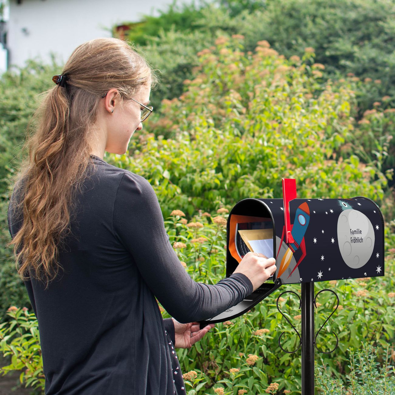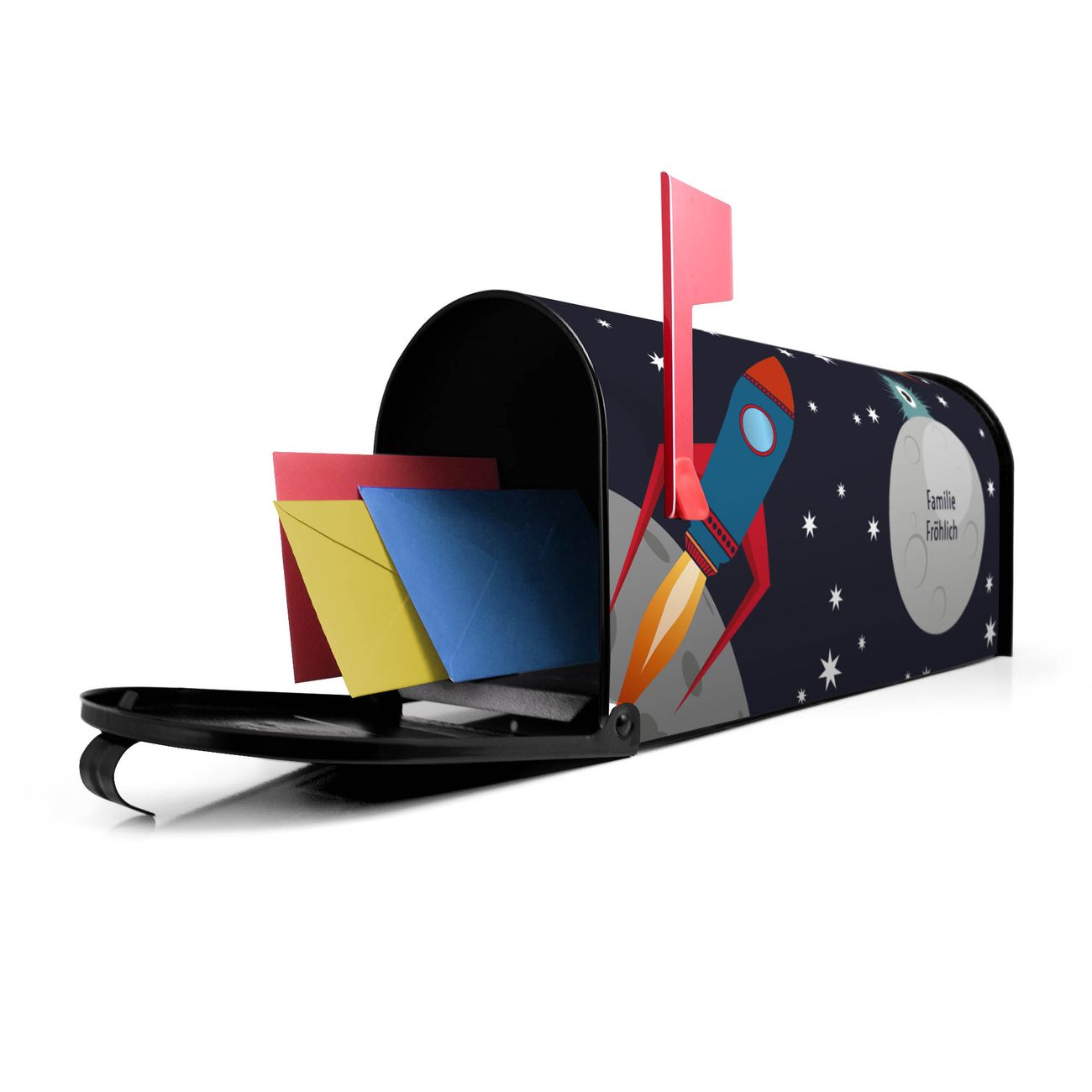Unser amerikanischer Briefkasten mit dem Motiv Space Traffic hat ein sehr ansprechendes und ausgefallenes Design, ist in der Grundfarbe weiß, grün oder schwarz erhältlich. Damit entlocken Sie Ihren Nachbarn und dem Postboten immer wieder ein Lächeln. Die Mailbox ist ein Original Import aus Mississippi USA und wird von unserer kleinen Manufaktur in Sachsen von Hand veredelt. Die US-Mailbox bietet ausreichend Platz auch für große Sendungen, eine Fahne die Ihnen Post anzeigt, wetterfestes und äußerst stabiles Material - so macht Post empfangen Freude.