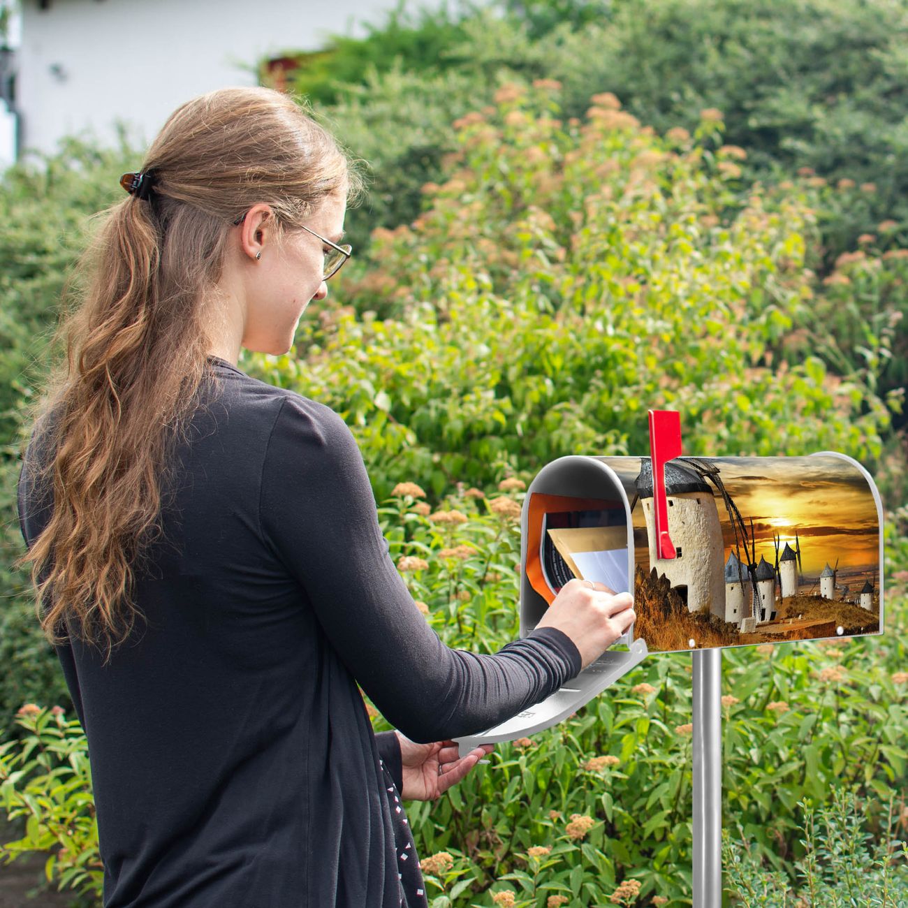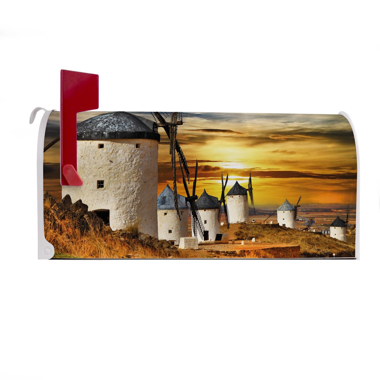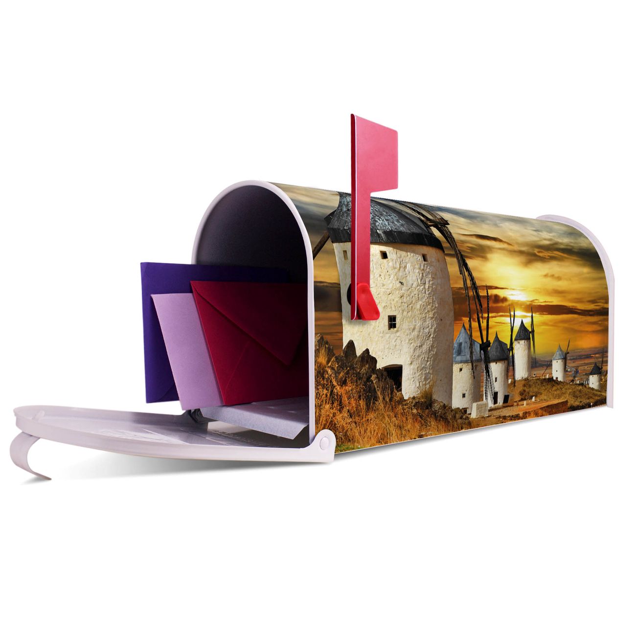 Unser amerikanischer Briefkasten mit dem Motiv Spanische Windmühlen hat ein sehr ansprechendes und ausgefallenes Design, ist in der Grundfarbe weiß, grün oder schwarz erhältlich. Damit entlocken Sie Ihren Nachbarn und dem Postboten immer wieder ein Lächeln. Die Mailbox ist ein Original Import aus Mississippi USA und wird von unserer kleinen Manufaktur in Sachsen von Hand veredelt. Die US-Mailbox bietet ausreichend Platz auch für große Sendungen, eine Fahne die Ihnen Post anzeigt, wetterfestes und äußerst stabiles Material - so macht Post empfangen Freude.
