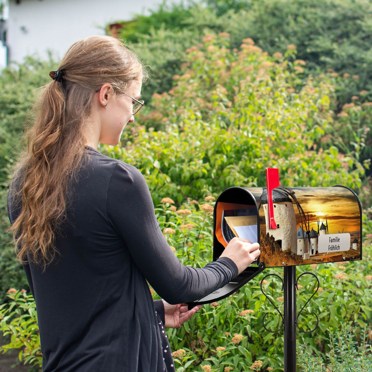 Unser amerikanischer Briefkasten mit dem Motiv Spanische Windmühlen hat ein sehr ansprechendes und ausgefallenes Design, ist in der Grundfarbe weiß, grün oder schwarz erhältlich. Damit entlocken Sie Ihren Nachbarn und dem Postboten immer wieder ein Lächeln. Die Mailbox ist ein Original Import aus Mississippi USA und wird von unserer kleinen Manufaktur in Sachsen von Hand veredelt. Die US-Mailbox bietet ausreichend Platz auch für große Sendungen, eine Fahne die Ihnen Post anzeigt, wetterfestes und äußerst stabiles Material - so macht Post empfangen Freude.