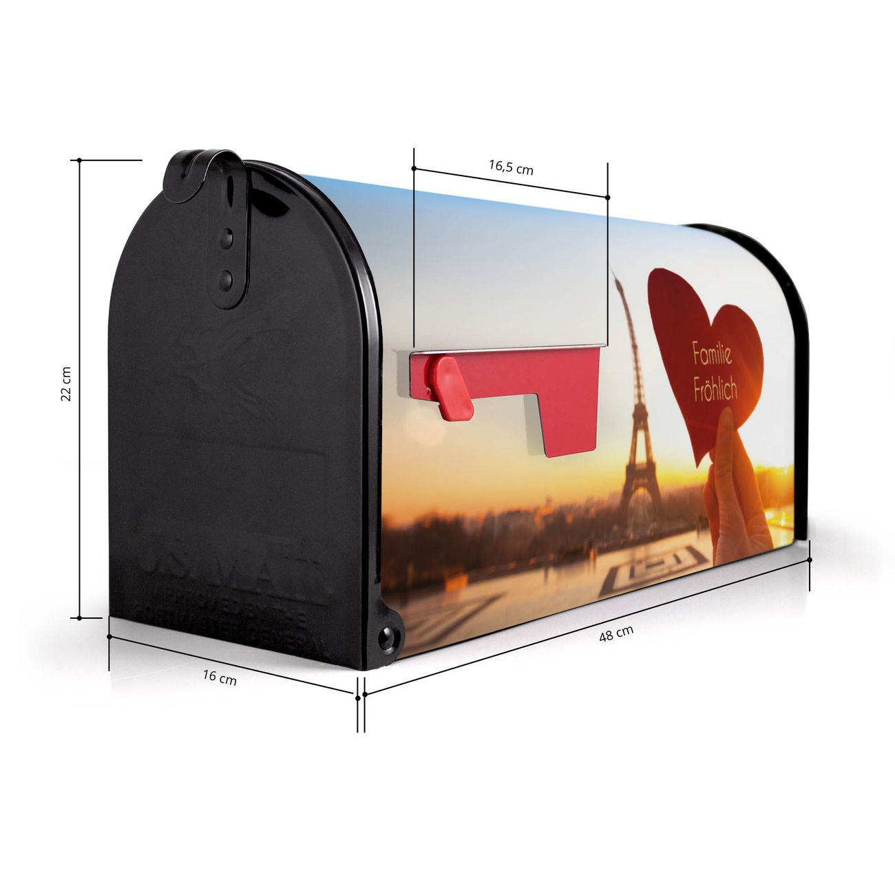 Der amerikanische Briefkasten von banjado mit Stadt Der Liebe Motiv bietet Ihnen ausreichend Fassungsvermögen, um große A4 Sendungen und Zeitschriften zu empfangen. Die typisch amerikanische rote Fahne zeigt Ihnen an, wenn Sie Post erhalten haben. Die US-Mailbox besteht aus verzinktem Stahlblech welches lackiert wurde und ist 48 x 22 x 16 CM (BxHxT) groß. Die Folie mit Motiv Stadt Der Liebe besteht aus einer wetter- und UV-resistenten Folie, die mit einem Schutzlaminat überzogen ist, sodass die US Mailbox zusätzlich vor Kratzern geschützt ist. An der Unterkante sind 4 Löcher je Seite um die Mailbox, typisch amerikanisch, an einem Holzpfahl oder einem Zaun zu befestigen. Auf Wunsch können Sie bei uns den passenden Standfuß oder die passende Wandhalterung kaufen um die US-Mailbox sicher zu befestigen. Wir bieten Ihnen ebenfalls Namensschilder, bereits beschriftet oder frei zu beschriften, und verschiedene selbst gestaltete Bitte-Keine-Werbung-Aufkleber.