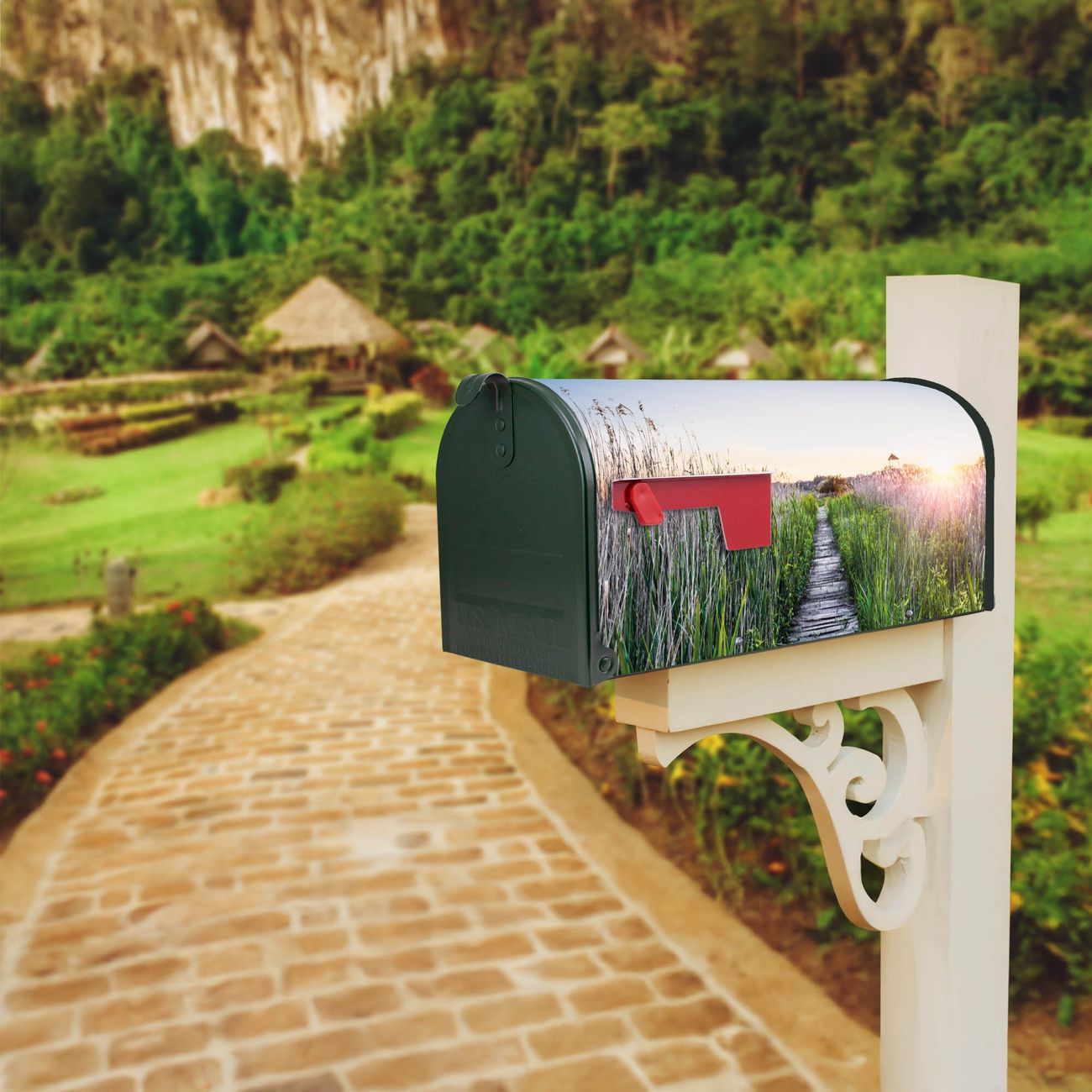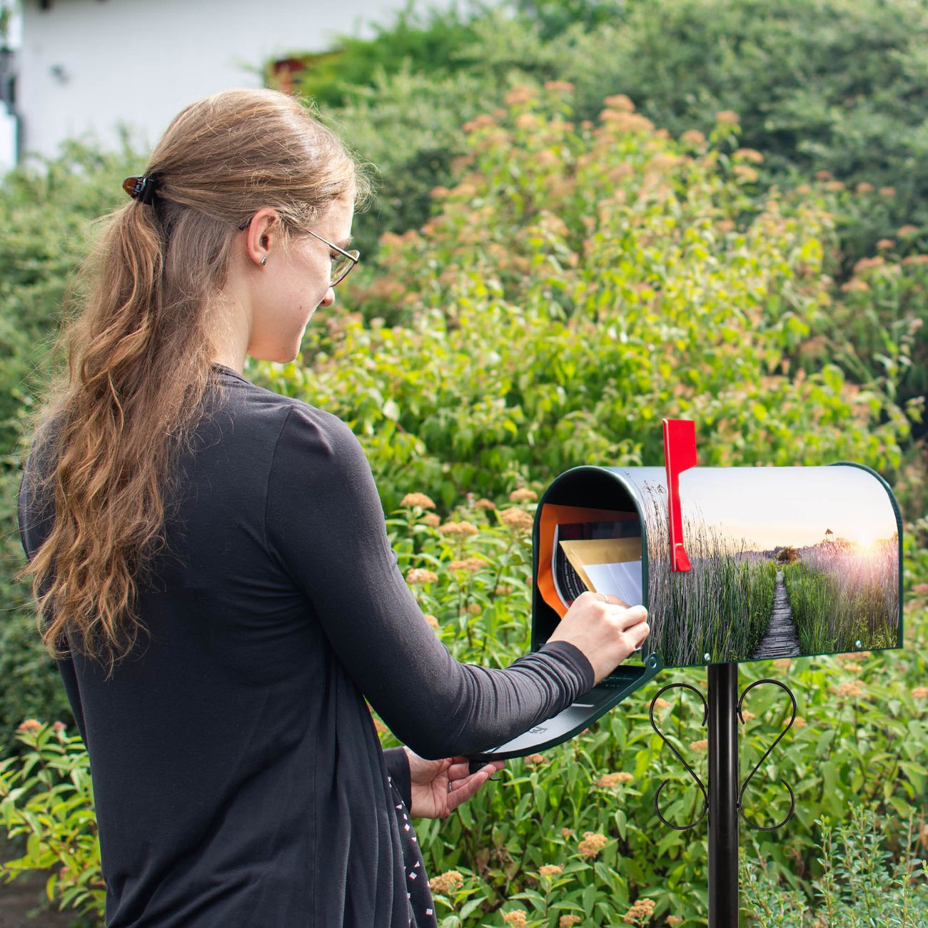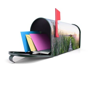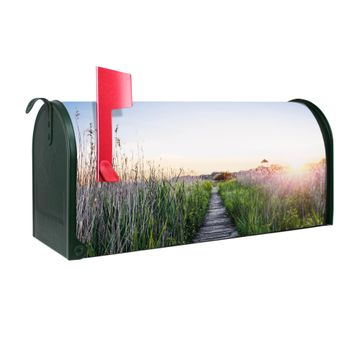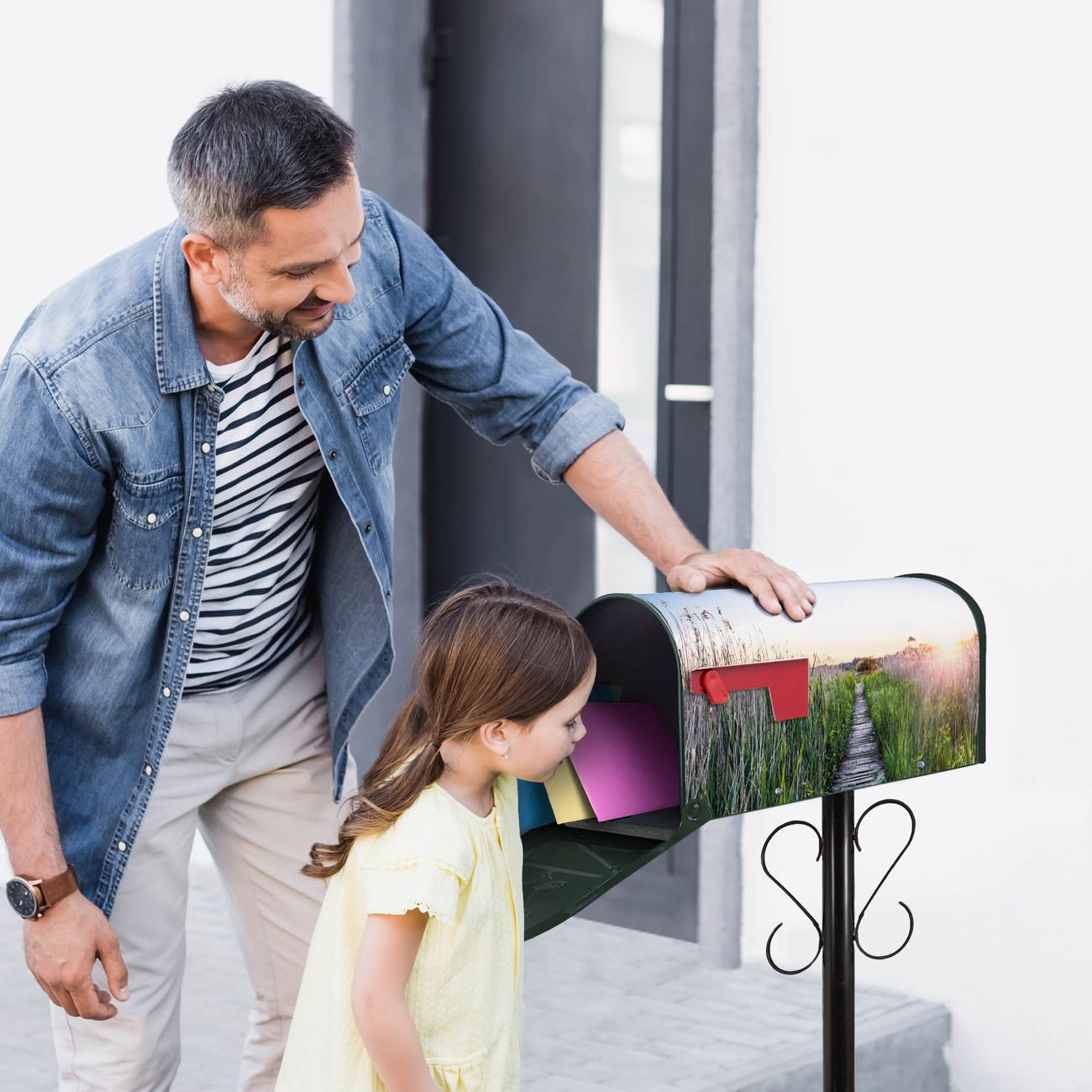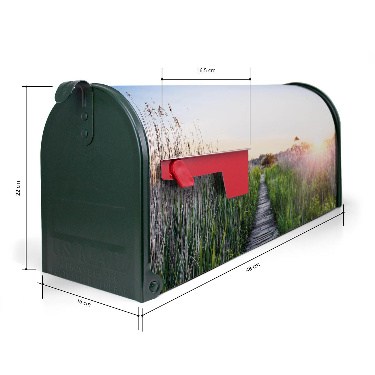 Der amerikanische Briefkasten von banjado mit Steg Durchs Schilf Motiv bietet Ihnen ausreichend Fassungsvermögen, um große A4 Sendungen und Zeitschriften zu empfangen. Die typisch amerikanische rote Fahne zeigt Ihnen an, wenn Sie Post erhalten haben. Die US-Mailbox besteht aus verzinktem Stahlblech welches lackiert wurde und ist 48 x 22 x 16 CM (BxHxT) groß. Die Folie mit Motiv Steg Durchs Schilf besteht aus einer wetter- und UV-resistenten Folie, die mit einem Schutzlaminat überzogen ist, sodass die US Mailbox zusätzlich vor Kratzern geschützt ist. An der Unterkante sind 4 Löcher je Seite um die Mailbox, typisch amerikanisch, an einem Holzpfahl oder einem Zaun zu befestigen. Auf Wunsch können Sie bei uns den passenden Standfuß oder die passende Wandhalterung kaufen um die US-Mailbox sicher zu befestigen. Wir bieten Ihnen ebenfalls Namensschilder, bereits beschriftet oder frei zu beschriften, und verschiedene selbst gestaltete Bitte-Keine-Werbung-Aufkleber.
