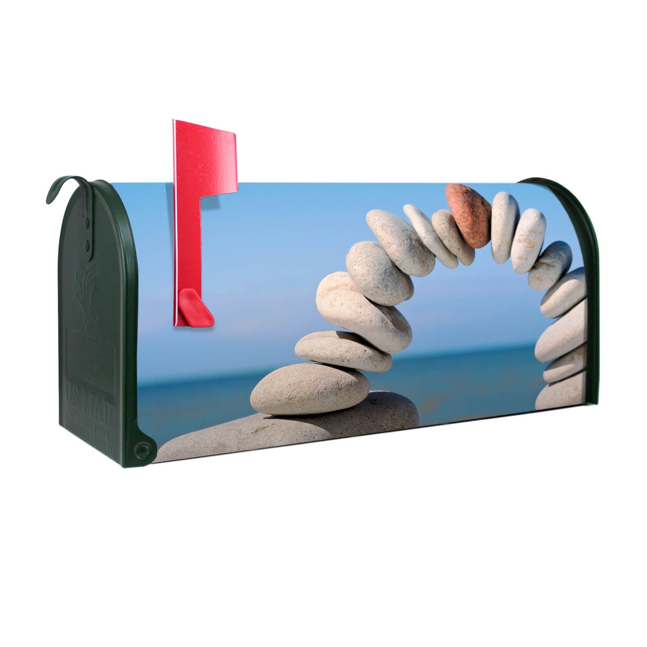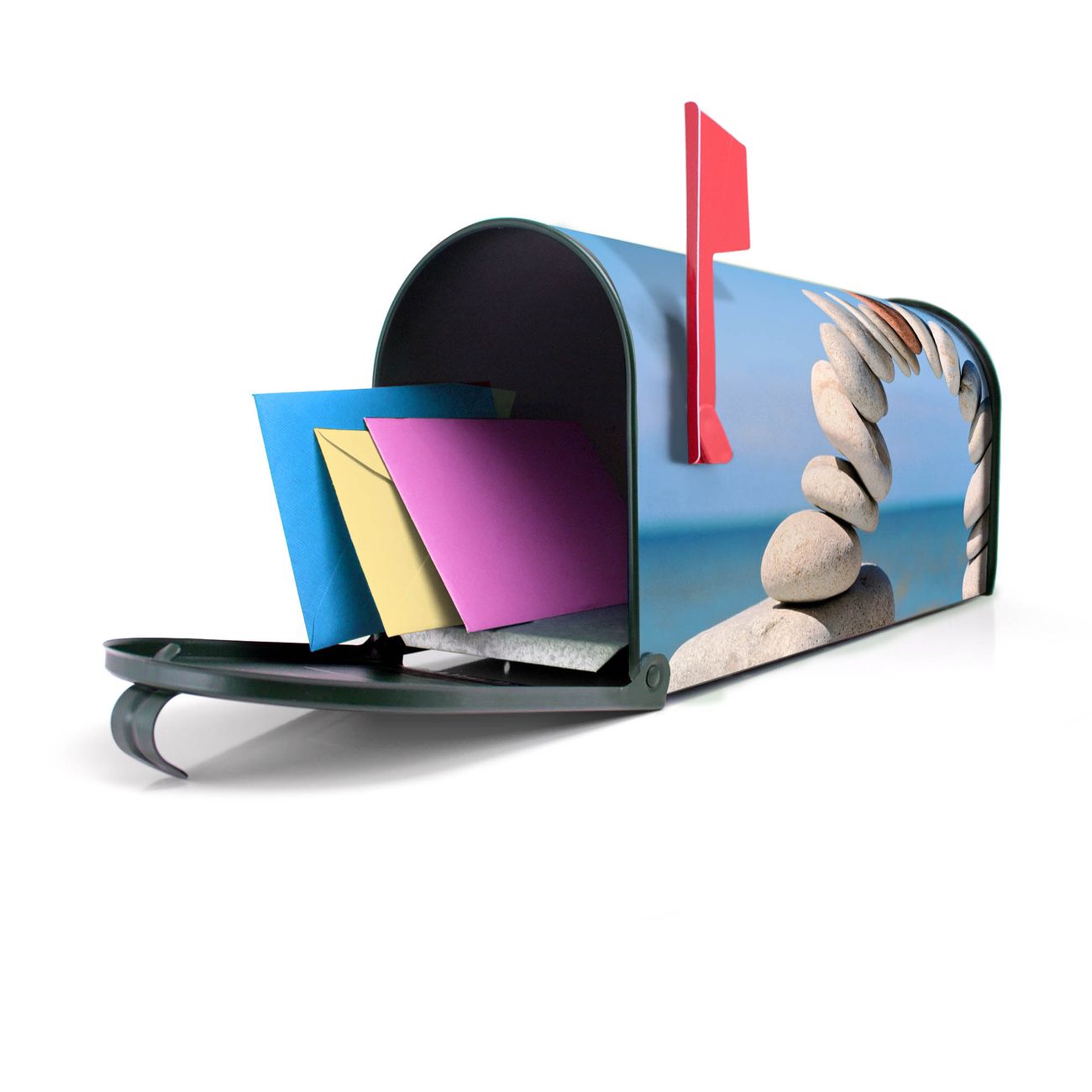 Der amerikanische Briefkasten von banjado mit Steine&Meer Motiv bietet Ihnen ausreichend Fassungsvermögen, um große A4 Sendungen und Zeitschriften zu empfangen. Die typisch amerikanische rote Fahne zeigt Ihnen an, wenn Sie Post erhalten haben. Die US-Mailbox besteht aus verzinktem Stahlblech welches lackiert wurde und ist 48 x 22 x 16 CM (BxHxT) groß. Die Folie mit Motiv Steine&Meer besteht aus einer wetter- und UV-resistenten Folie, die mit einem Schutzlaminat überzogen ist, sodass die US Mailbox zusätzlich vor Kratzern geschützt ist. An der Unterkante sind 4 Löcher je Seite um die Mailbox, typisch amerikanisch, an einem Holzpfahl oder einem Zaun zu befestigen. Auf Wunsch können Sie bei uns den passenden Standfuß oder die passende Wandhalterung kaufen um die US-Mailbox sicher zu befestigen. Wir bieten Ihnen ebenfalls Namensschilder, bereits beschriftet oder frei zu beschriften, und verschiedene selbst gestaltete Bitte-Keine-Werbung-Aufkleber.