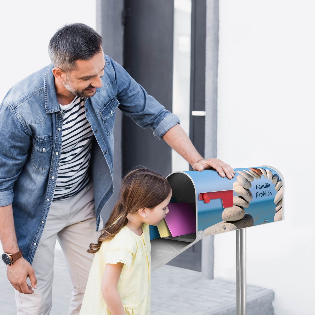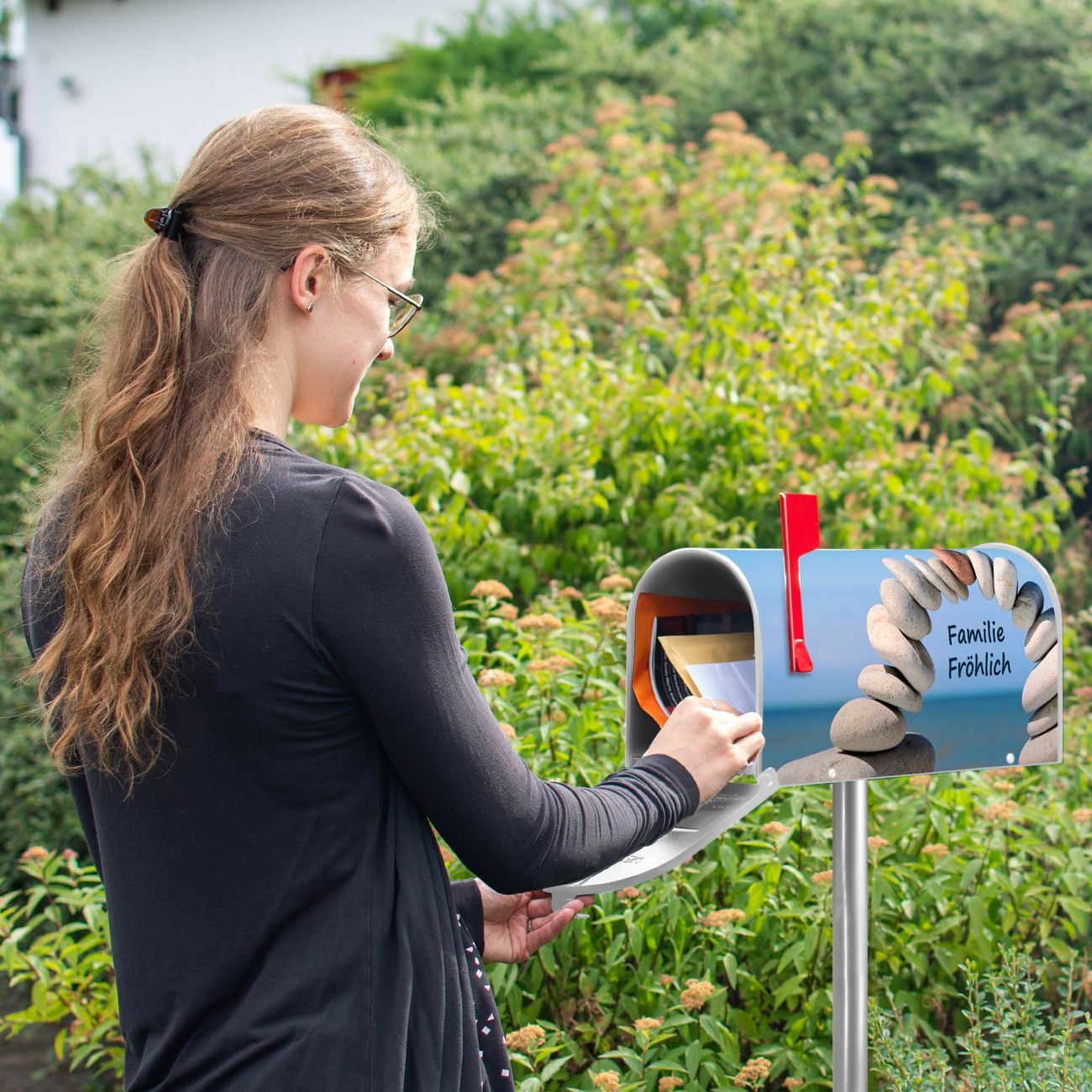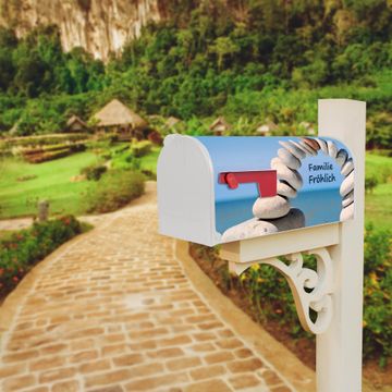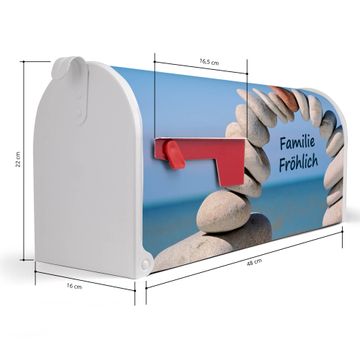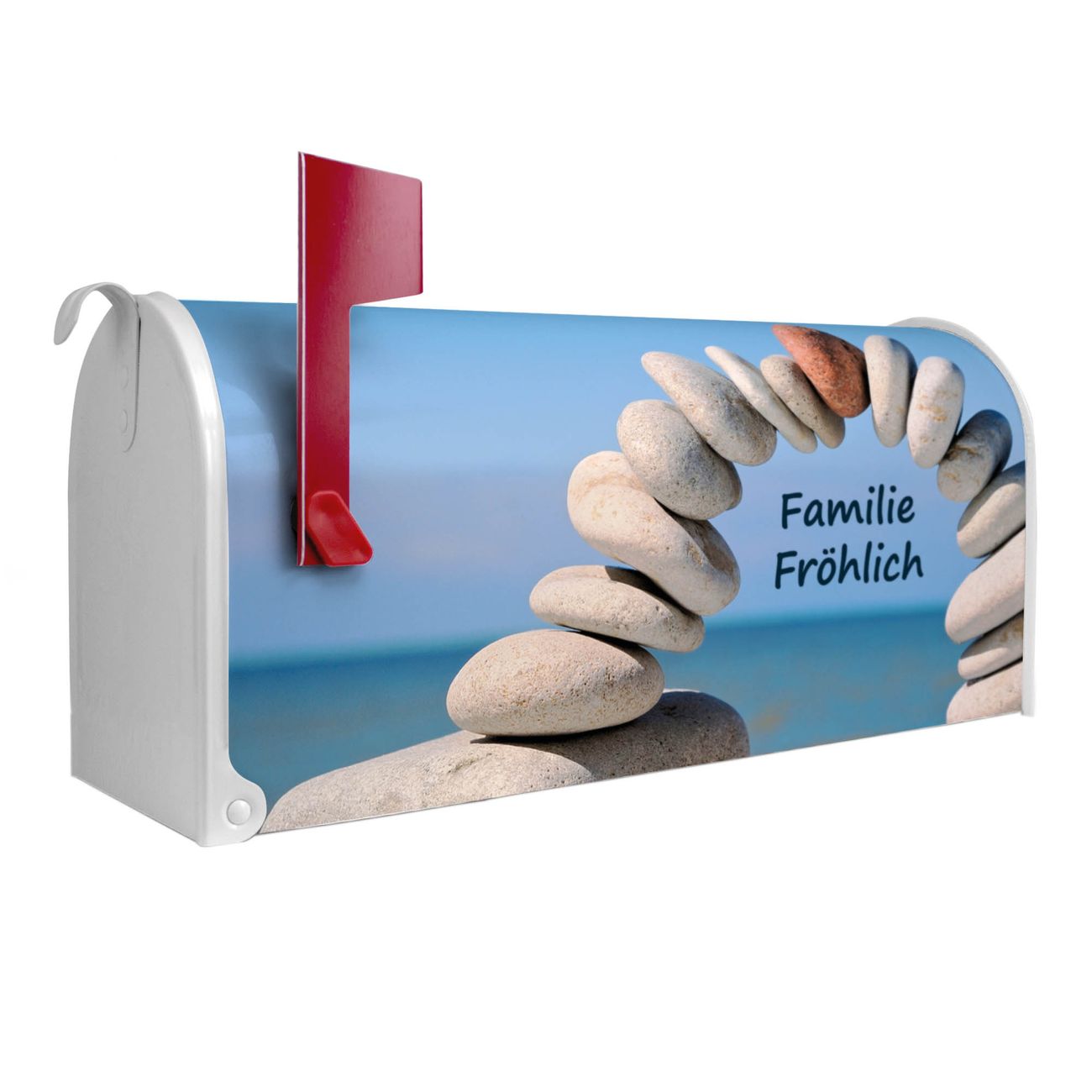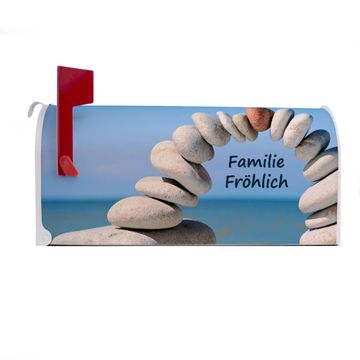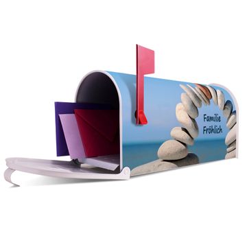 Der amerikanische Briefkasten von banjado mit Steine&Meer Motiv bietet Ihnen ausreichend Fassungsvermögen, um große A4 Sendungen und Zeitschriften zu empfangen. Die typisch amerikanische rote Fahne zeigt Ihnen an, wenn Sie Post erhalten haben. Die US-Mailbox besteht aus verzinktem Stahlblech welches lackiert wurde und ist 48 x 22 x 16 CM (BxHxT) groß. Die Folie mit Motiv Steine&Meer besteht aus einer wetter- und UV-resistenten Folie, die mit einem Schutzlaminat überzogen ist, sodass die US Mailbox zusätzlich vor Kratzern geschützt ist. An der Unterkante sind 4 Löcher je Seite um die Mailbox, typisch amerikanisch, an einem Holzpfahl oder einem Zaun zu befestigen. Auf Wunsch können Sie bei uns den passenden Standfuß oder die passende Wandhalterung kaufen um die US-Mailbox sicher zu befestigen. Wir bieten Ihnen ebenfalls Namensschilder, bereits beschriftet oder frei zu beschriften, und verschiedene selbst gestaltete Bitte-Keine-Werbung-Aufkleber.