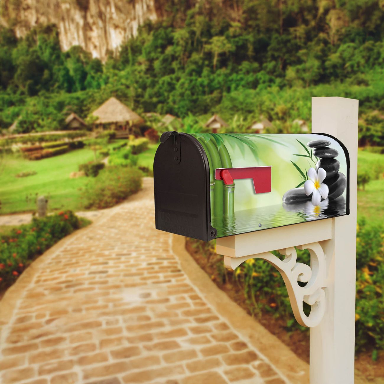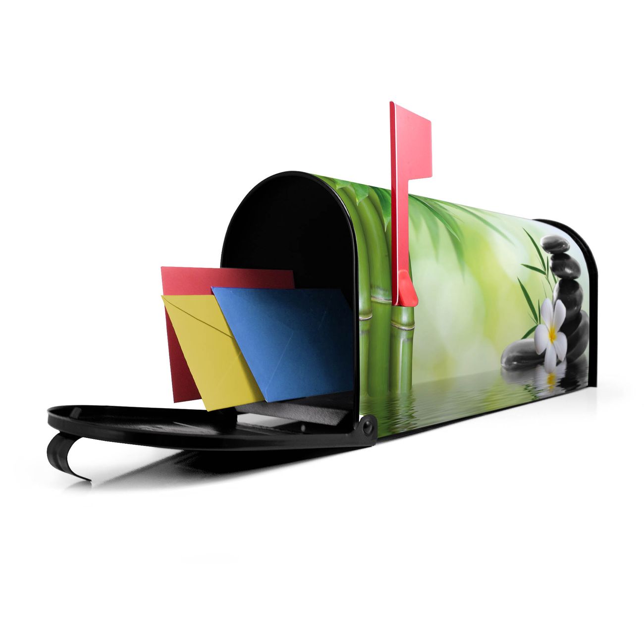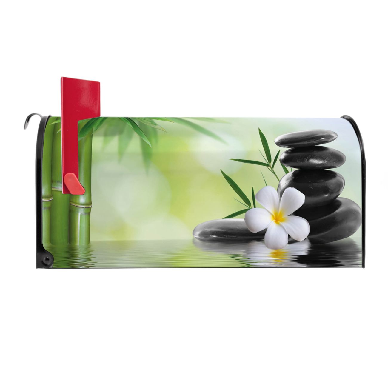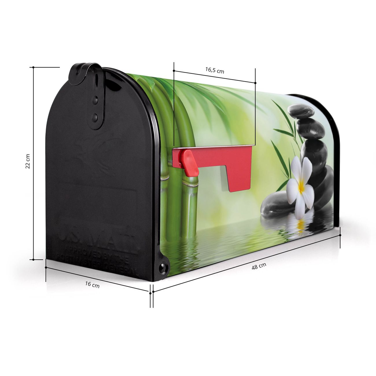 Der amerikanische Briefkasten von banjado mit Steine & Relax 6 Motiv bietet Ihnen ausreichend Fassungsvermögen, um große A4 Sendungen und Zeitschriften zu empfangen. Die typisch amerikanische rote Fahne zeigt Ihnen an, wenn Sie Post erhalten haben. Die US-Mailbox besteht aus verzinktem Stahlblech welches lackiert wurde und ist 48 x 22 x 16 CM (BxHxT) groß. Die Folie mit Motiv Steine & Relax 6 besteht aus einer wetter- und UV-resistenten Folie, die mit einem Schutzlaminat überzogen ist, sodass die US Mailbox zusätzlich vor Kratzern geschützt ist. An der Unterkante sind 4 Löcher je Seite um die Mailbox, typisch amerikanisch, an einem Holzpfahl oder einem Zaun zu befestigen. Auf Wunsch können Sie bei uns den passenden Standfuß oder die passende Wandhalterung kaufen um die US-Mailbox sicher zu befestigen. Wir bieten Ihnen ebenfalls Namensschilder, bereits beschriftet oder frei zu beschriften, und verschiedene selbst gestaltete Bitte-Keine-Werbung-Aufkleber.