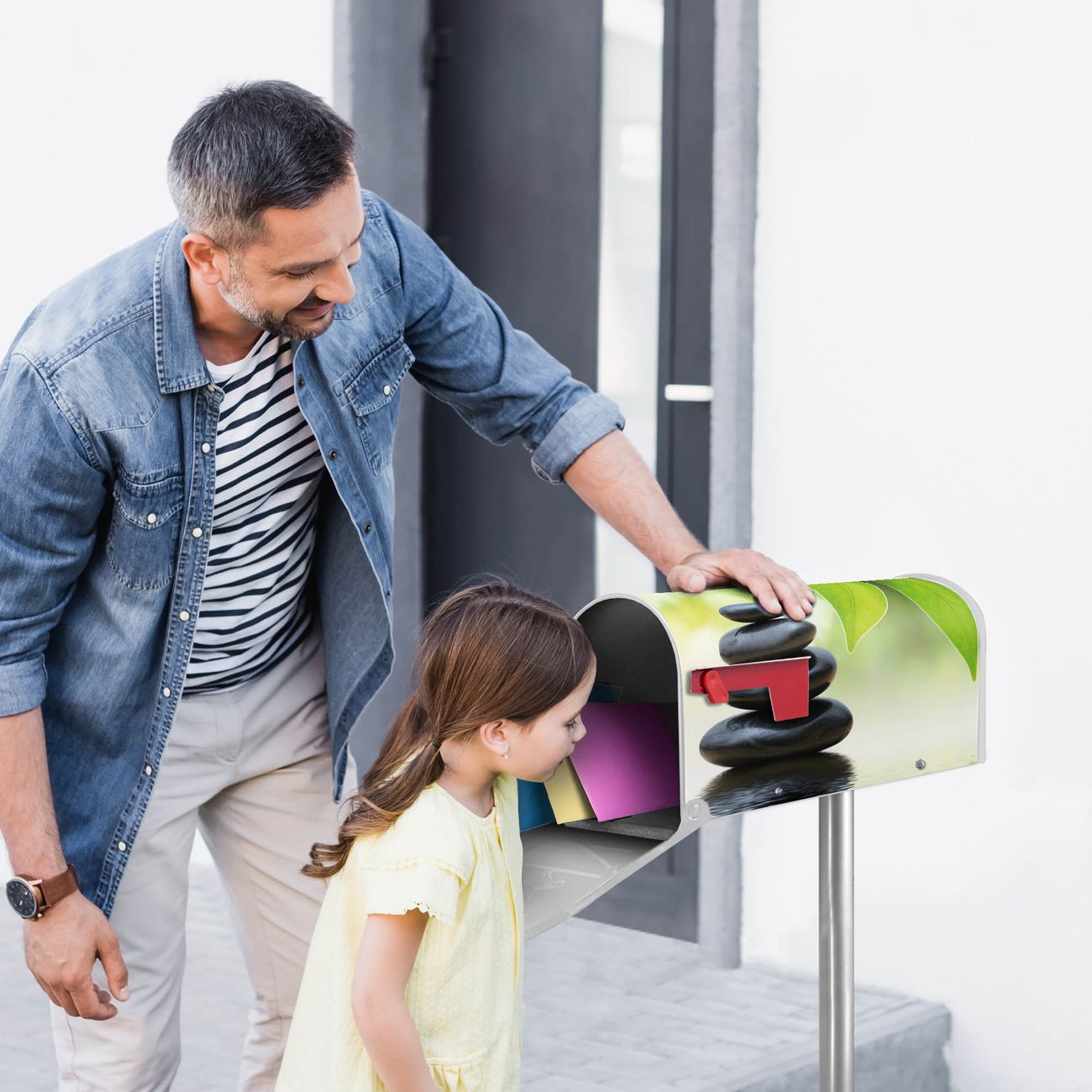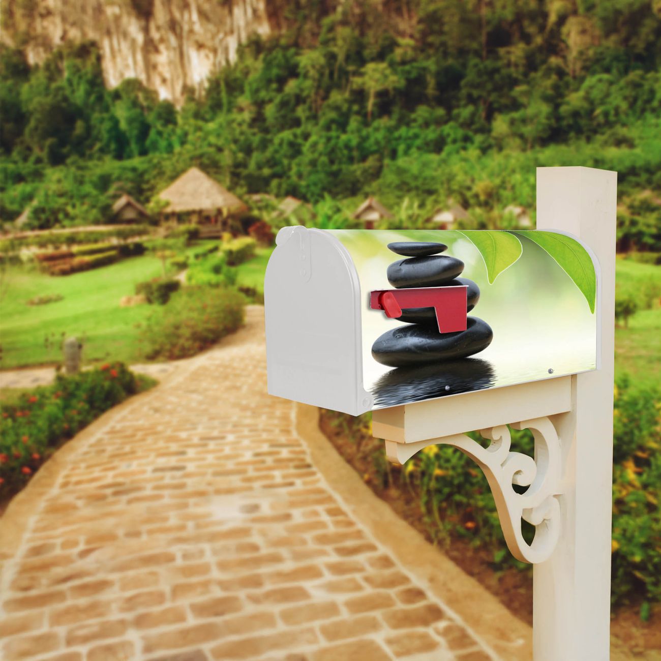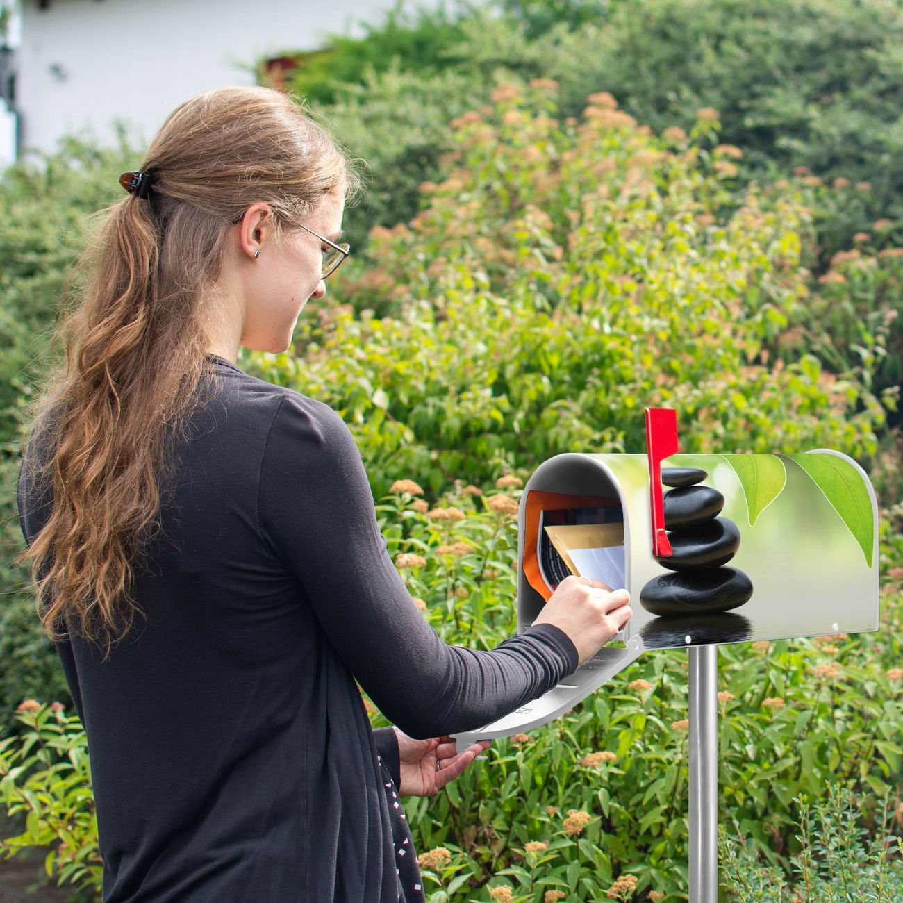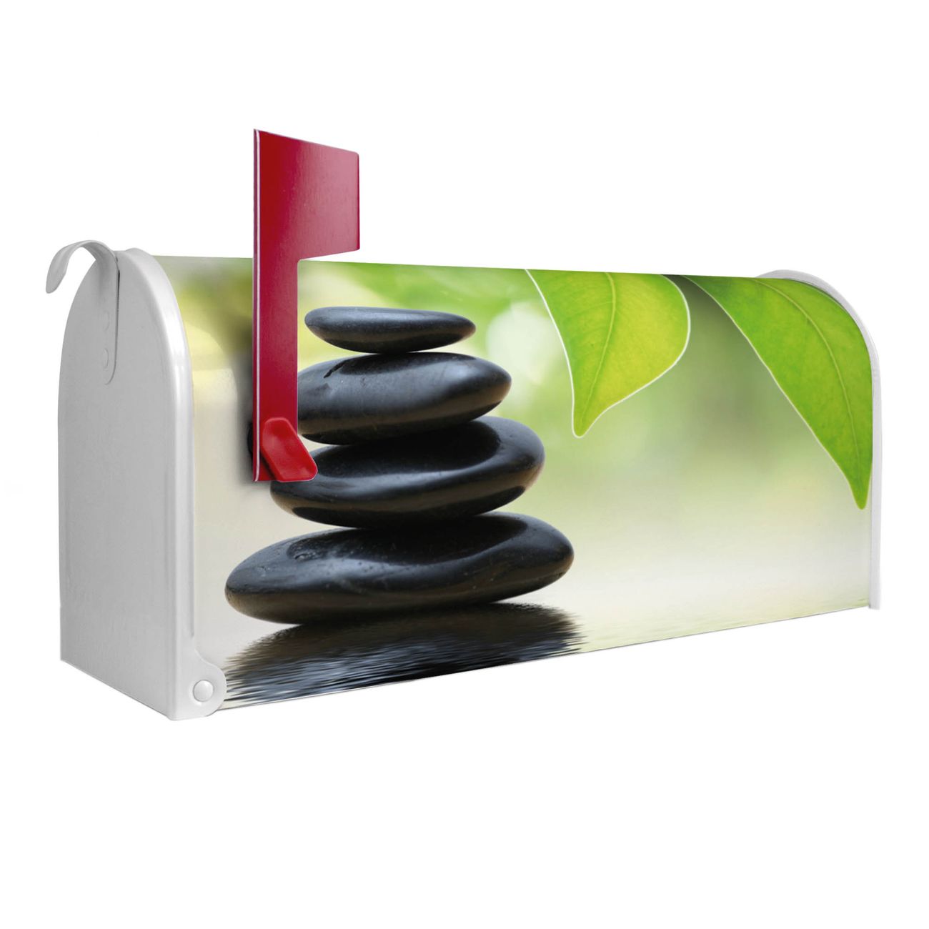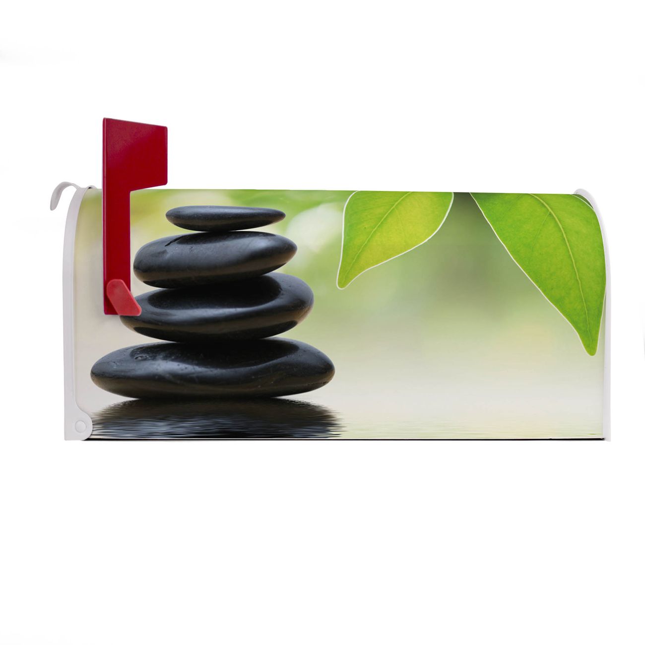 Der amerikanische Briefkasten von banjado mit Steine&Relax Motiv bietet Ihnen ausreichend Fassungsvermögen, um große A4 Sendungen und Zeitschriften zu empfangen. Die typisch amerikanische rote Fahne zeigt Ihnen an, wenn Sie Post erhalten haben. Die US-Mailbox besteht aus verzinktem Stahlblech welches lackiert wurde und ist 48 x 22 x 16 CM (BxHxT) groß. Die Folie mit Motiv Steine&Relax besteht aus einer wetter- und UV-resistenten Folie, die mit einem Schutzlaminat überzogen ist, sodass die US Mailbox zusätzlich vor Kratzern geschützt ist. An der Unterkante sind 4 Löcher je Seite um die Mailbox, typisch amerikanisch, an einem Holzpfahl oder einem Zaun zu befestigen. Auf Wunsch können Sie bei uns den passenden Standfuß oder die passende Wandhalterung kaufen um die US-Mailbox sicher zu befestigen. Wir bieten Ihnen ebenfalls Namensschilder, bereits beschriftet oder frei zu beschriften, und verschiedene selbst gestaltete Bitte-Keine-Werbung-Aufkleber.