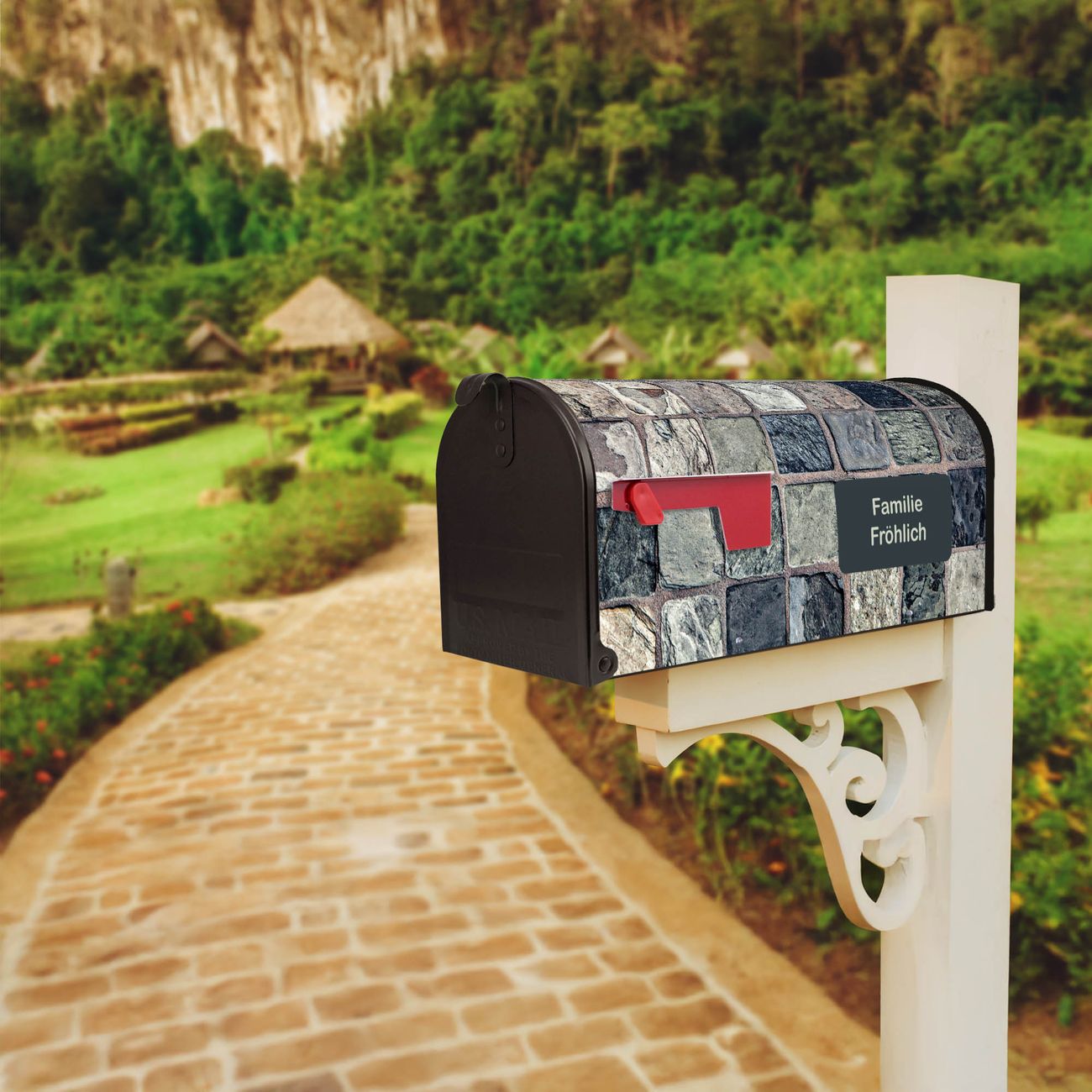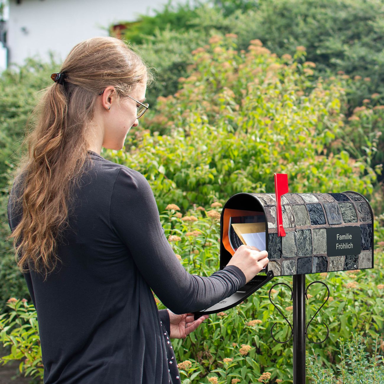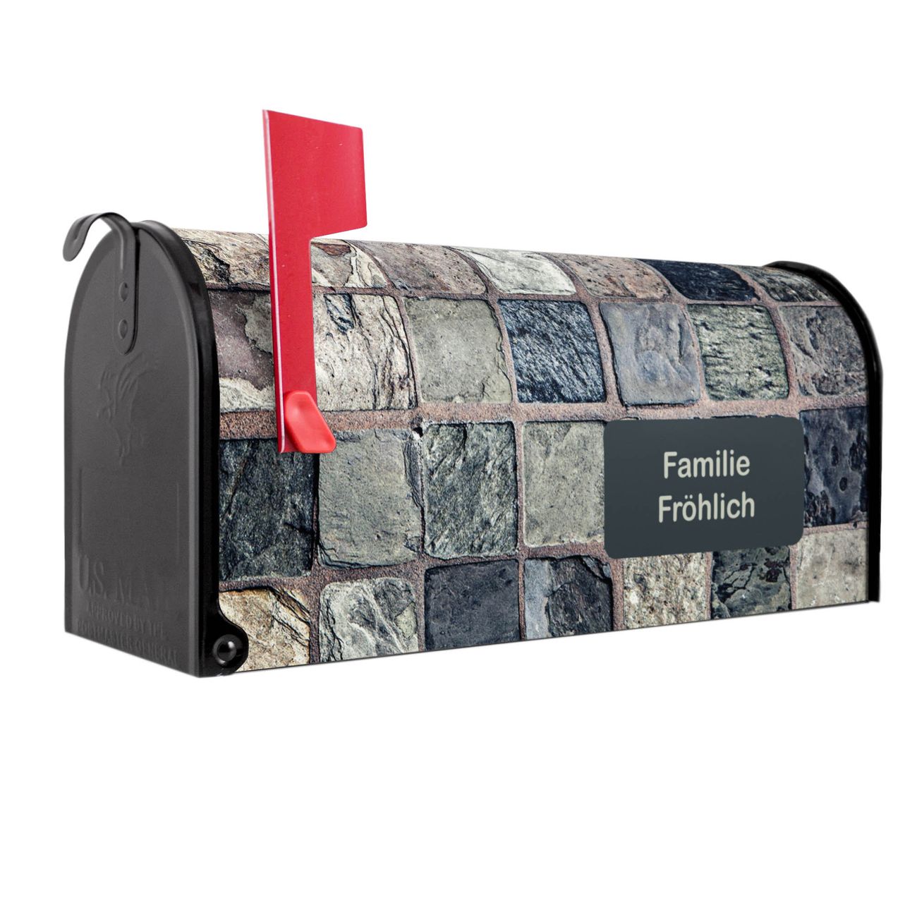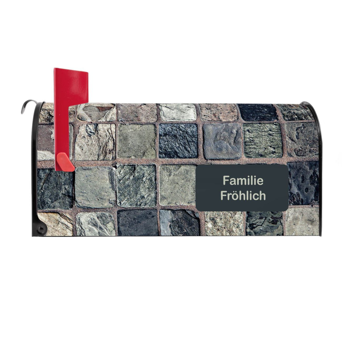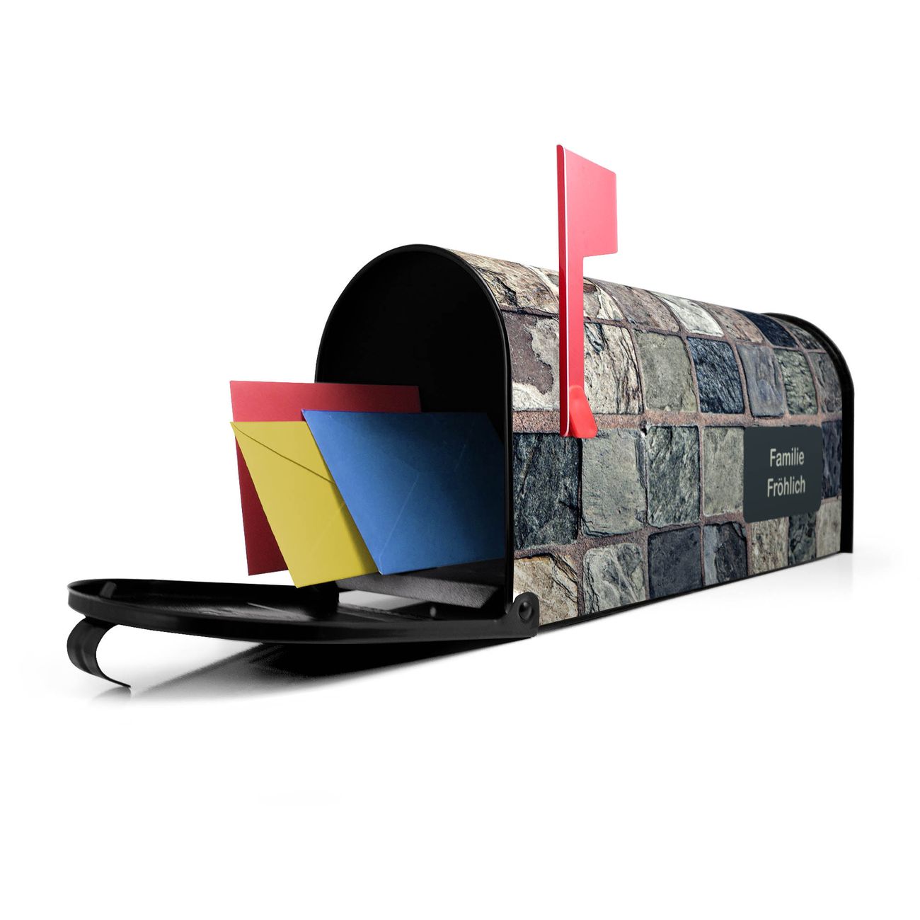 Der amerikanische Briefkasten von banjado mit Steinfliesen Motiv bietet Ihnen ausreichend Fassungsvermögen, um große A4 Sendungen und Zeitschriften zu empfangen. Die typisch amerikanische rote Fahne zeigt Ihnen an, wenn Sie Post erhalten haben. Die US-Mailbox besteht aus verzinktem Stahlblech welches lackiert wurde und ist 48 x 22 x 16 CM (BxHxT) groß. Die Folie mit Motiv Steinfliesen besteht aus einer wetter- und UV-resistenten Folie, die mit einem Schutzlaminat überzogen ist, sodass die US Mailbox zusätzlich vor Kratzern geschützt ist. An der Unterkante sind 4 Löcher je Seite um die Mailbox, typisch amerikanisch, an einem Holzpfahl oder einem Zaun zu befestigen. Auf Wunsch können Sie bei uns den passenden Standfuß oder die passende Wandhalterung kaufen um die US-Mailbox sicher zu befestigen. Wir bieten Ihnen ebenfalls Namensschilder, bereits beschriftet oder frei zu beschriften, und verschiedene selbst gestaltete Bitte-Keine-Werbung-Aufkleber.