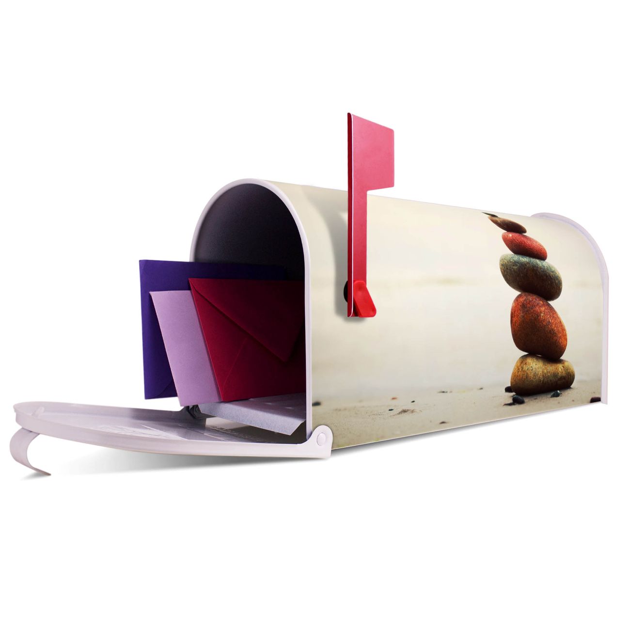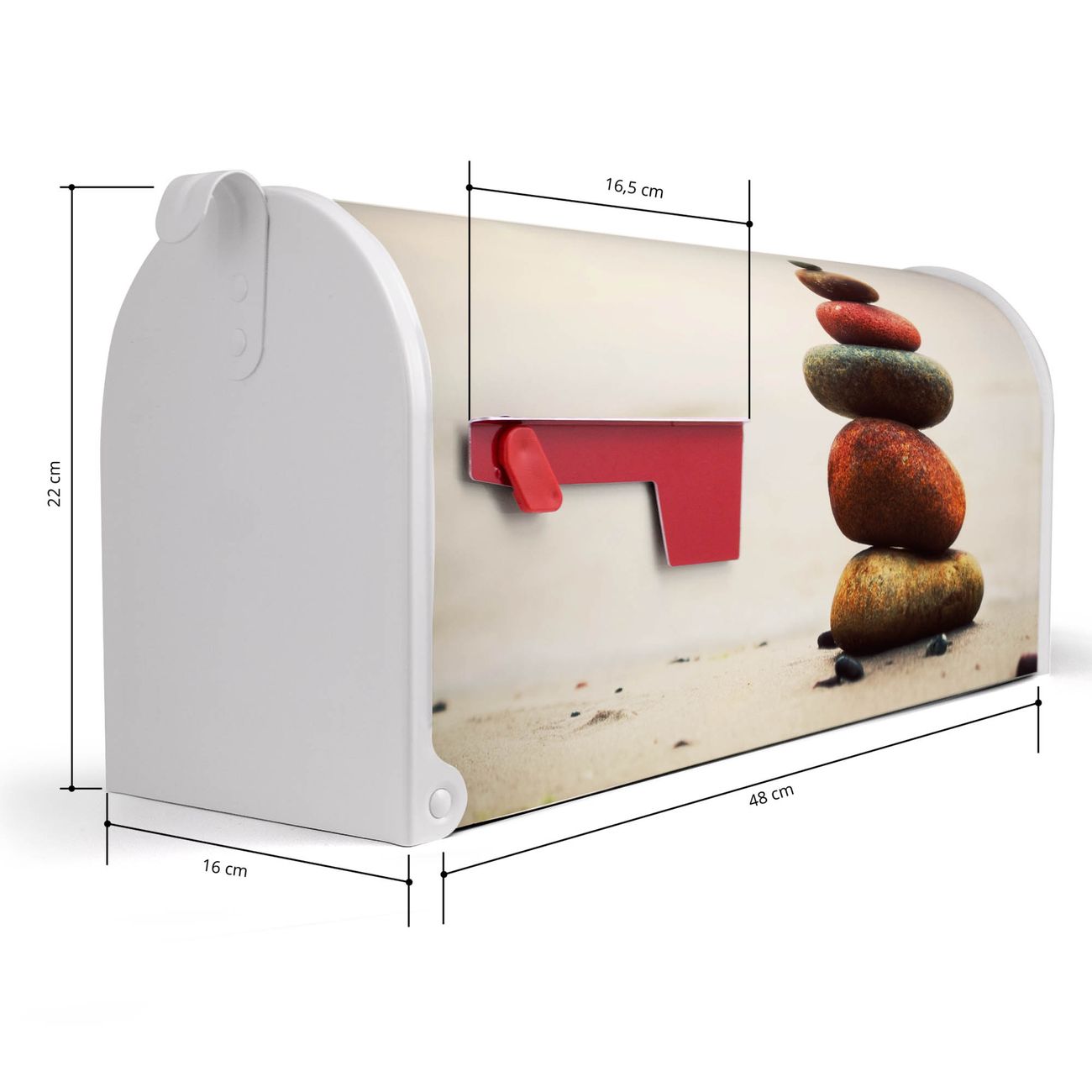 Der amerikanische Briefkasten von banjado mit Steinmännchen Motiv bietet Ihnen ausreichend Fassungsvermögen, um große A4 Sendungen und Zeitschriften zu empfangen. Die typisch amerikanische rote Fahne zeigt Ihnen an, wenn Sie Post erhalten haben. Die US-Mailbox besteht aus verzinktem Stahlblech welches lackiert wurde und ist 48 x 22 x 16 CM (BxHxT) groß. Die Folie mit Motiv Steinmännchen besteht aus einer wetter- und UV-resistenten Folie, die mit einem Schutzlaminat überzogen ist, sodass die US Mailbox zusätzlich vor Kratzern geschützt ist. An der Unterkante sind 4 Löcher je Seite um die Mailbox, typisch amerikanisch, an einem Holzpfahl oder einem Zaun zu befestigen. Auf Wunsch können Sie bei uns den passenden Standfuß oder die passende Wandhalterung kaufen um die US-Mailbox sicher zu befestigen. Wir bieten Ihnen ebenfalls Namensschilder, bereits beschriftet oder frei zu beschriften, und verschiedene selbst gestaltete Bitte-Keine-Werbung-Aufkleber.