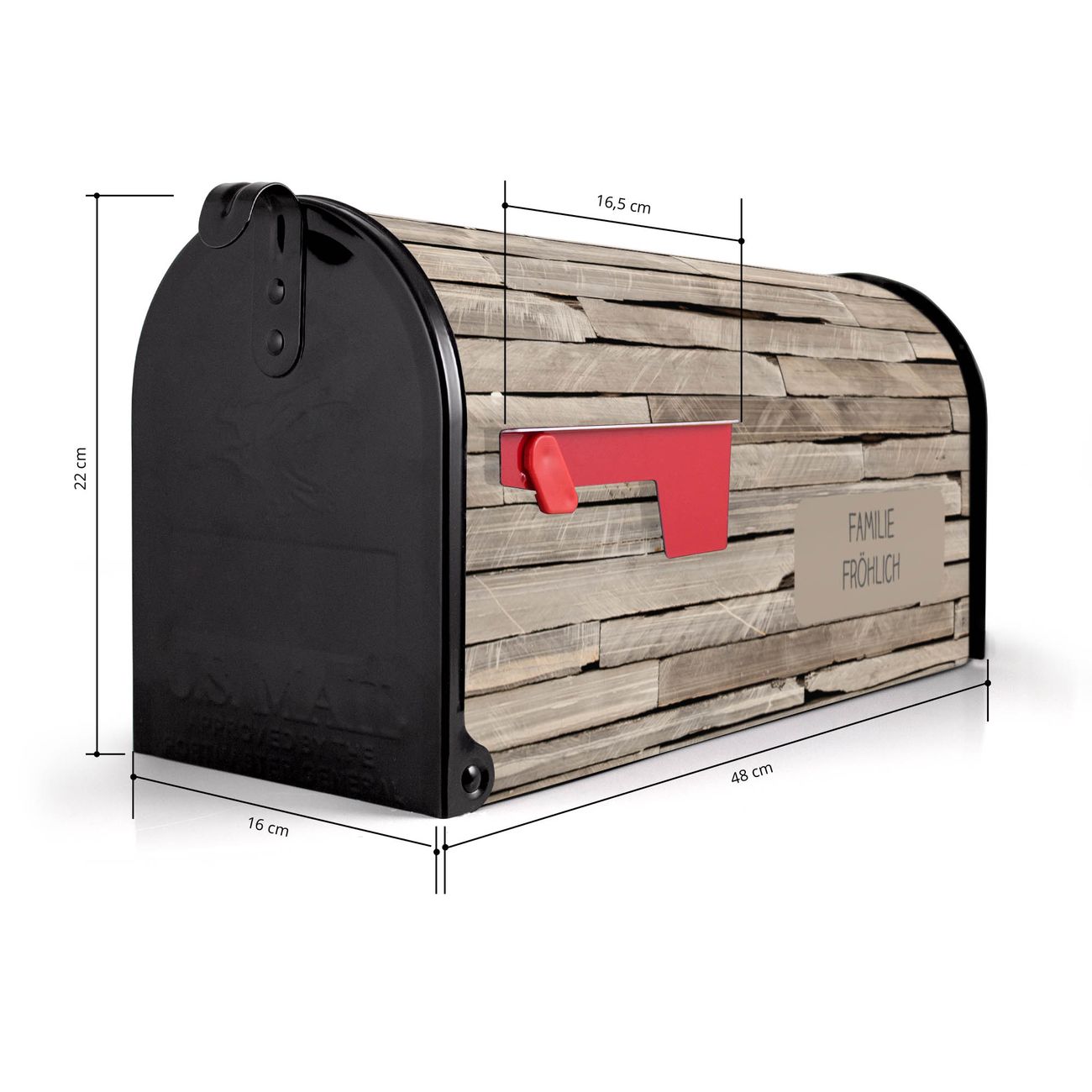 Der amerikanische Briefkasten von banjado mit Steinplatten Motiv bietet Ihnen ausreichend Fassungsvermögen, um große A4 Sendungen und Zeitschriften zu empfangen. Die typisch amerikanische rote Fahne zeigt Ihnen an, wenn Sie Post erhalten haben. Die US-Mailbox besteht aus verzinktem Stahlblech welches lackiert wurde und ist 48 x 22 x 16 CM (BxHxT) groß. Die Folie mit Motiv Steinplatten besteht aus einer wetter- und UV-resistenten Folie, die mit einem Schutzlaminat überzogen ist, sodass die US Mailbox zusätzlich vor Kratzern geschützt ist. An der Unterkante sind 4 Löcher je Seite um die Mailbox, typisch amerikanisch, an einem Holzpfahl oder einem Zaun zu befestigen. Auf Wunsch können Sie bei uns den passenden Standfuß oder die passende Wandhalterung kaufen um die US-Mailbox sicher zu befestigen. Wir bieten Ihnen ebenfalls Namensschilder, bereits beschriftet oder frei zu beschriften, und verschiedene selbst gestaltete Bitte-Keine-Werbung-Aufkleber.