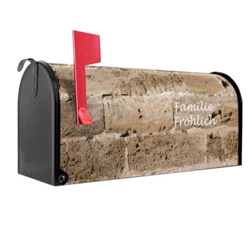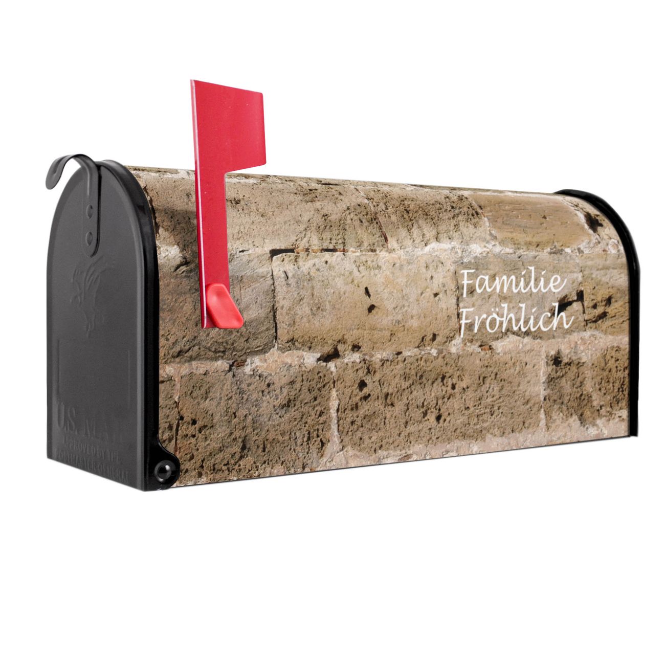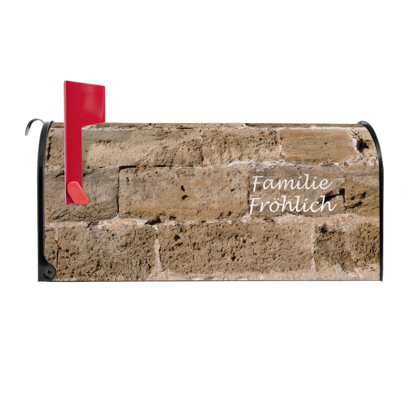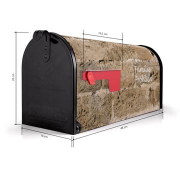 Der amerikanische Briefkasten von banjado mit Steinwand Antik Motiv bietet Ihnen ausreichend Fassungsvermögen, um große A4 Sendungen und Zeitschriften zu empfangen. Die typisch amerikanische rote Fahne zeigt Ihnen an, wenn Sie Post erhalten haben. Die US-Mailbox besteht aus verzinktem Stahlblech welches lackiert wurde und ist 48 x 22 x 16 CM (BxHxT) groß. Die Folie mit Motiv Steinwand Antik besteht aus einer wetter- und UV-resistenten Folie, die mit einem Schutzlaminat überzogen ist, sodass die US Mailbox zusätzlich vor Kratzern geschützt ist. An der Unterkante sind 4 Löcher je Seite um die Mailbox, typisch amerikanisch, an einem Holzpfahl oder einem Zaun zu befestigen. Auf Wunsch können Sie bei uns den passenden Standfuß oder die passende Wandhalterung kaufen um die US-Mailbox sicher zu befestigen. Wir bieten Ihnen ebenfalls Namensschilder, bereits beschriftet oder frei zu beschriften, und verschiedene selbst gestaltete Bitte-Keine-Werbung-Aufkleber.