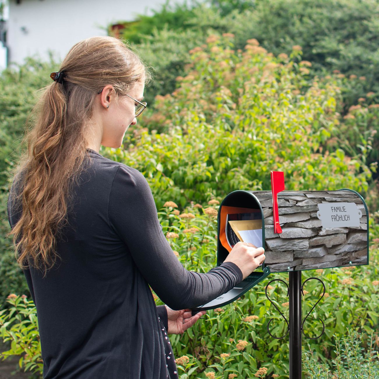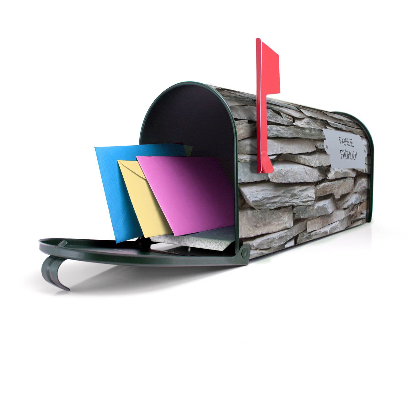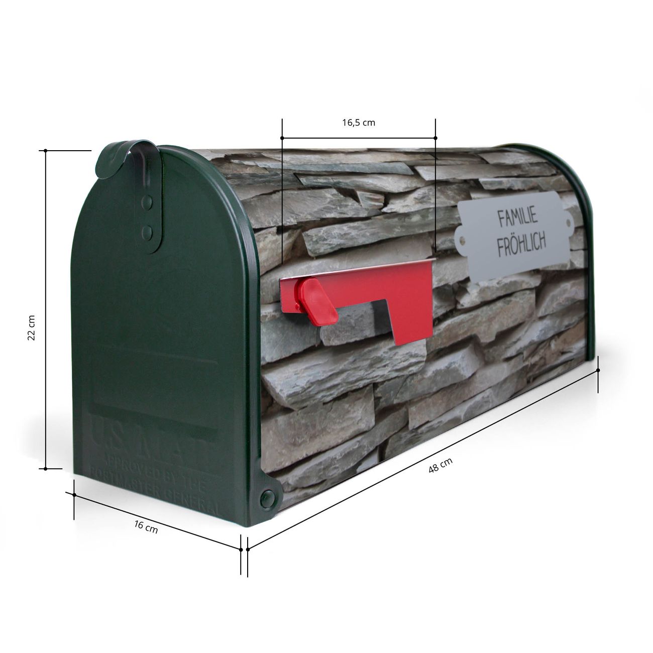 Der amerikanische Briefkasten von banjado mit Steinwand Motiv bietet Ihnen ausreichend Fassungsvermögen, um große A4 Sendungen und Zeitschriften zu empfangen. Die typisch amerikanische rote Fahne zeigt Ihnen an, wenn Sie Post erhalten haben. Die US-Mailbox besteht aus verzinktem Stahlblech welches lackiert wurde und ist 48 x 22 x 16 CM (BxHxT) groß. Die Folie mit Motiv Steinwand besteht aus einer wetter- und UV-resistenten Folie, die mit einem Schutzlaminat überzogen ist, sodass die US Mailbox zusätzlich vor Kratzern geschützt ist. An der Unterkante sind 4 Löcher je Seite um die Mailbox, typisch amerikanisch, an einem Holzpfahl oder einem Zaun zu befestigen. Auf Wunsch können Sie bei uns den passenden Standfuß oder die passende Wandhalterung kaufen um die US-Mailbox sicher zu befestigen. Wir bieten Ihnen ebenfalls Namensschilder, bereits beschriftet oder frei zu beschriften, und verschiedene selbst gestaltete Bitte-Keine-Werbung-Aufkleber.