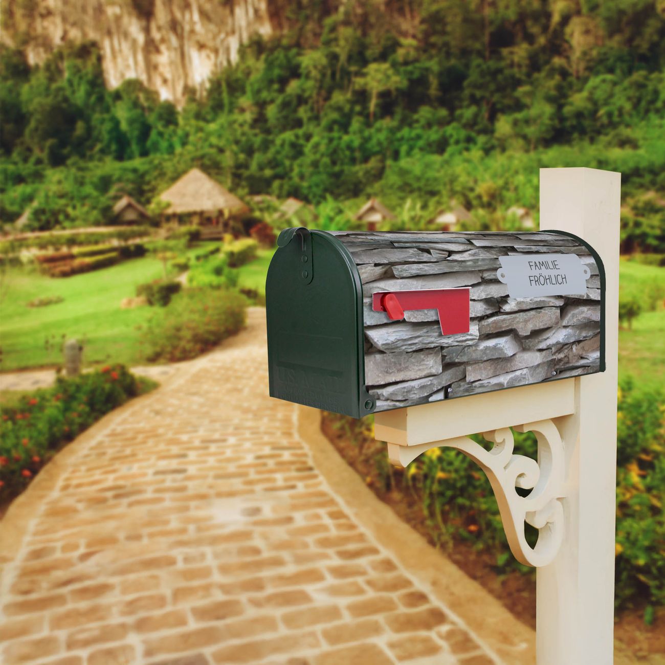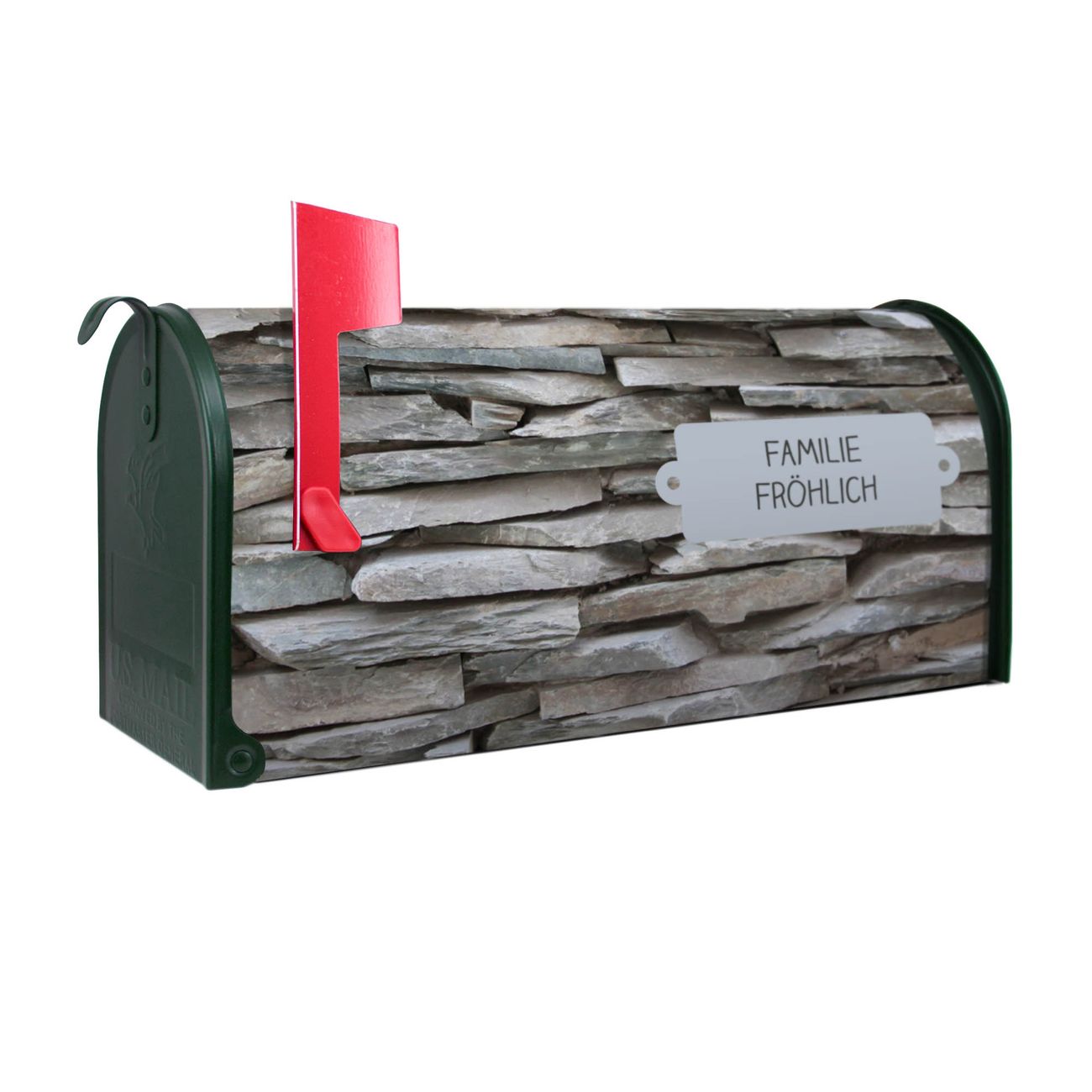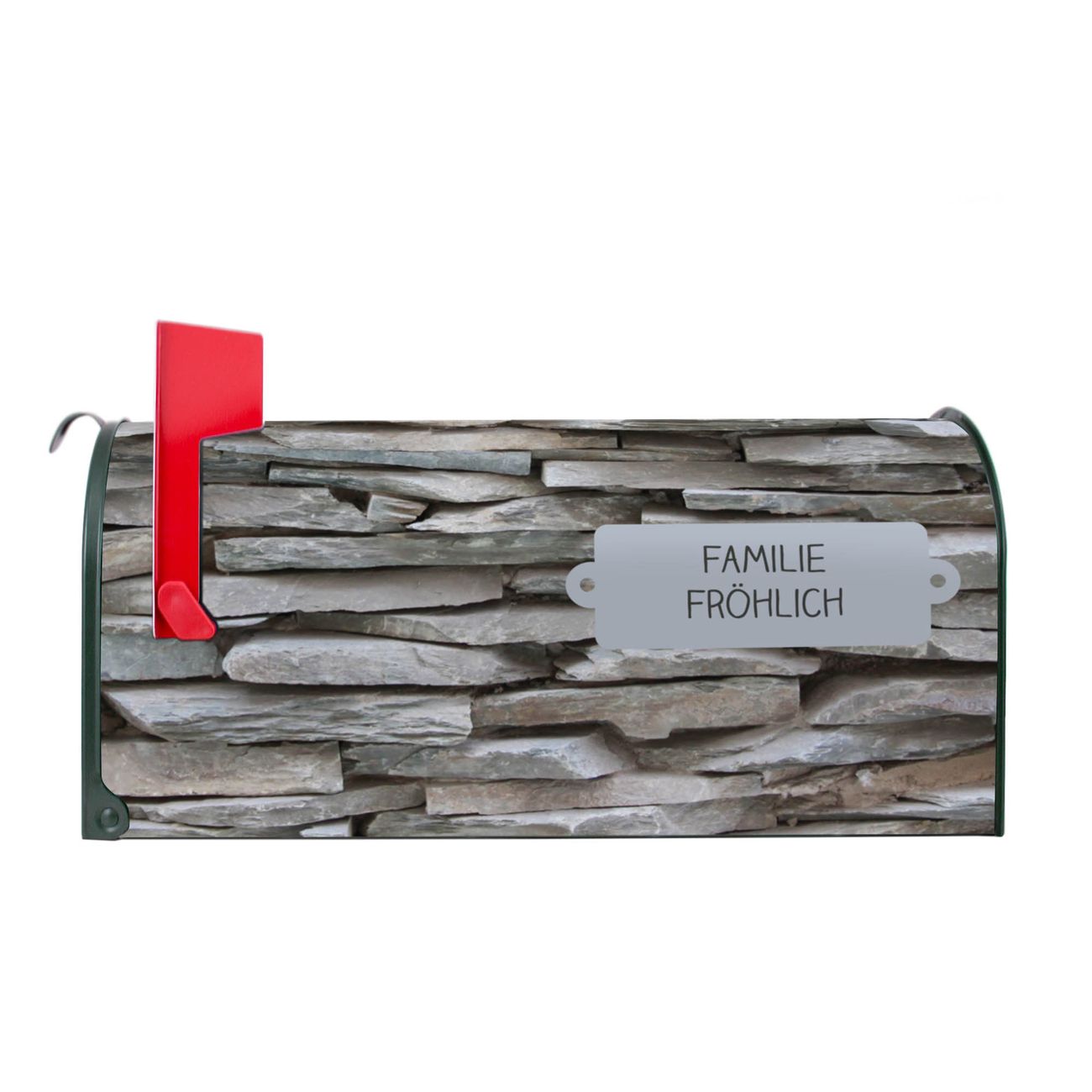 Der amerikanische Briefkasten von banjado mit Steinwand Motiv bietet Ihnen ausreichend Fassungsvermögen, um große A4 Sendungen und Zeitschriften zu empfangen. Die typisch amerikanische rote Fahne zeigt Ihnen an, wenn Sie Post erhalten haben. Die US-Mailbox besteht aus verzinktem Stahlblech welches lackiert wurde und ist 48 x 22 x 16 CM (BxHxT) groß. Die Folie mit Motiv Steinwand besteht aus einer wetter- und UV-resistenten Folie, die mit einem Schutzlaminat überzogen ist, sodass die US Mailbox zusätzlich vor Kratzern geschützt ist. An der Unterkante sind 4 Löcher je Seite um die Mailbox, typisch amerikanisch, an einem Holzpfahl oder einem Zaun zu befestigen. Auf Wunsch können Sie bei uns den passenden Standfuß oder die passende Wandhalterung kaufen um die US-Mailbox sicher zu befestigen. Wir bieten Ihnen ebenfalls Namensschilder, bereits beschriftet oder frei zu beschriften, und verschiedene selbst gestaltete Bitte-Keine-Werbung-Aufkleber.