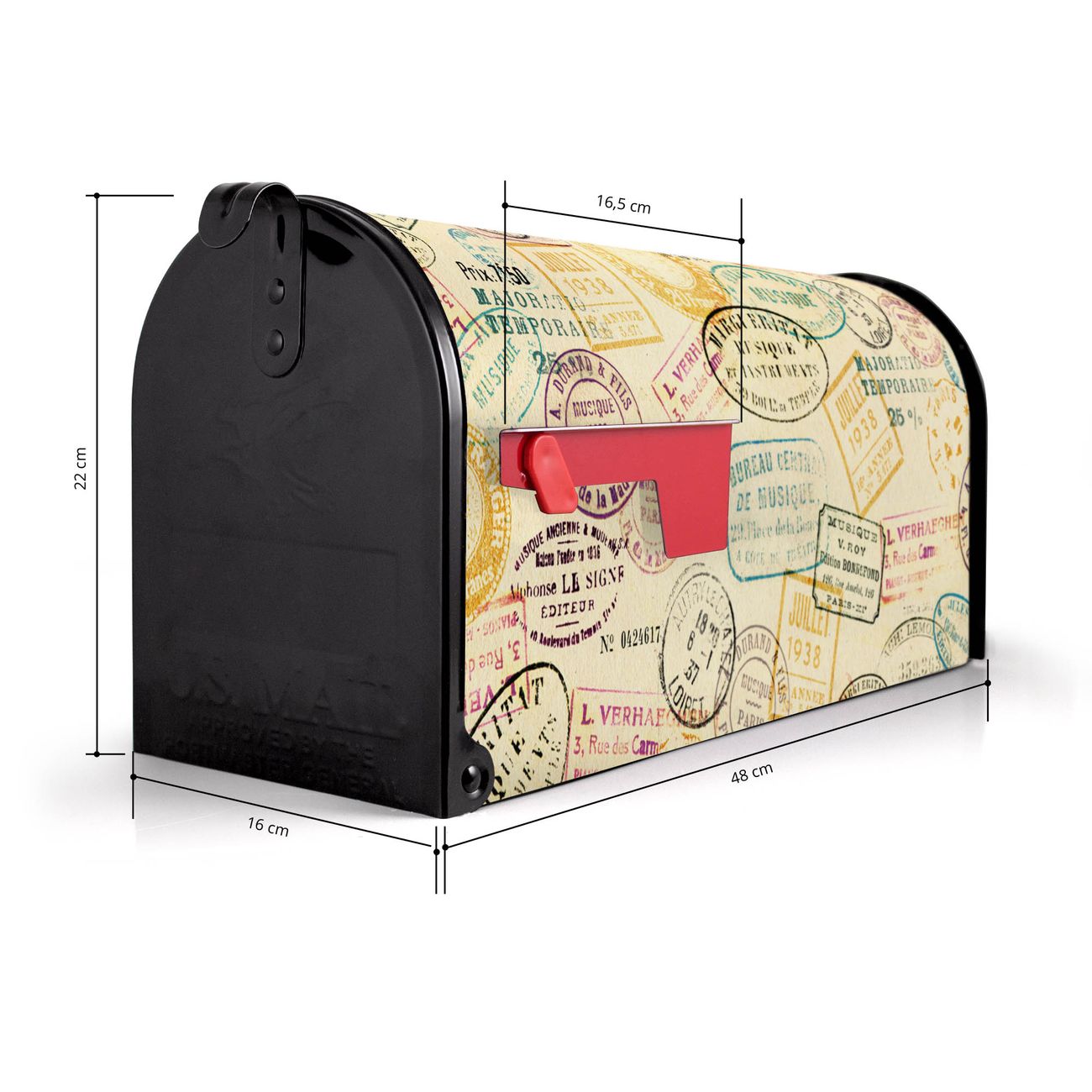 Der amerikanische Briefkasten von banjado mit Stempel Motiv bietet Ihnen ausreichend Fassungsvermögen, um große A4 Sendungen und Zeitschriften zu empfangen. Die typisch amerikanische rote Fahne zeigt Ihnen an, wenn Sie Post erhalten haben. Die US-Mailbox besteht aus verzinktem Stahlblech welches lackiert wurde und ist 48 x 22 x 16 CM (BxHxT) groß. Die Folie mit Motiv Stempel besteht aus einer wetter- und UV-resistenten Folie, die mit einem Schutzlaminat überzogen ist, sodass die US Mailbox zusätzlich vor Kratzern geschützt ist. An der Unterkante sind 4 Löcher je Seite um die Mailbox, typisch amerikanisch, an einem Holzpfahl oder einem Zaun zu befestigen. Auf Wunsch können Sie bei uns den passenden Standfuß oder die passende Wandhalterung kaufen um die US-Mailbox sicher zu befestigen. Wir bieten Ihnen ebenfalls Namensschilder, bereits beschriftet oder frei zu beschriften, und verschiedene selbst gestaltete Bitte-Keine-Werbung-Aufkleber.