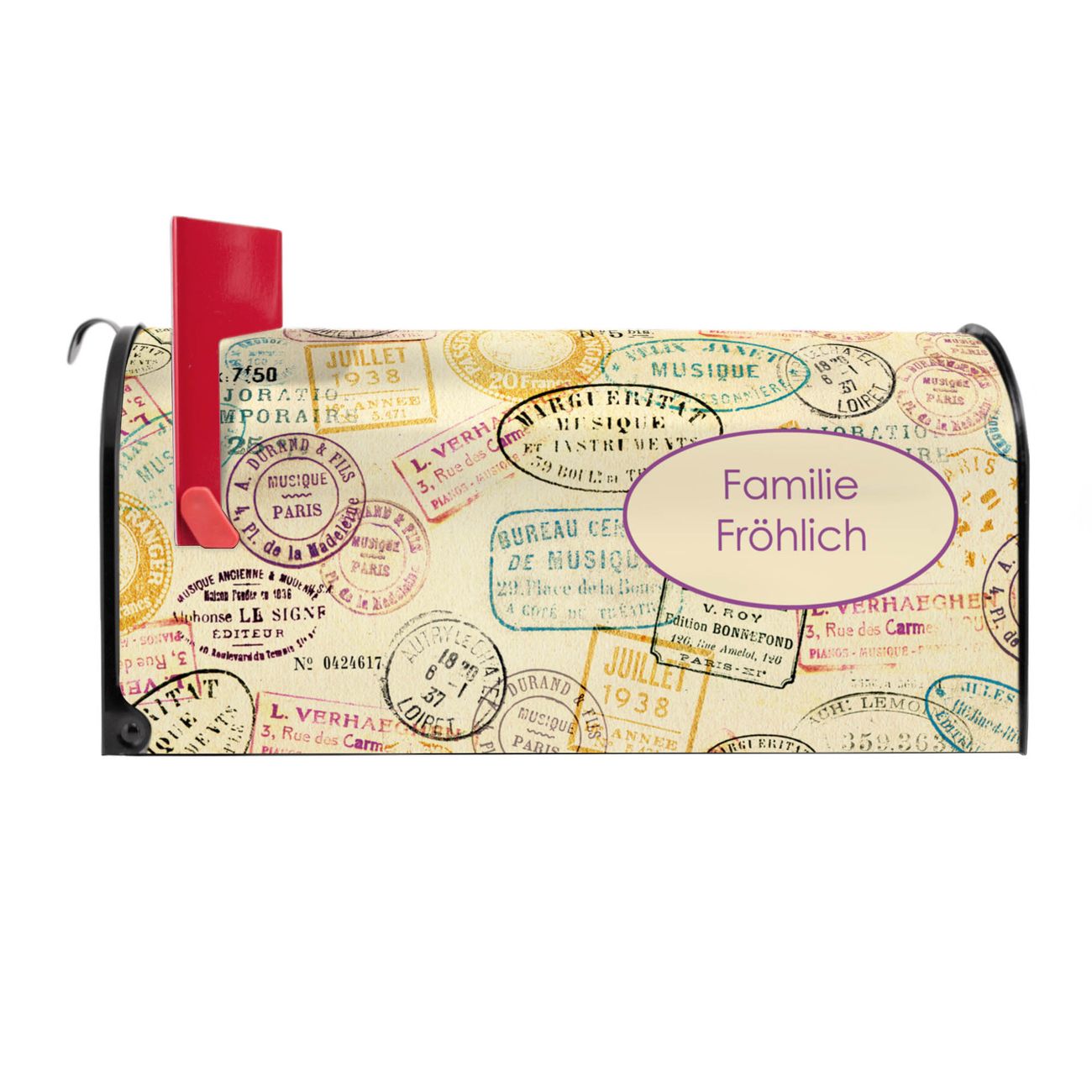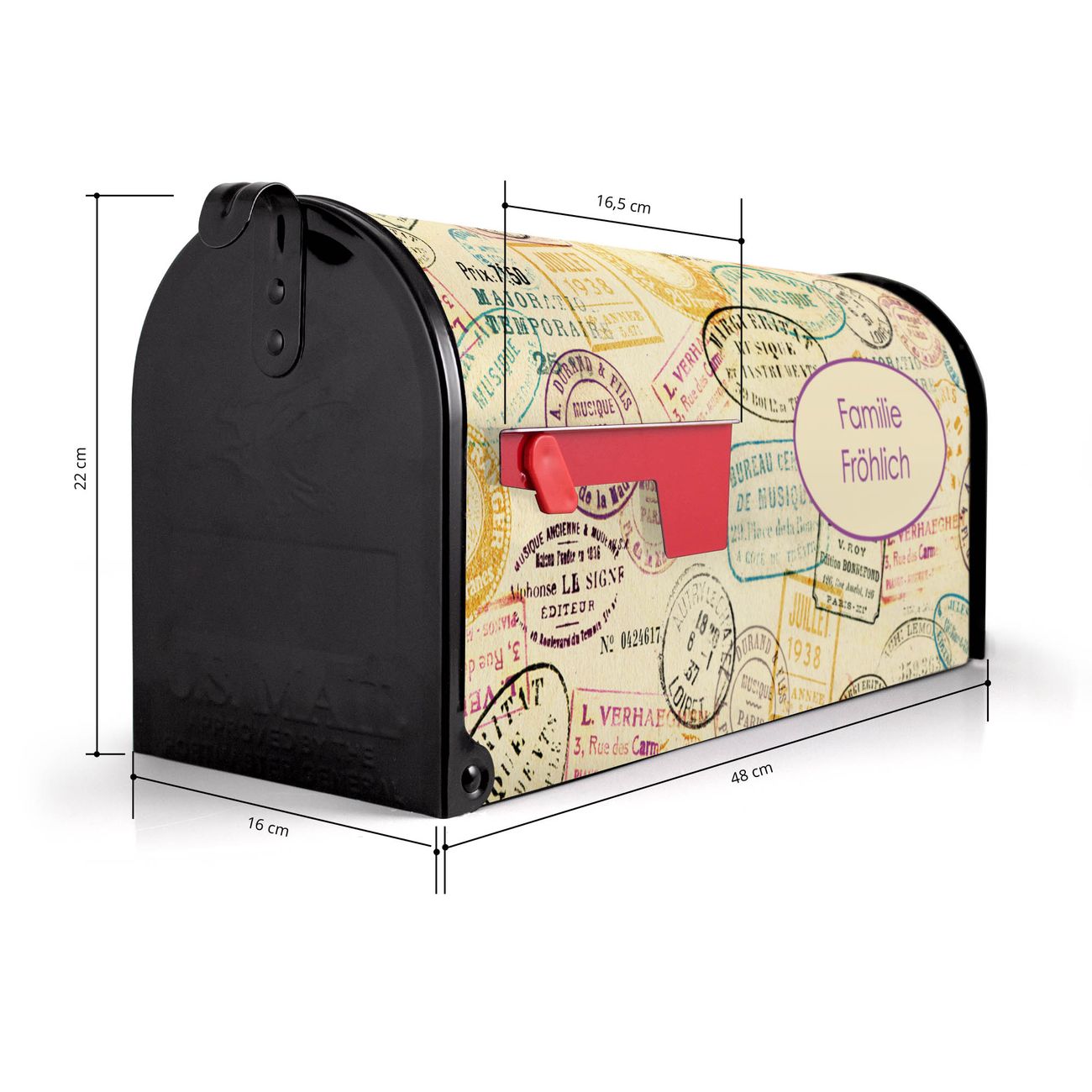 Der amerikanische Briefkasten von banjado mit Stempel Motiv bietet Ihnen ausreichend Fassungsvermögen, um große A4 Sendungen und Zeitschriften zu empfangen. Die typisch amerikanische rote Fahne zeigt Ihnen an, wenn Sie Post erhalten haben. Die US-Mailbox besteht aus verzinktem Stahlblech welches lackiert wurde und ist 48 x 22 x 16 CM (BxHxT) groß. Die Folie mit Motiv Stempel besteht aus einer wetter- und UV-resistenten Folie, die mit einem Schutzlaminat überzogen ist, sodass die US Mailbox zusätzlich vor Kratzern geschützt ist. An der Unterkante sind 4 Löcher je Seite um die Mailbox, typisch amerikanisch, an einem Holzpfahl oder einem Zaun zu befestigen. Auf Wunsch können Sie bei uns den passenden Standfuß oder die passende Wandhalterung kaufen um die US-Mailbox sicher zu befestigen. Wir bieten Ihnen ebenfalls Namensschilder, bereits beschriftet oder frei zu beschriften, und verschiedene selbst gestaltete Bitte-Keine-Werbung-Aufkleber.